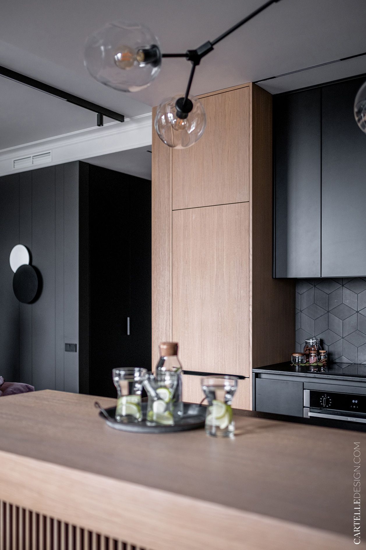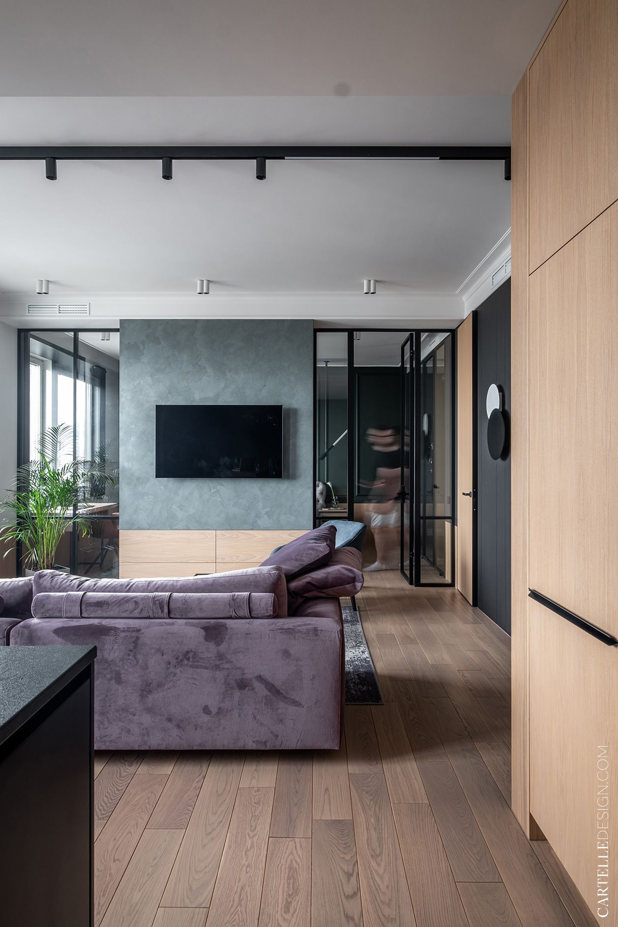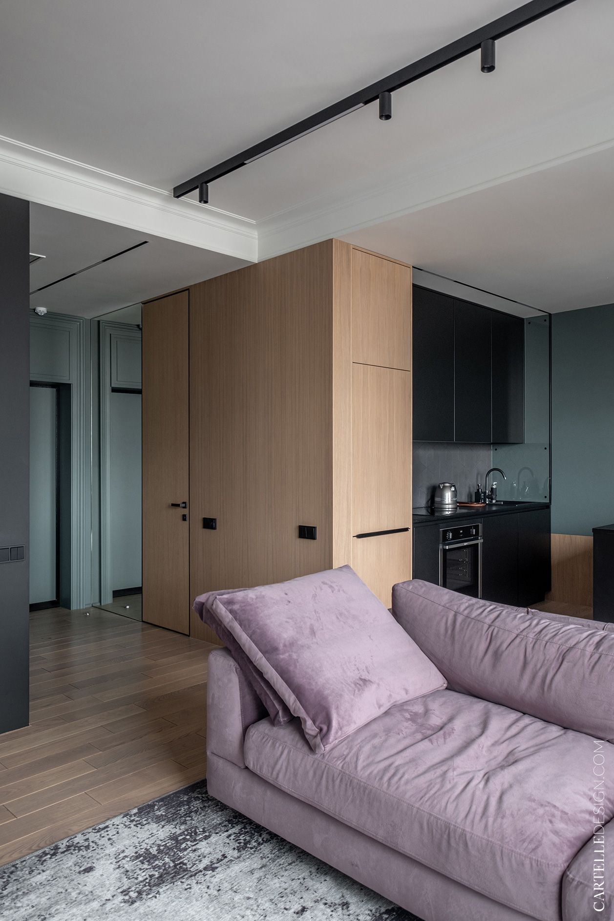 The project took about a year to complete. Despite the small area of the apartment, there were many complex components in the project. The wood panels on the walls had to be installed exactly in line with the top of the wall. Provide good waterproofing for glass partitions, because behind one of them is a shower. In addition, the project has a lot of built-in furniture, which required well-coordinated work of builders and furniture makers. But despite all the difficulties, we managed to fully implement our plans. The owners of the apartment are happy, and we are doubly happy.