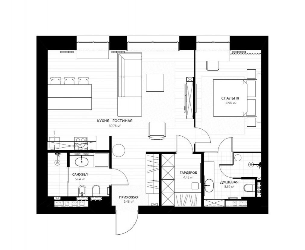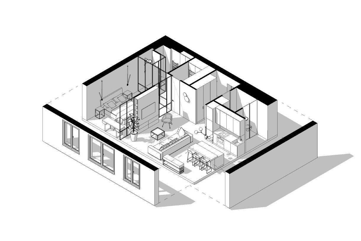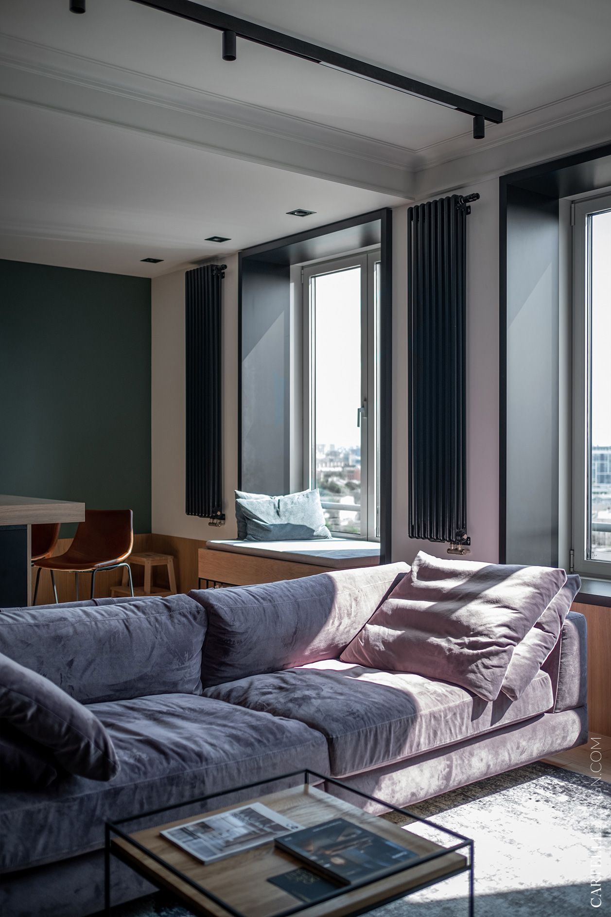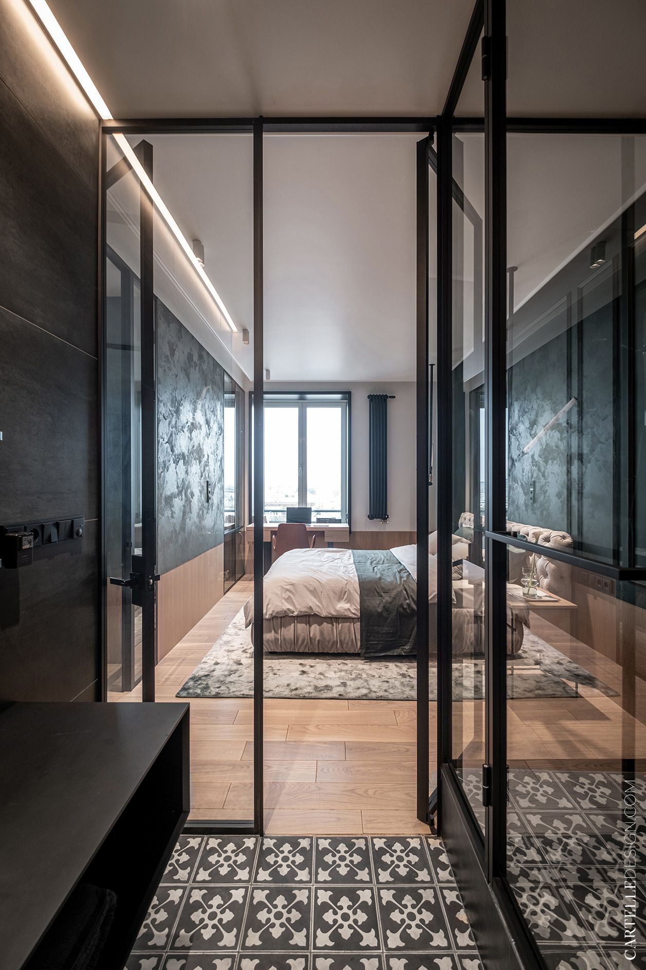 One-bedroom apartment in Moscow for a couple. The main feature of the project is a single space of the living room, bedroom and shower room, separated by glass loft partitions. The apartment is not intended for permanent residence. Therefore, we took this bold step in order to create a modern and stylish home, where the owners can live comfortably and with pleasure during their frequent business trips to Moscow.