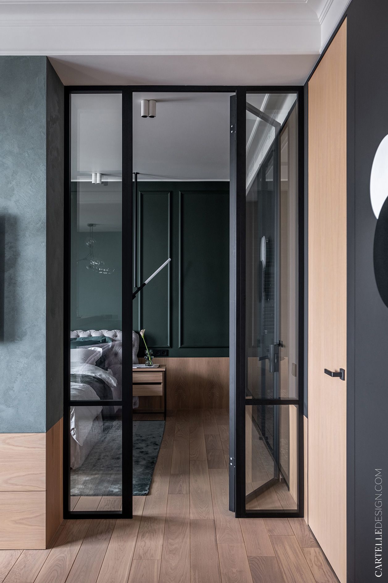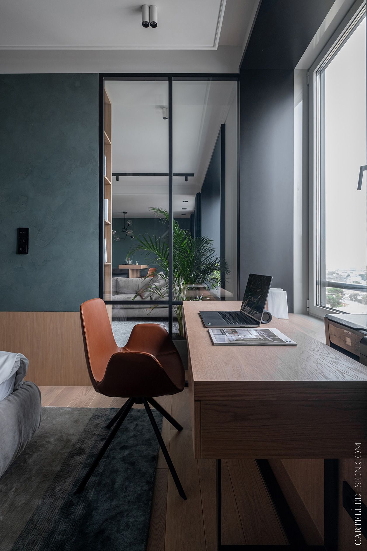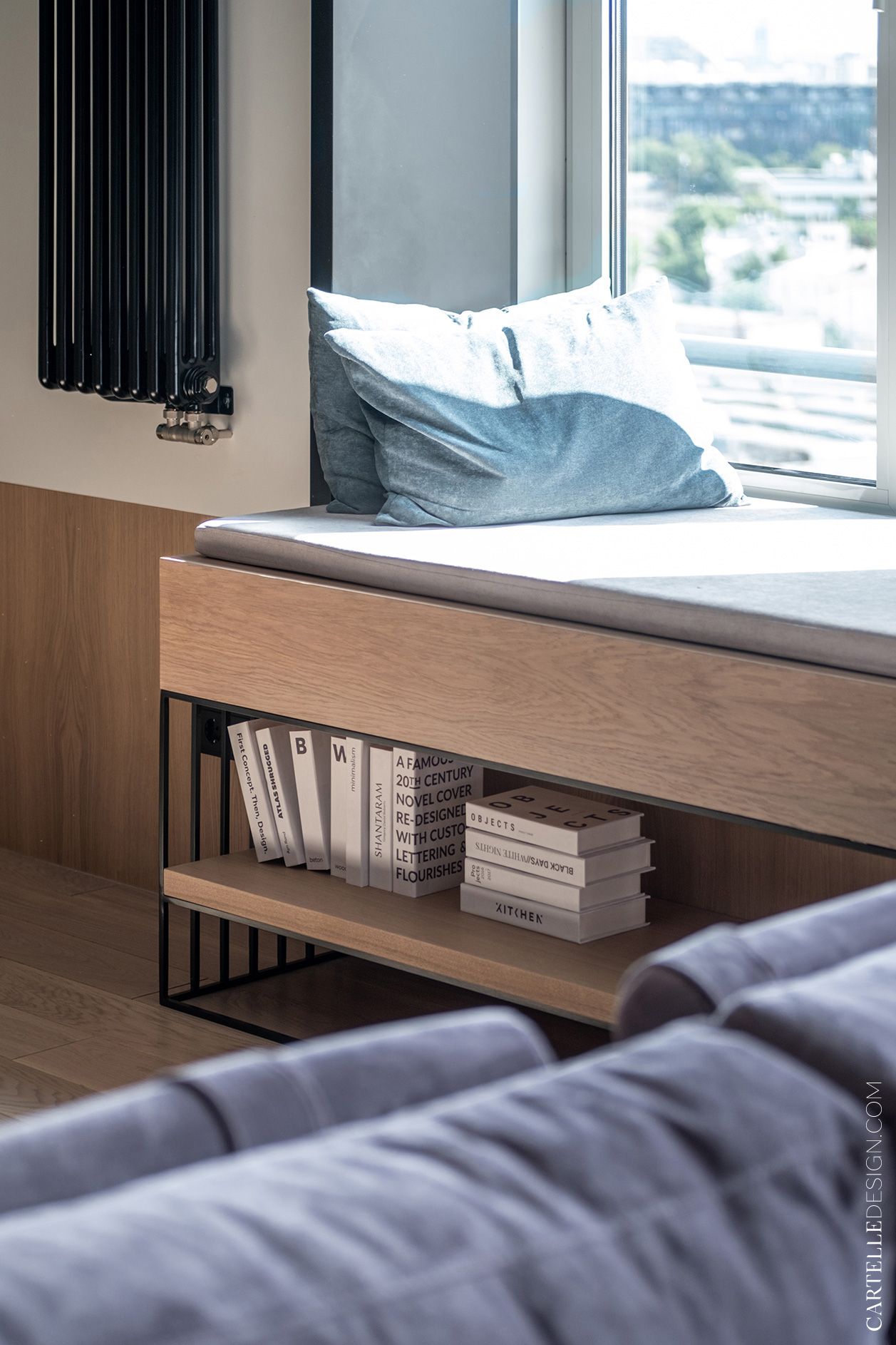 An apartment with a non-standard purpose required a non-standard approach. We tried to avoid the classic “roomy” layout and create an interesting space. This was done thanks to glass loft partitions. They separate the living room from the bedroom and the bedroom from the shower room, which creates a sense of one space.