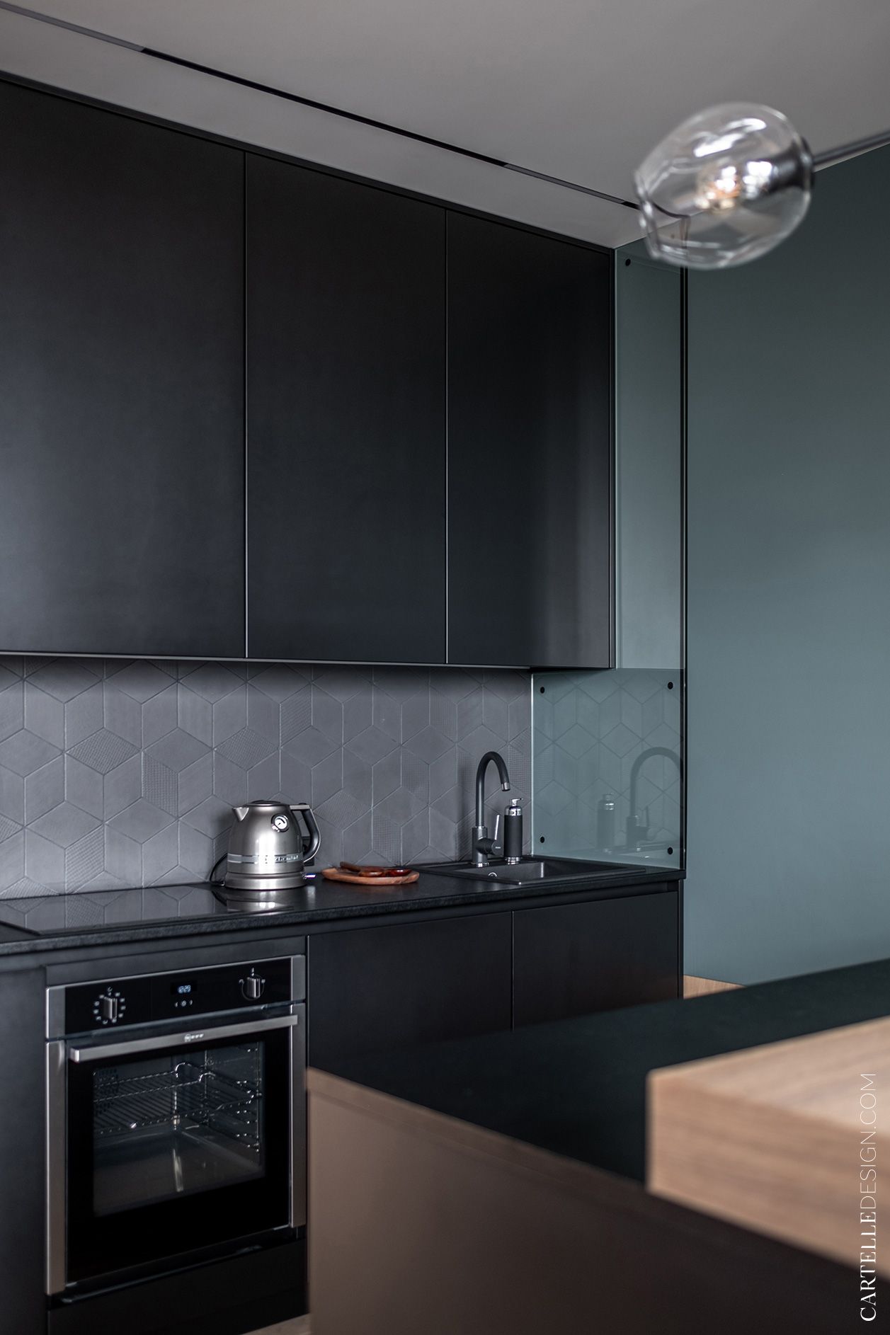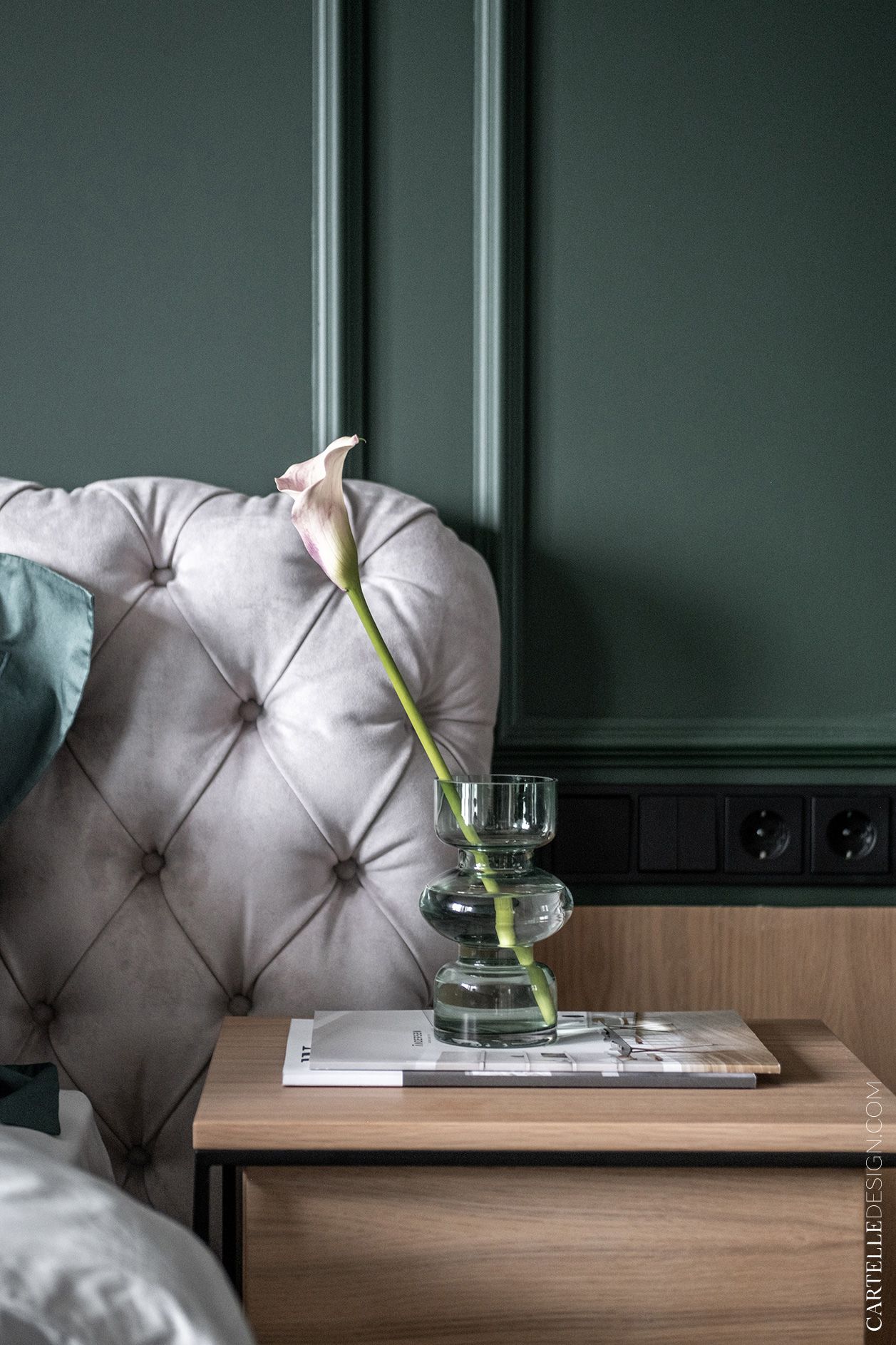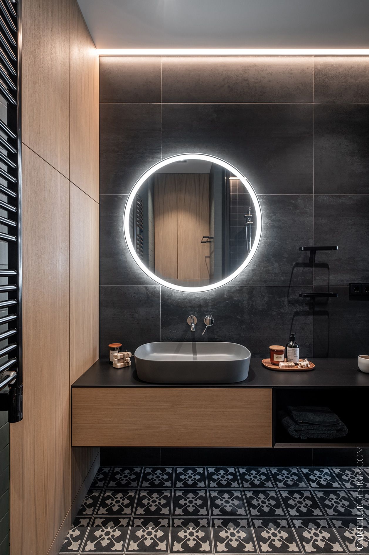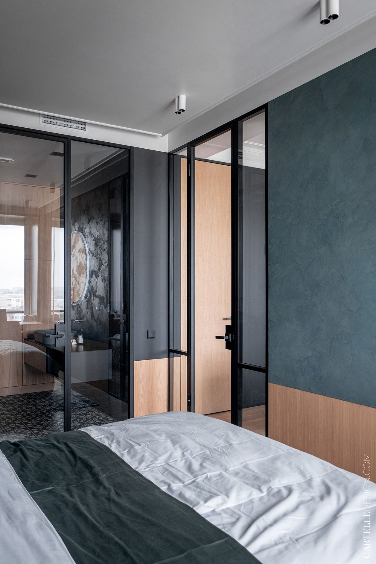 A special atmosphere of the project is created by dark, enveloping tones, an abundance of natural materials and complex color schemes - everything we love. Painting prevails in wall decoration. Textured plaster is used on the partition between the bedroom and the living room. Shower rooms combine tiles of different colors, sizes and textures, including custom-made patterned cement tiles.