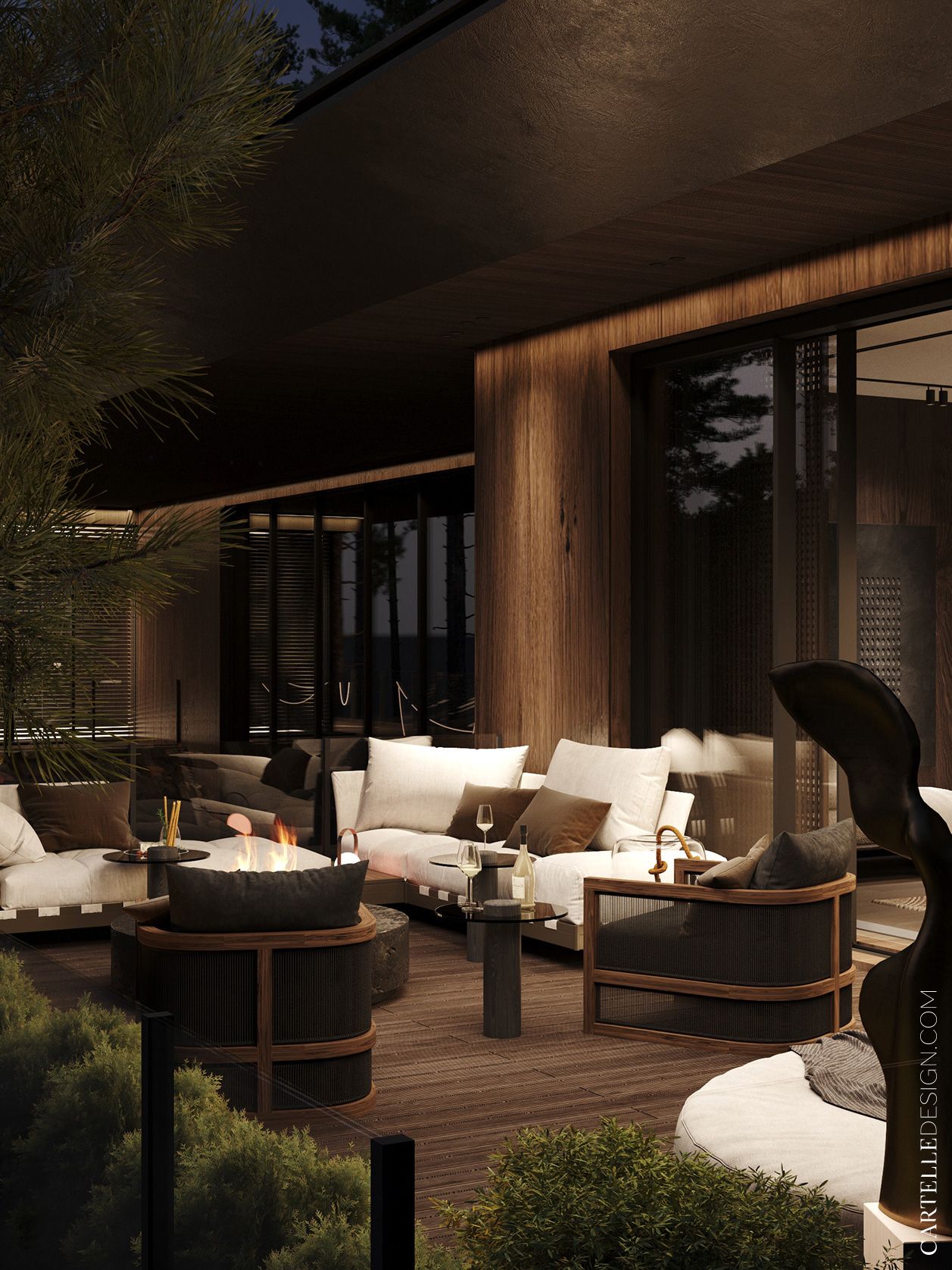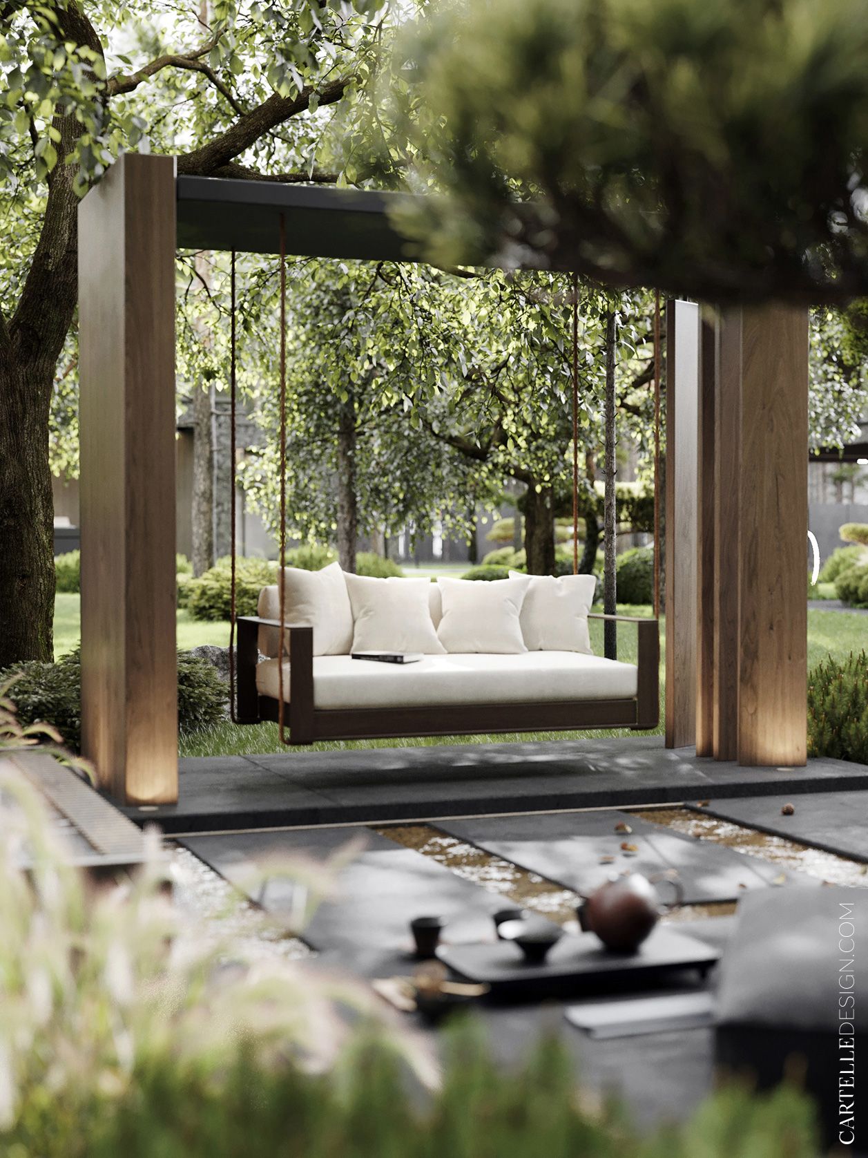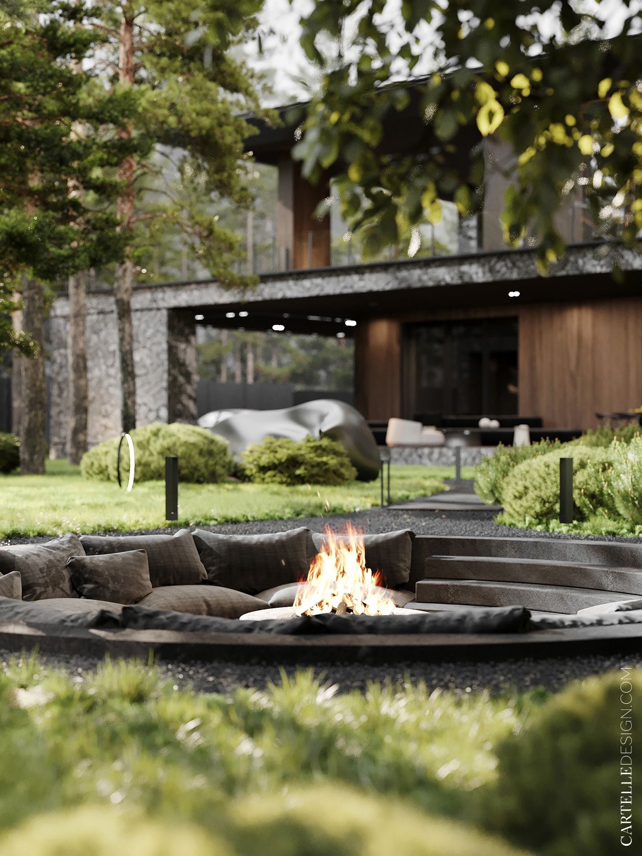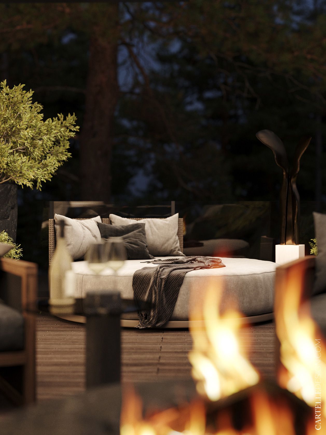 For this project, we also worked on the exterior. Along the inside of the house there is a terrace, on which we have placed several areas for relaxation with sun loungers, armchairs and a table. In the center of the plot there is a fire zone with a soft round sofa. And in the corner of the site - a cozy corner with a garden swing and a fountain.