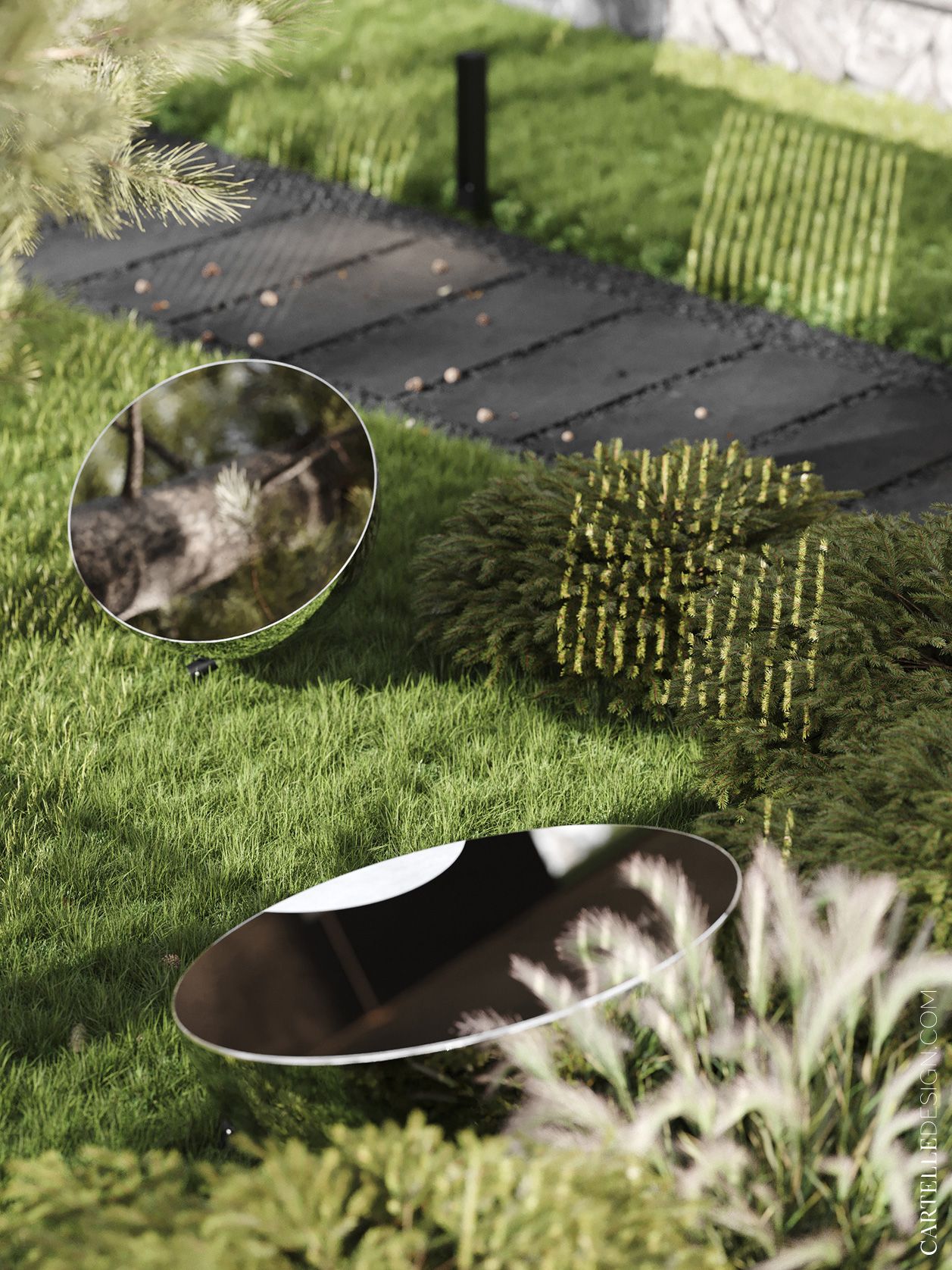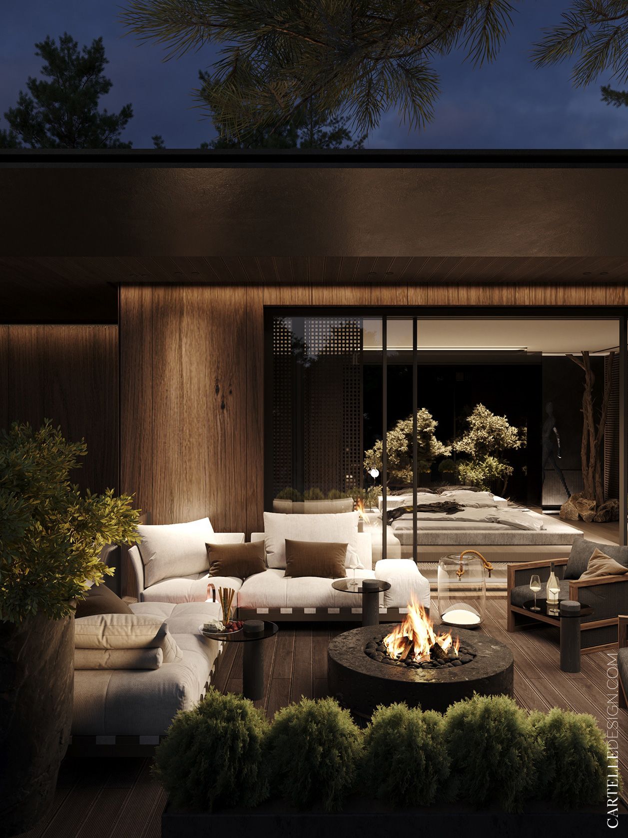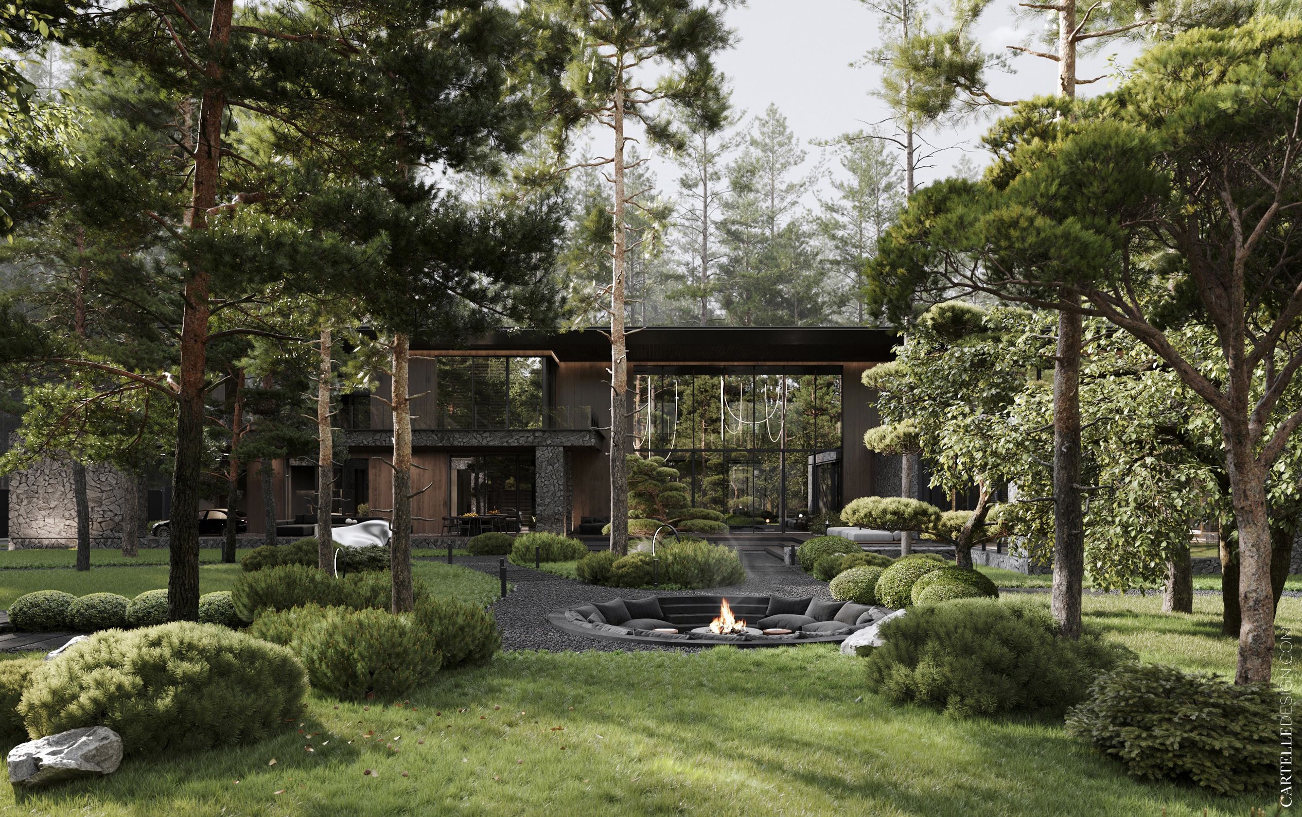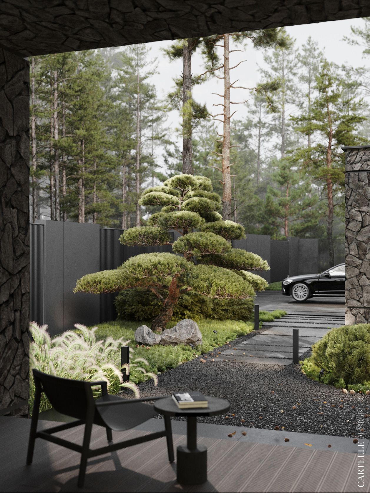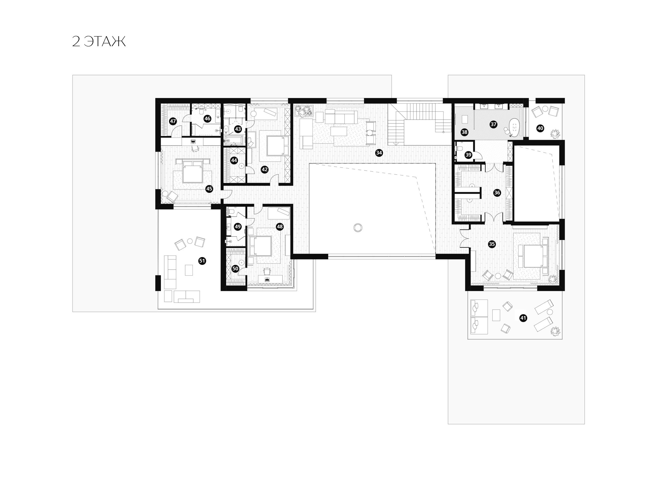 For this project, we also worked on the exterior. Along the inside of the house there is a terrace, on which we have placed several areas for relaxation with sun loungers, armchairs and a table. In the center of the plot there is a fire zone with a soft round sofa. And in the corner of the site - a cozy corner with a garden swing and a fountain.