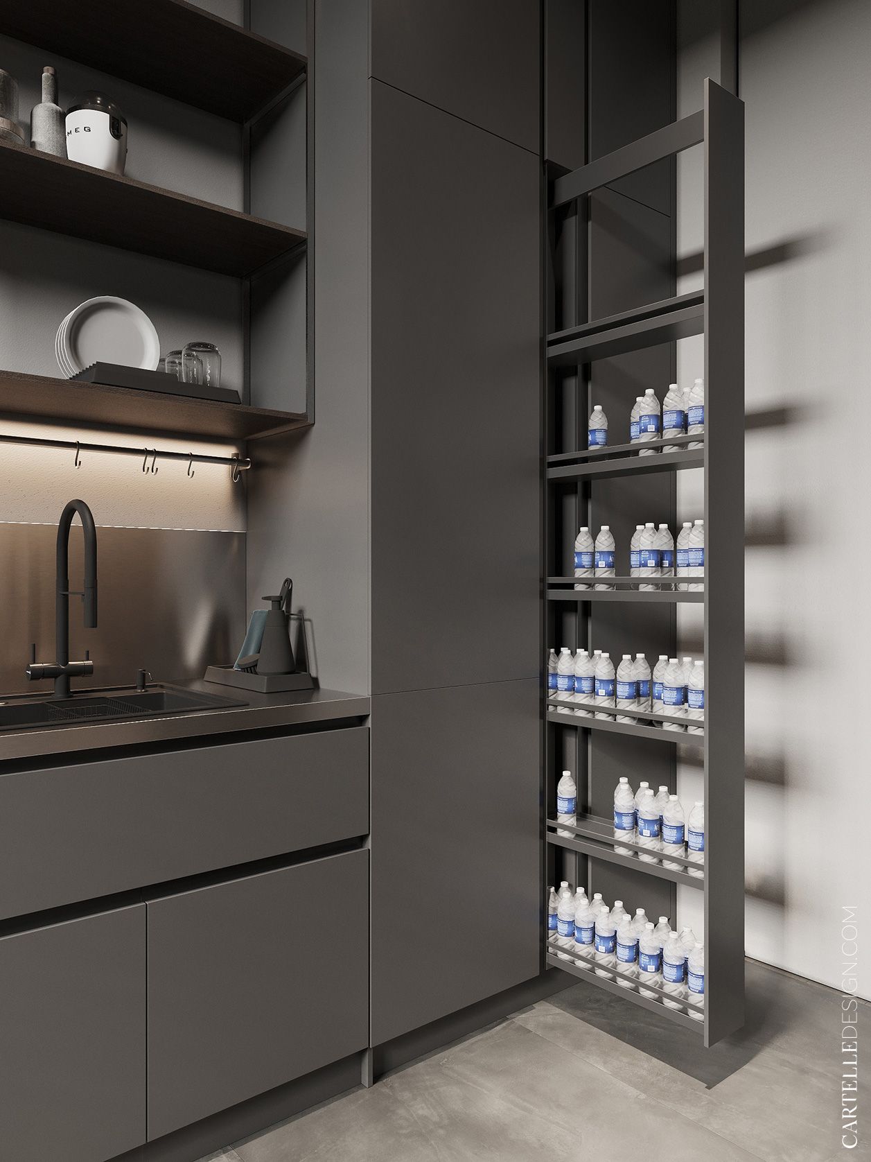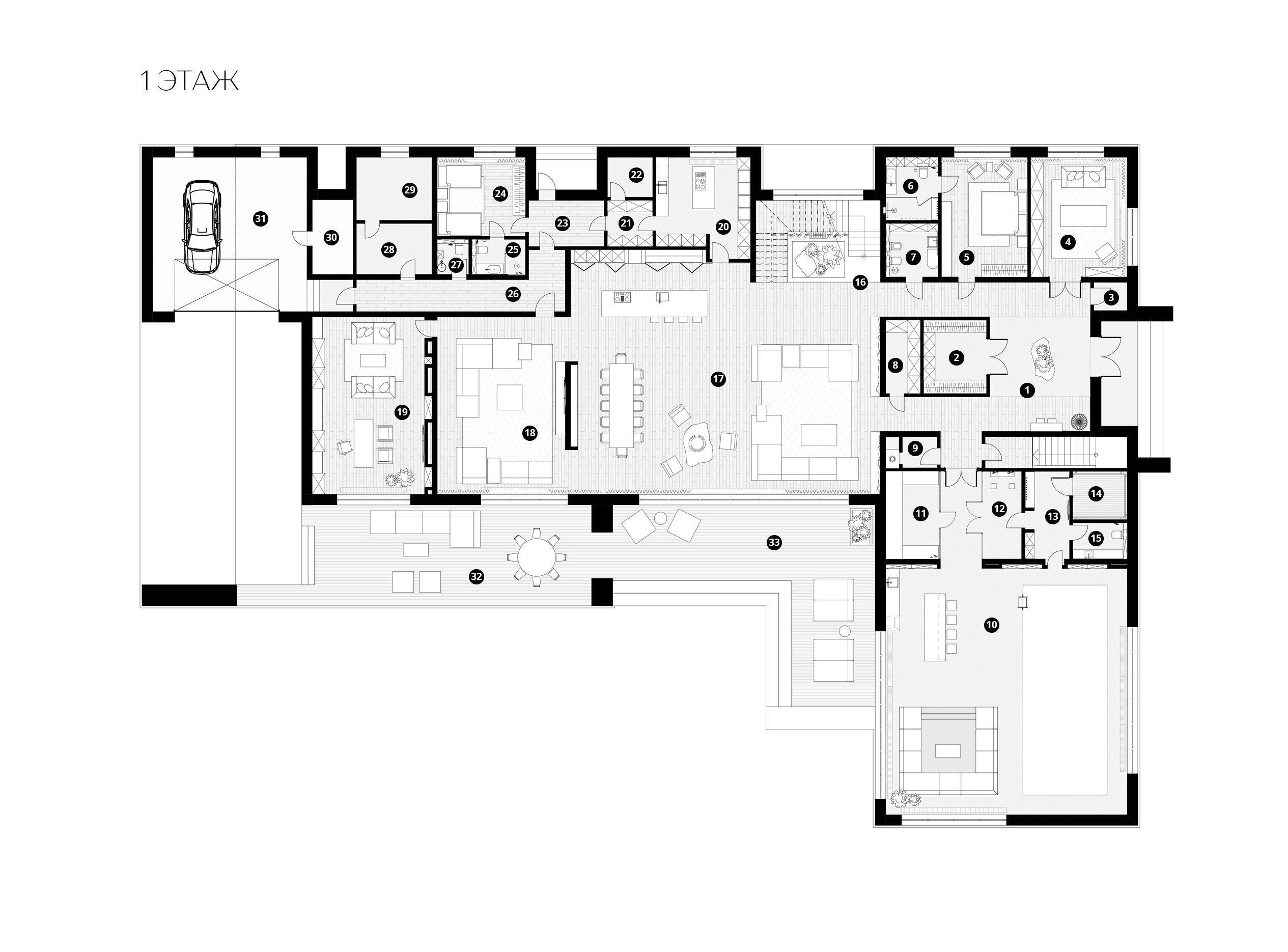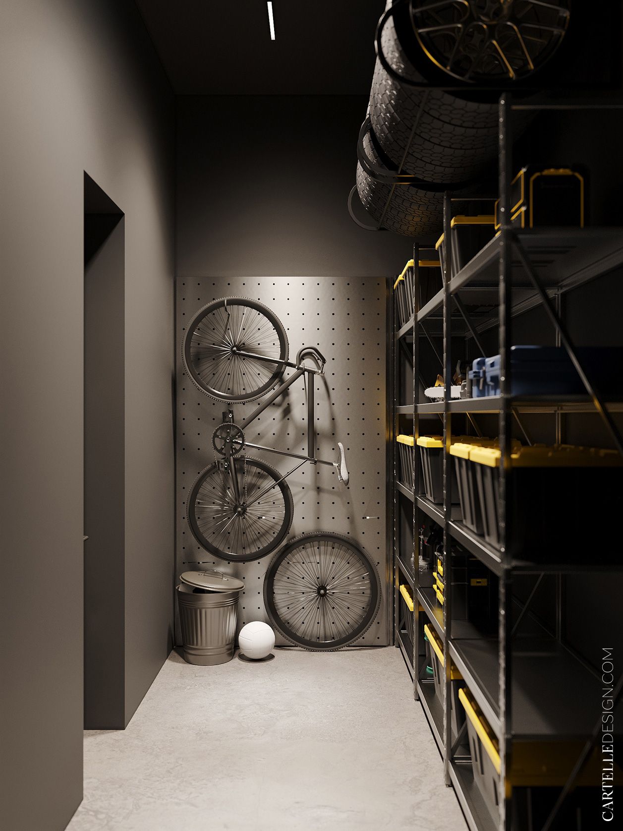 The main advantage of a country house compared to an apartment is a large area. Thanks to it, you can provide many different functional areas that will make life more comfortable. Behind the living room is a second kitchen with a spacious pantry. The house also has a garage and space for storing auto accessories. And on the ground floor there is a gym, laundry room, wine cellar and additional storage space.