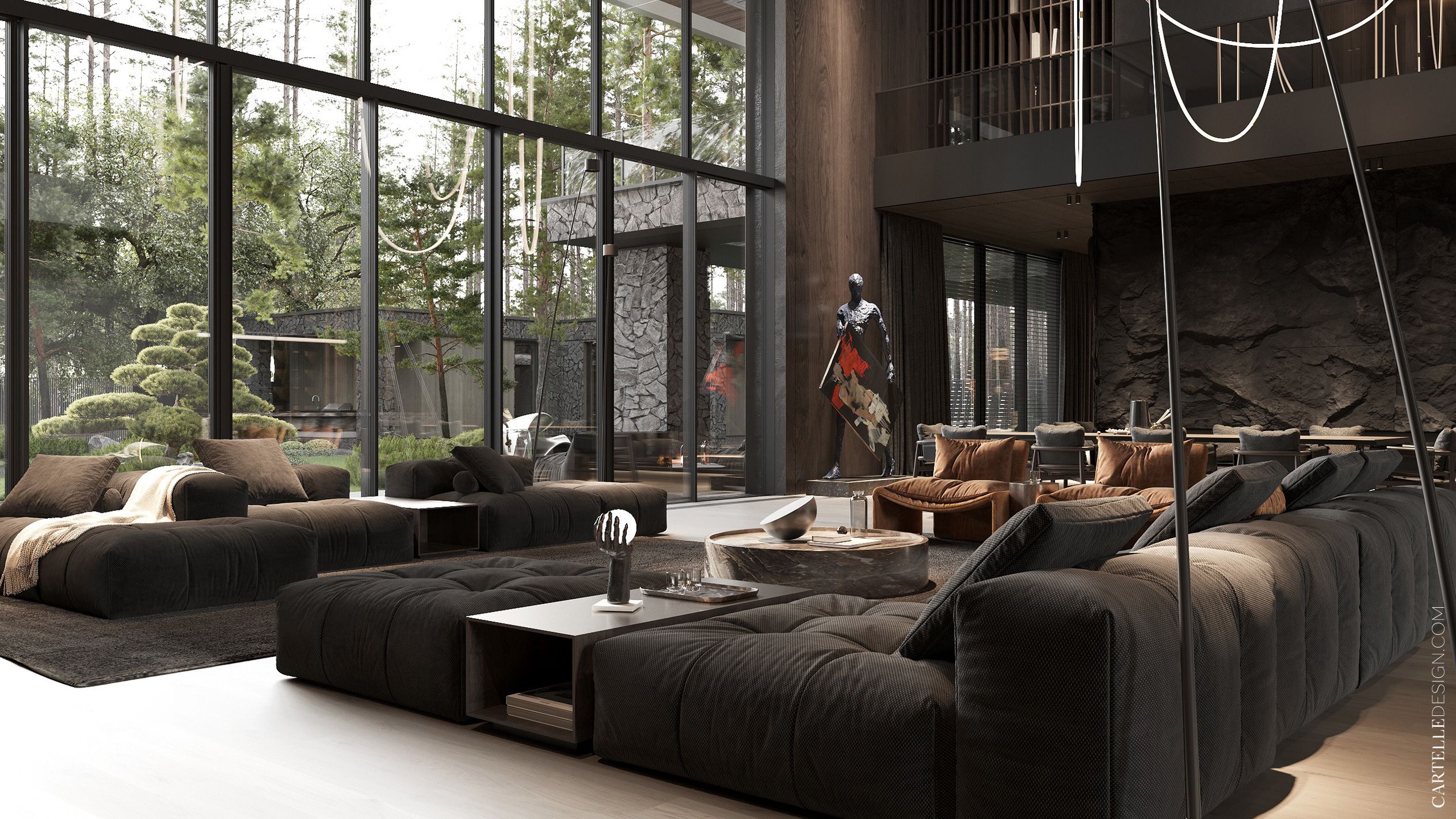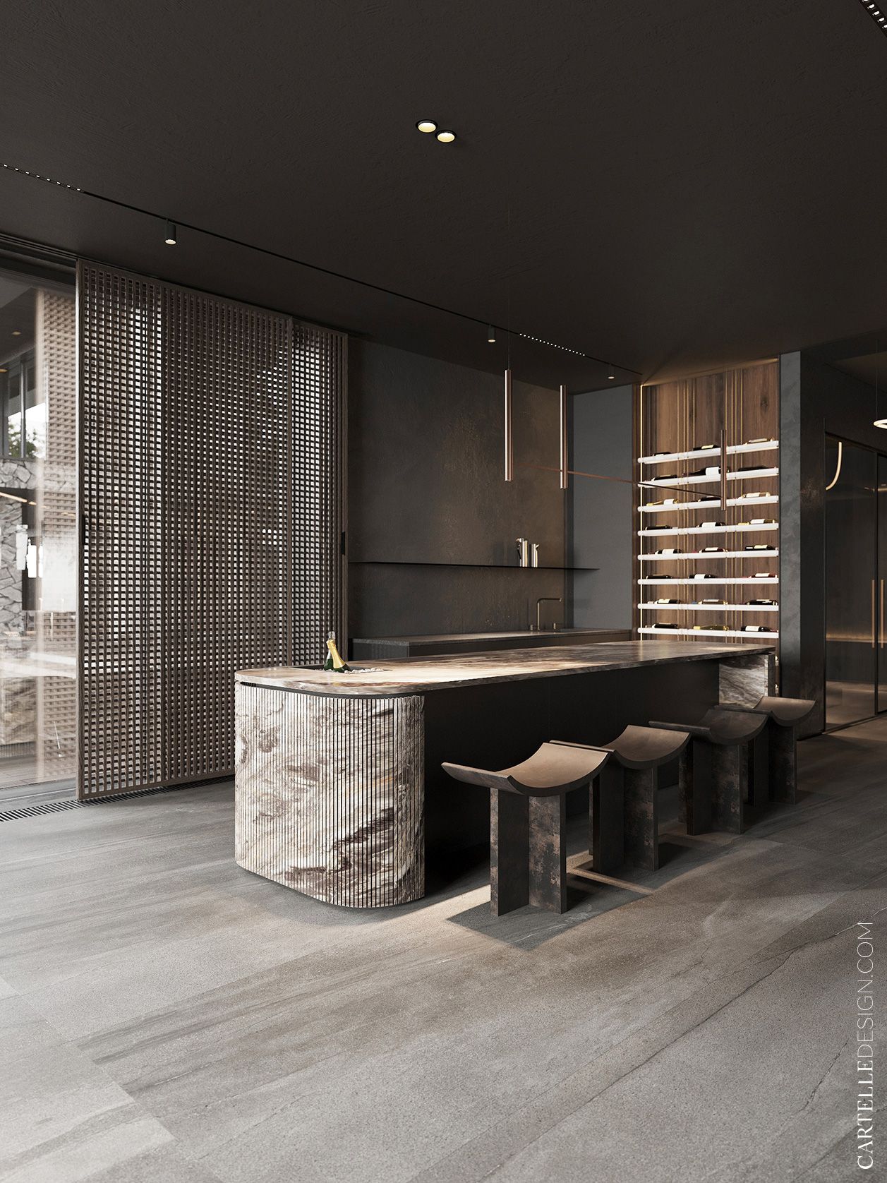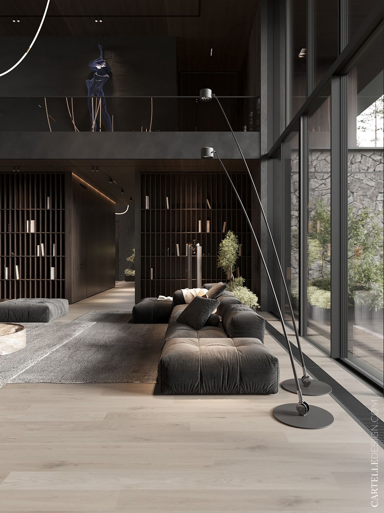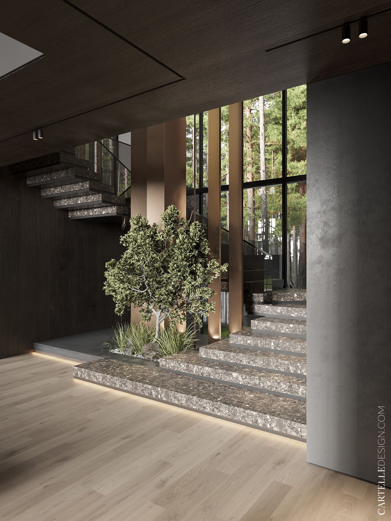 INVICTUS is a project of a large house for permanent residence of a family. The house is located in a beautiful place among the pine forest. We were faced with the task of creating a cool brutal interior that would look expensive, stylish, timeless, but which would be cozy and comfortable. We ended up with a deep dark interior filled with warm (in tone and tactility) materials, art objects and accent lighting.