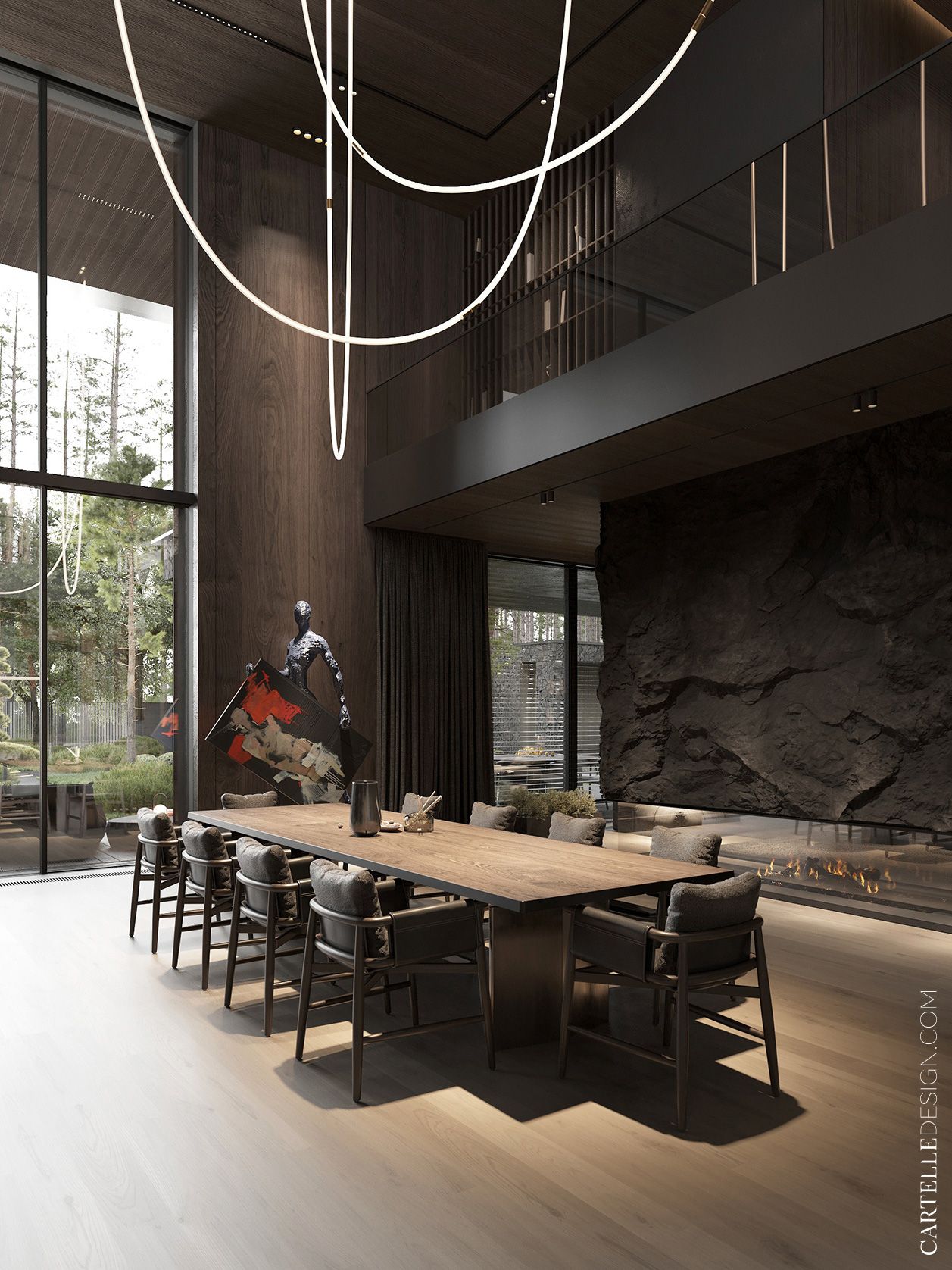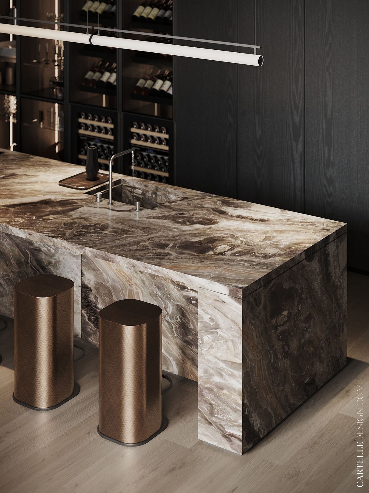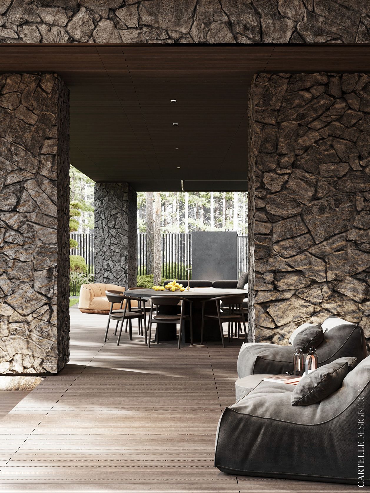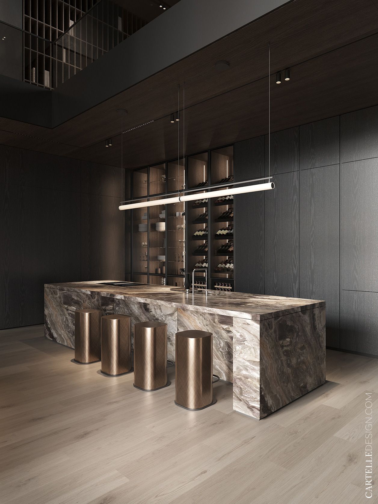 INVICTUS is a project of a large house for permanent residence of a family. The house is located in a beautiful place among the pine forest. We were faced with the task of creating a cool brutal interior that would look expensive, stylish, timeless, but which would be cozy and comfortable. We ended up with a deep dark interior filled with warm (in tone and tactility) materials, art objects and accent lighting.