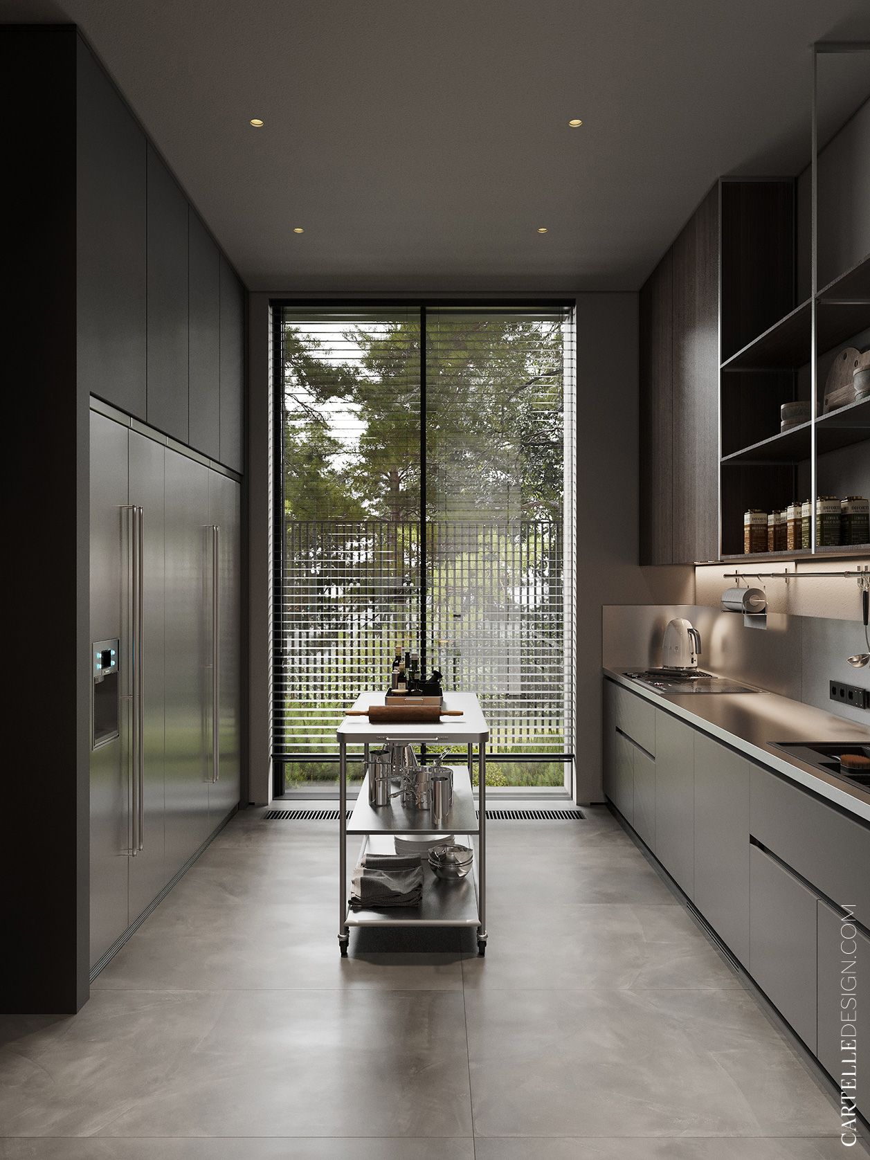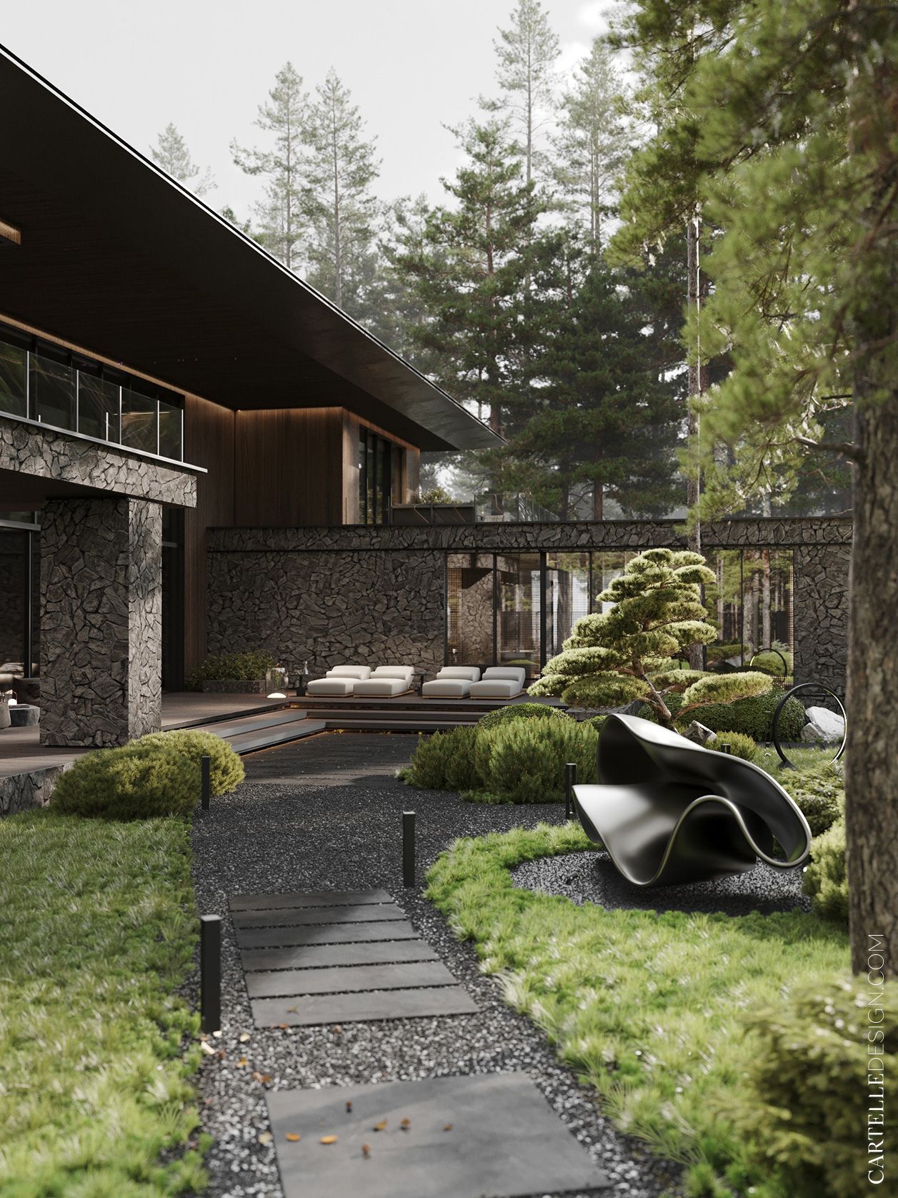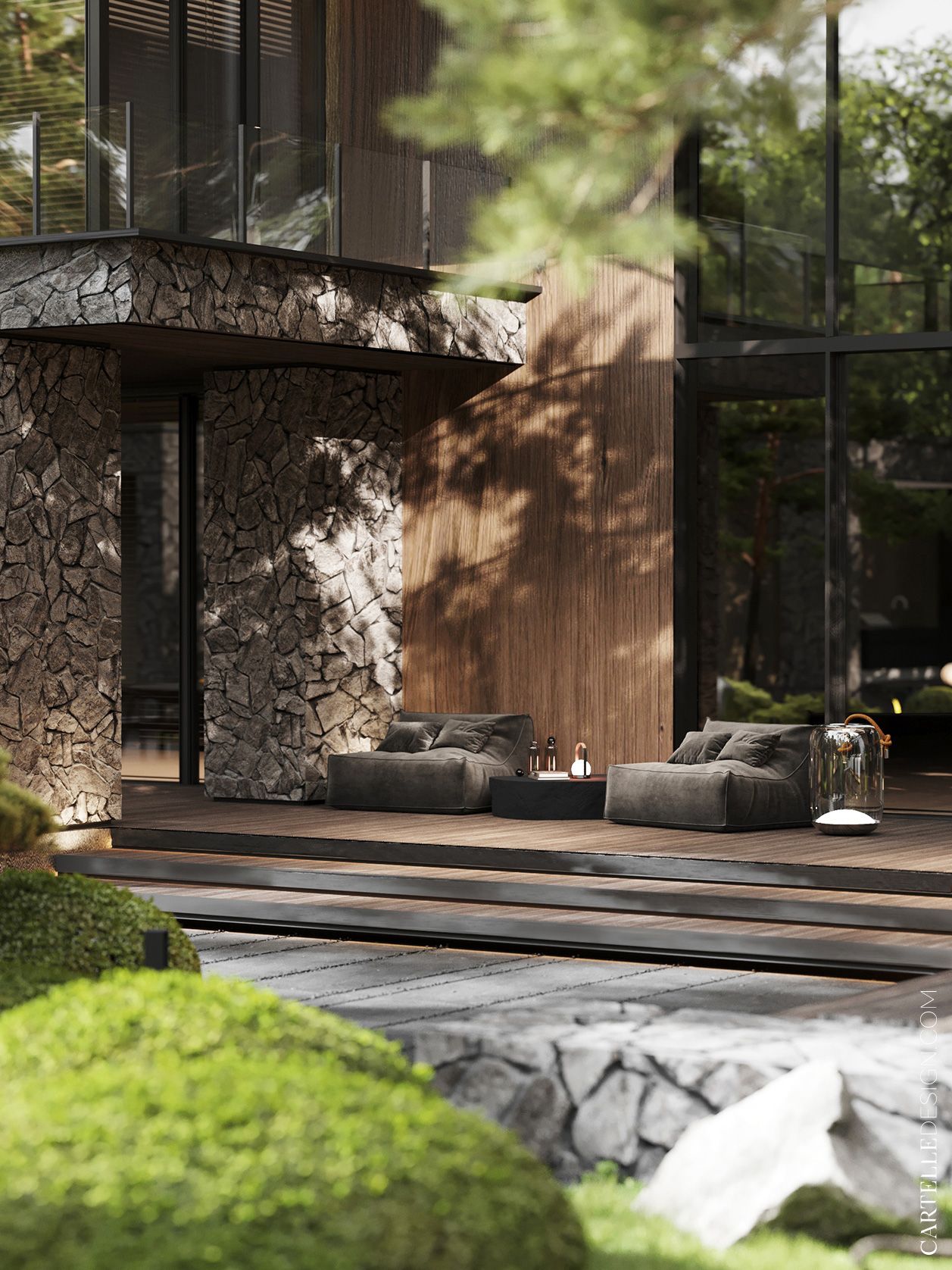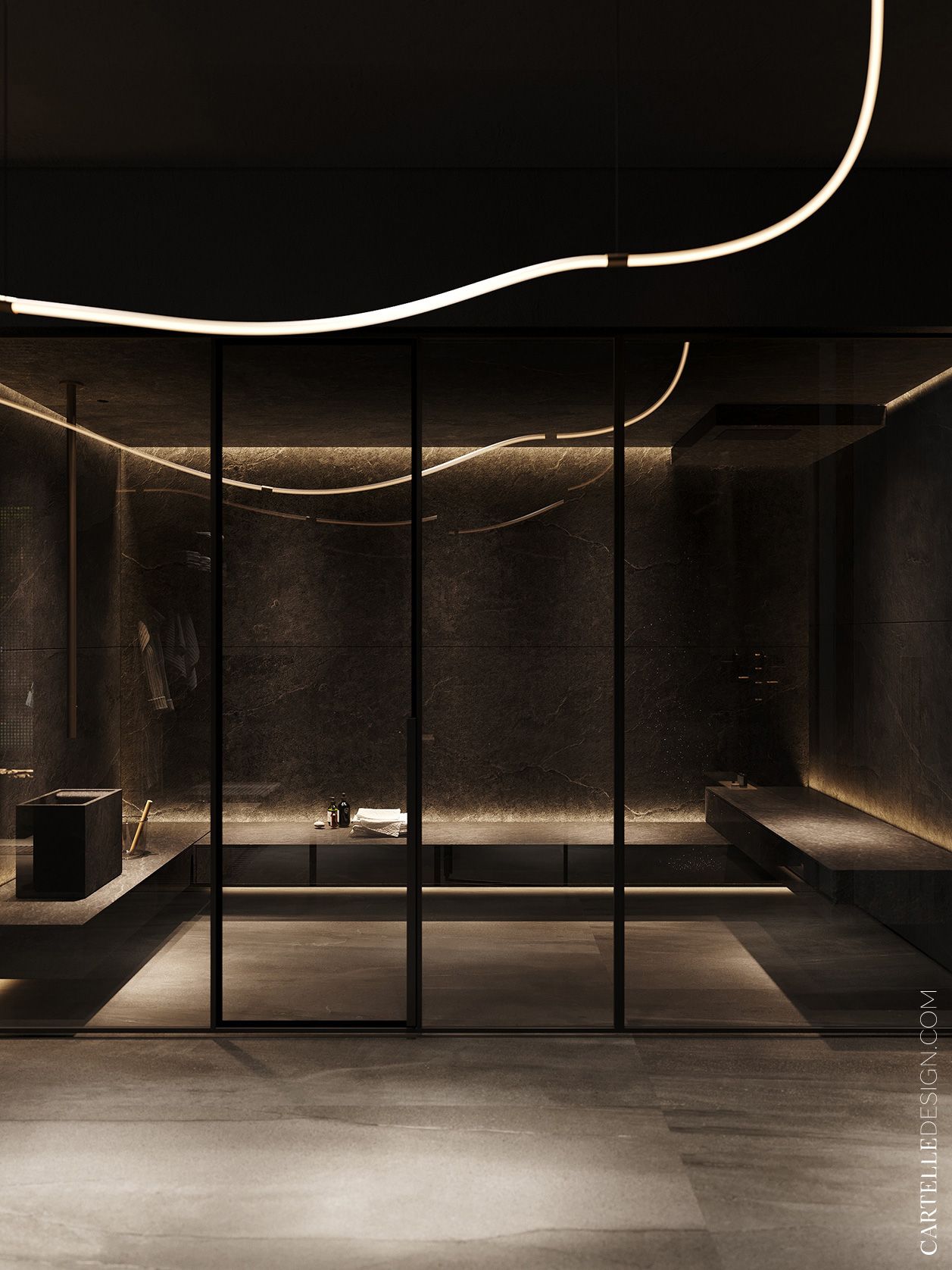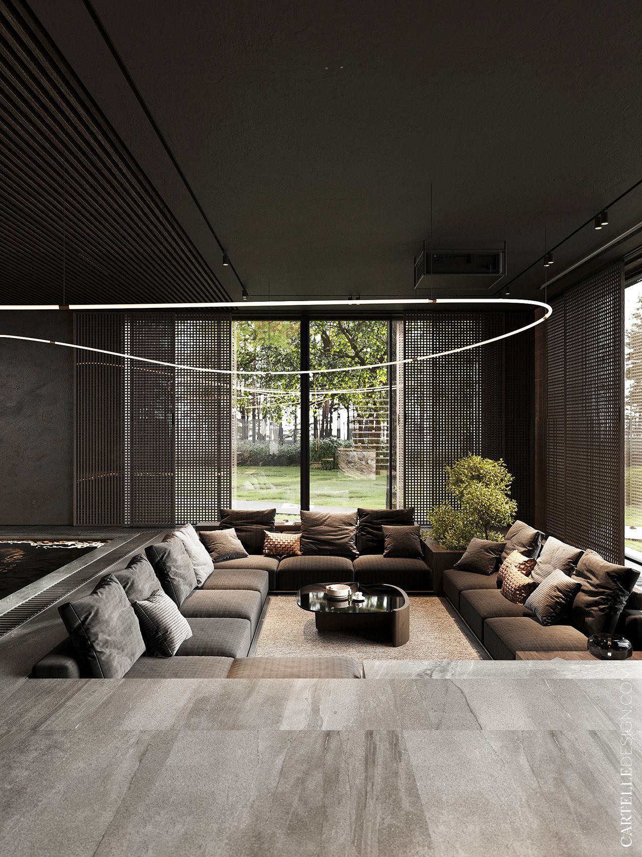 INVICTUS is a project of a large house for permanent residence of a family. The house is located in a beautiful place among the pine forest. We were faced with the task of creating a cool brutal interior that would look expensive, stylish, timeless, but which would be cozy and comfortable. We ended up with a deep dark interior filled with warm (in tone and tactility) materials, art objects and accent lighting.