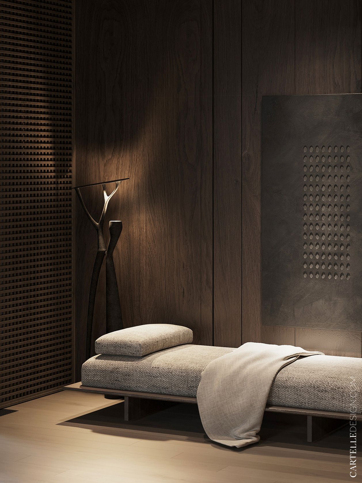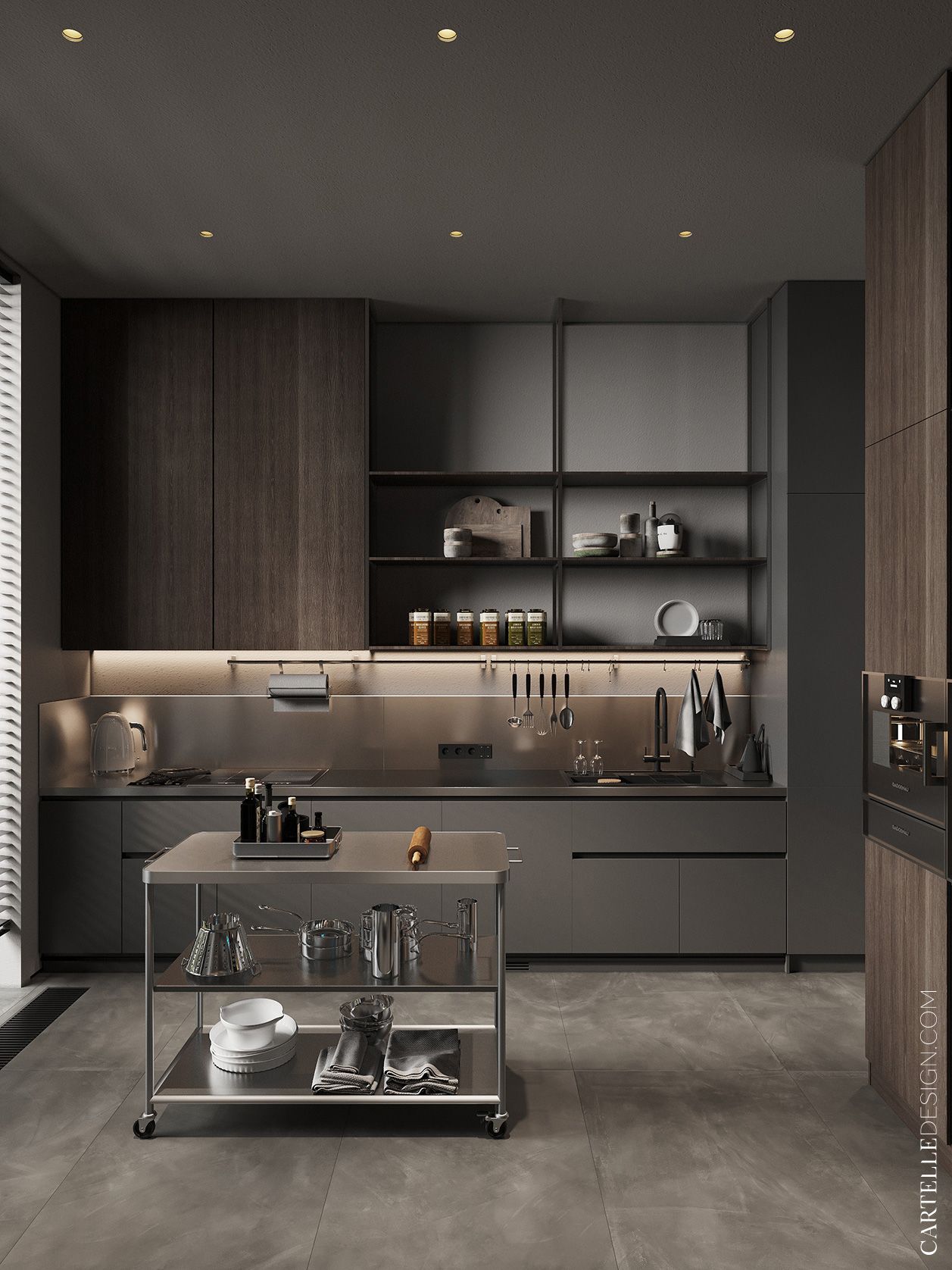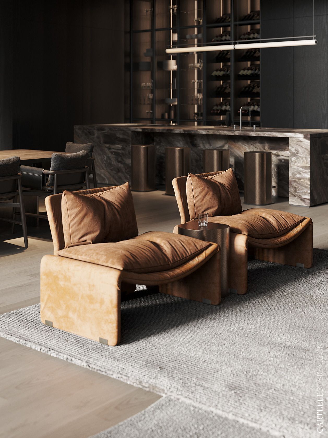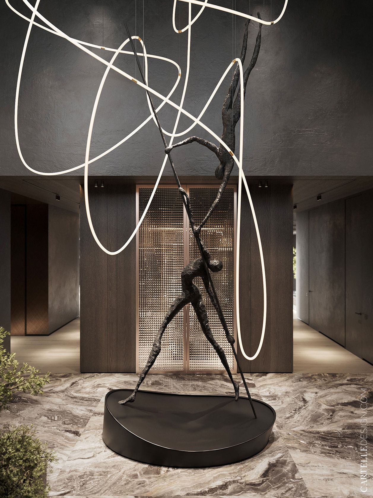 INVICTUS is a project of a large house for permanent residence of a family. The house is located in a beautiful place among the pine forest. We were faced with the task of creating a cool brutal interior that would look expensive, stylish, timeless, but which would be cozy and comfortable. We ended up with a deep dark interior filled with warm (in tone and tactility) materials, art objects and accent lighting.