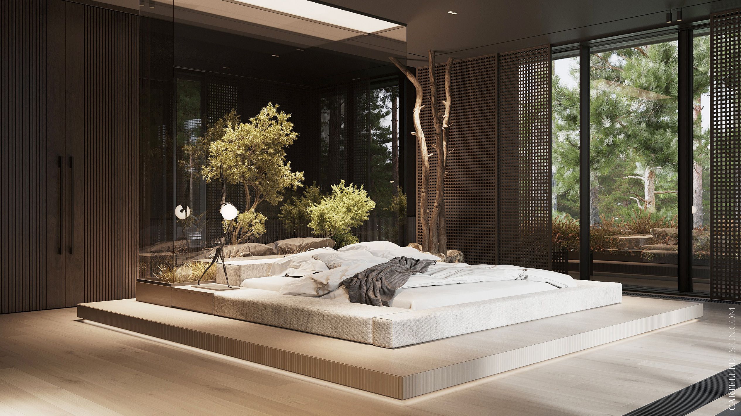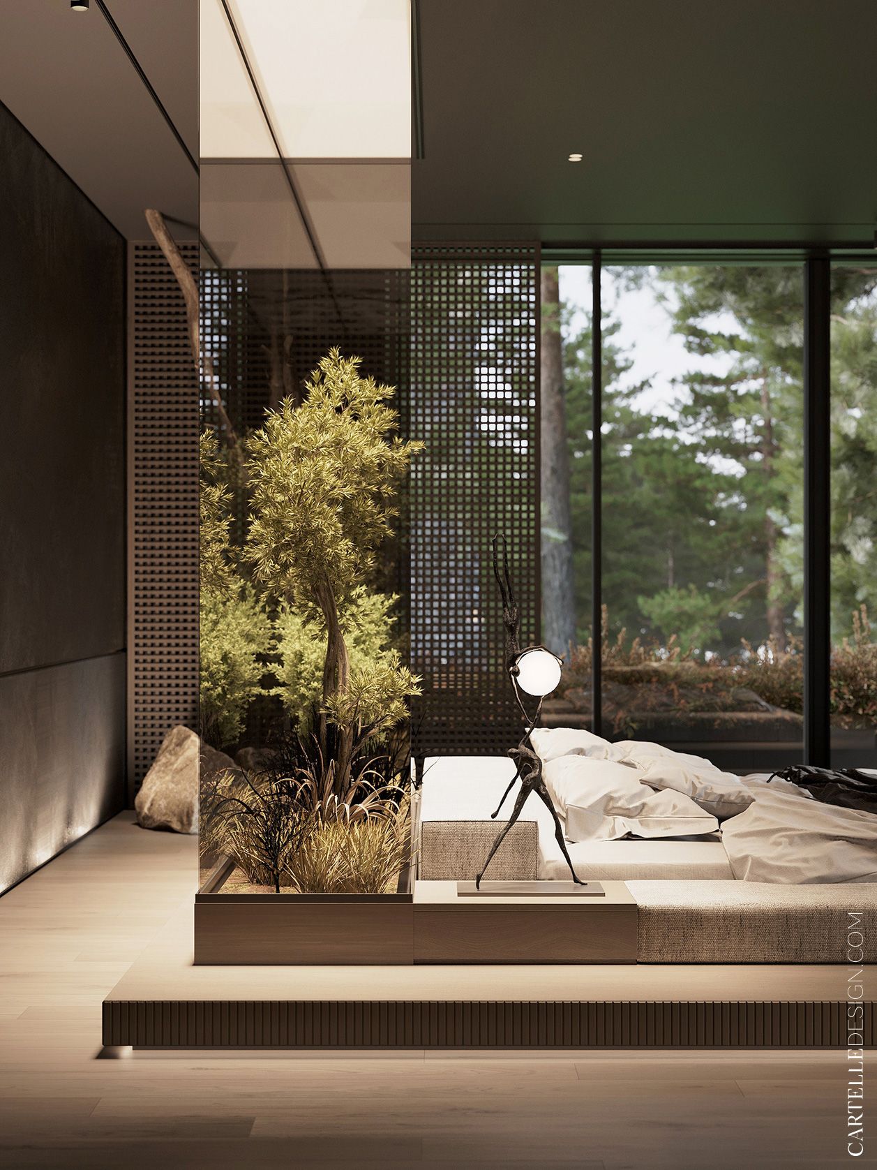 The master bedroom occupies the entire right wing of the house. In a single private space there is a bedroom, a double dressing room, a bathroom and a terrace. The same motifs are repeated in the interior of the bedroom - deep colors, wood and plants. In the second wing of the house there are three children's rooms, each with its own dressing room and bathroom. Another guest bedroom is located on the first floor.