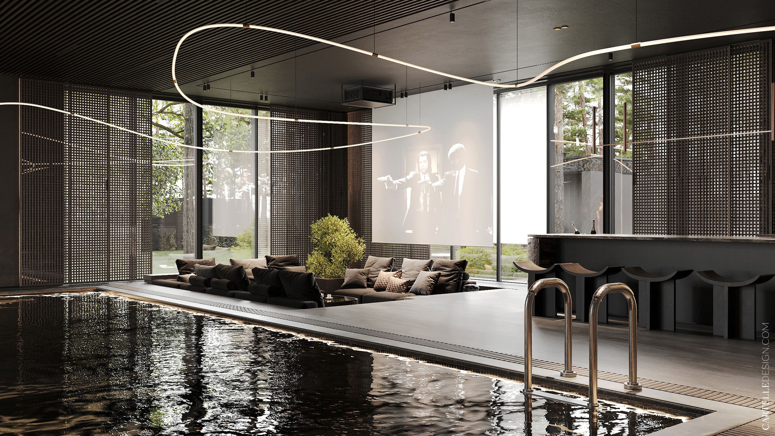 The spa area is located on the first floor of the house. In the main room there is a 10 meter swimming pool, a sofa with a video projector and a small bar with a marble island. The interior of the spa repeats the motifs common to the home - dark colors and stone. No colored tiles and bright colors - only darkness and enveloping warm light that will help you relax.