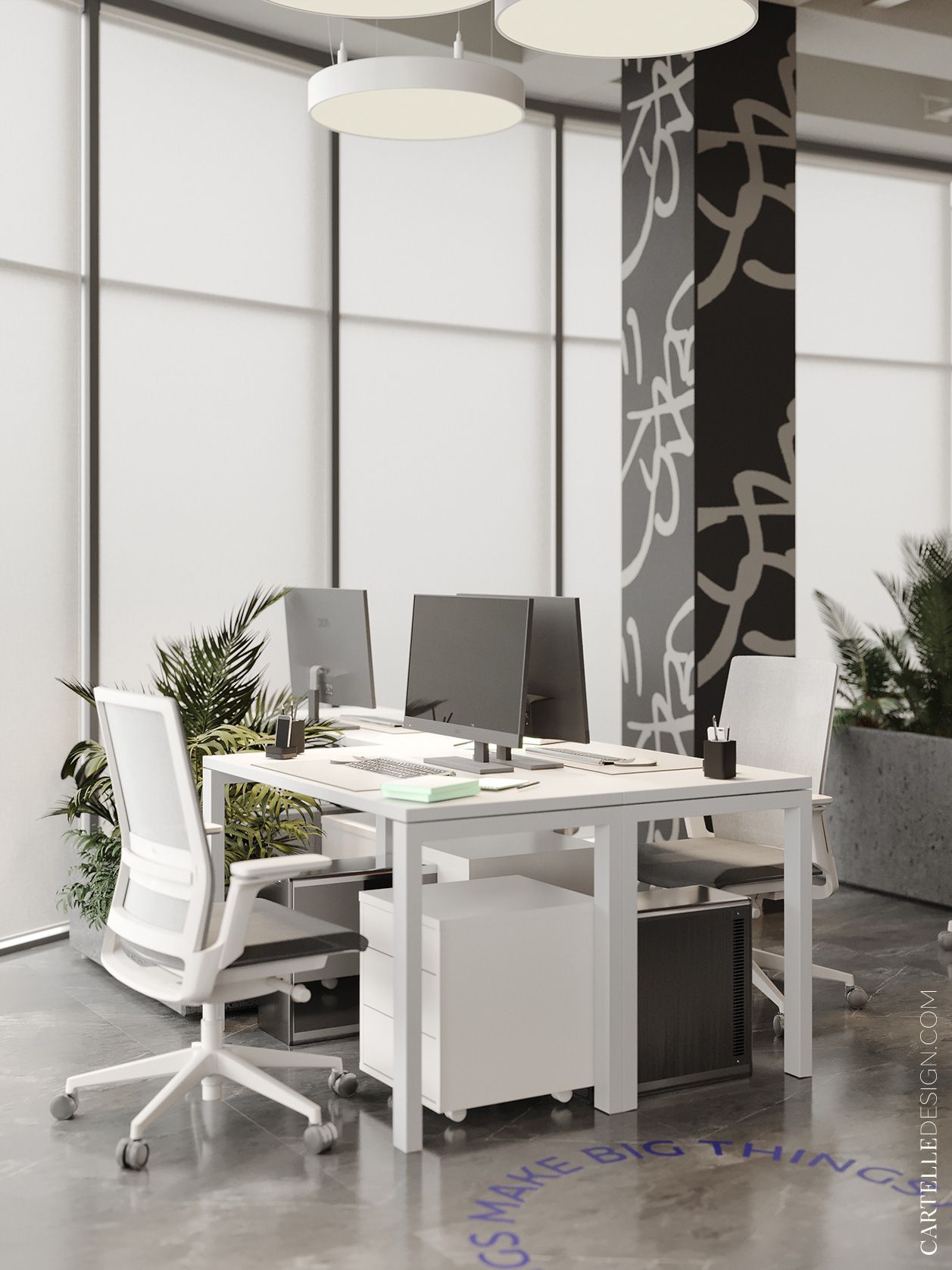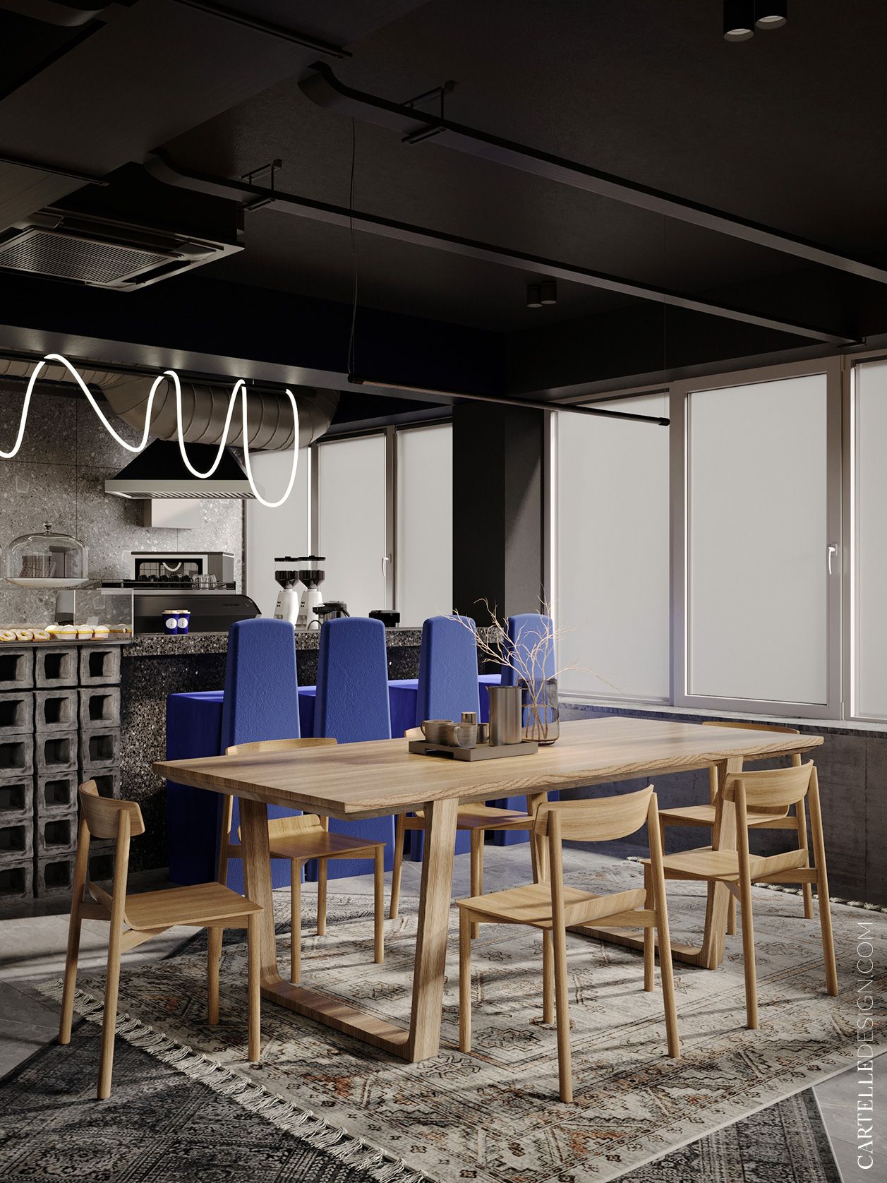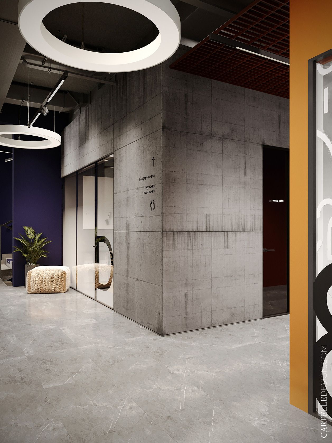 The third branch of the DELO coworking space. We were inspired by the aesthetics of the first coworking space, but tried not to copy the project. Some elements are repeated here - concrete surfaces, simple geometric shapes, a combination of calm colors with accent colors. But due to more saturated colors and graphic elements, the interior turned out to be less strict and more creative.