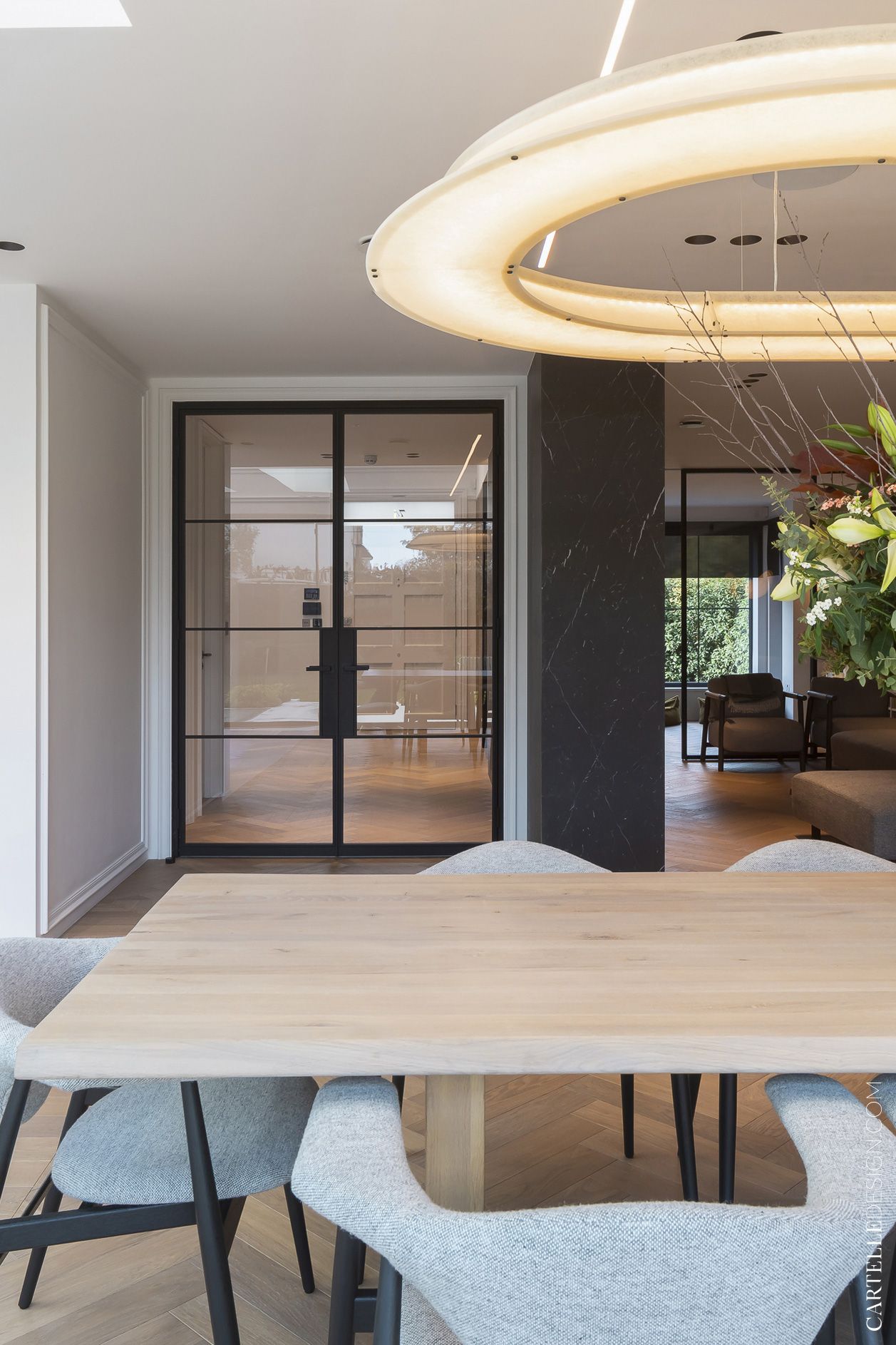 Interior items were selected in accordance with the overall design of the project. The furniture is modern and laconic. All rooms are spacious and not overloaded with details. The most interesting detail in every room is the lamps. Above the dining table Cast Pendant Oblong by Resident. Above the Hubble Baxter kitchen island. Akari Light Sculptures in the living room. In the hallway - Wireline Flos. On the basement floor, Kepler by Cohda in the bedroom and Mira Davide Groppi stretcher in the gym.