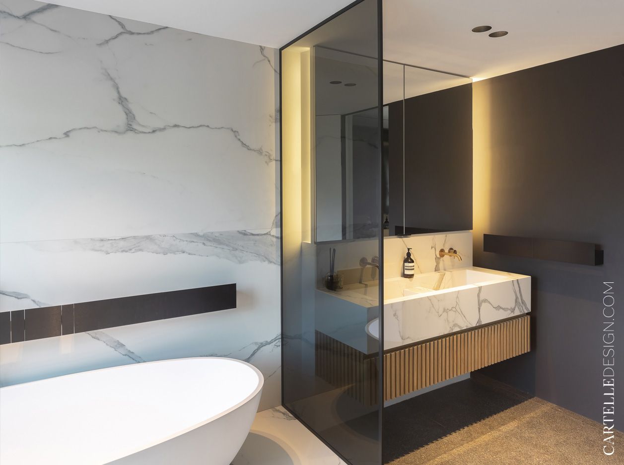 The project has a neutral color scheme, which is dominated by natural colors. Light rooms alternate with dark ones, warm zones with cold ones. In bright areas - monochrome colors are combined with the color of natural wood and marble. In the dark, a complex deep shade of blue predominates.