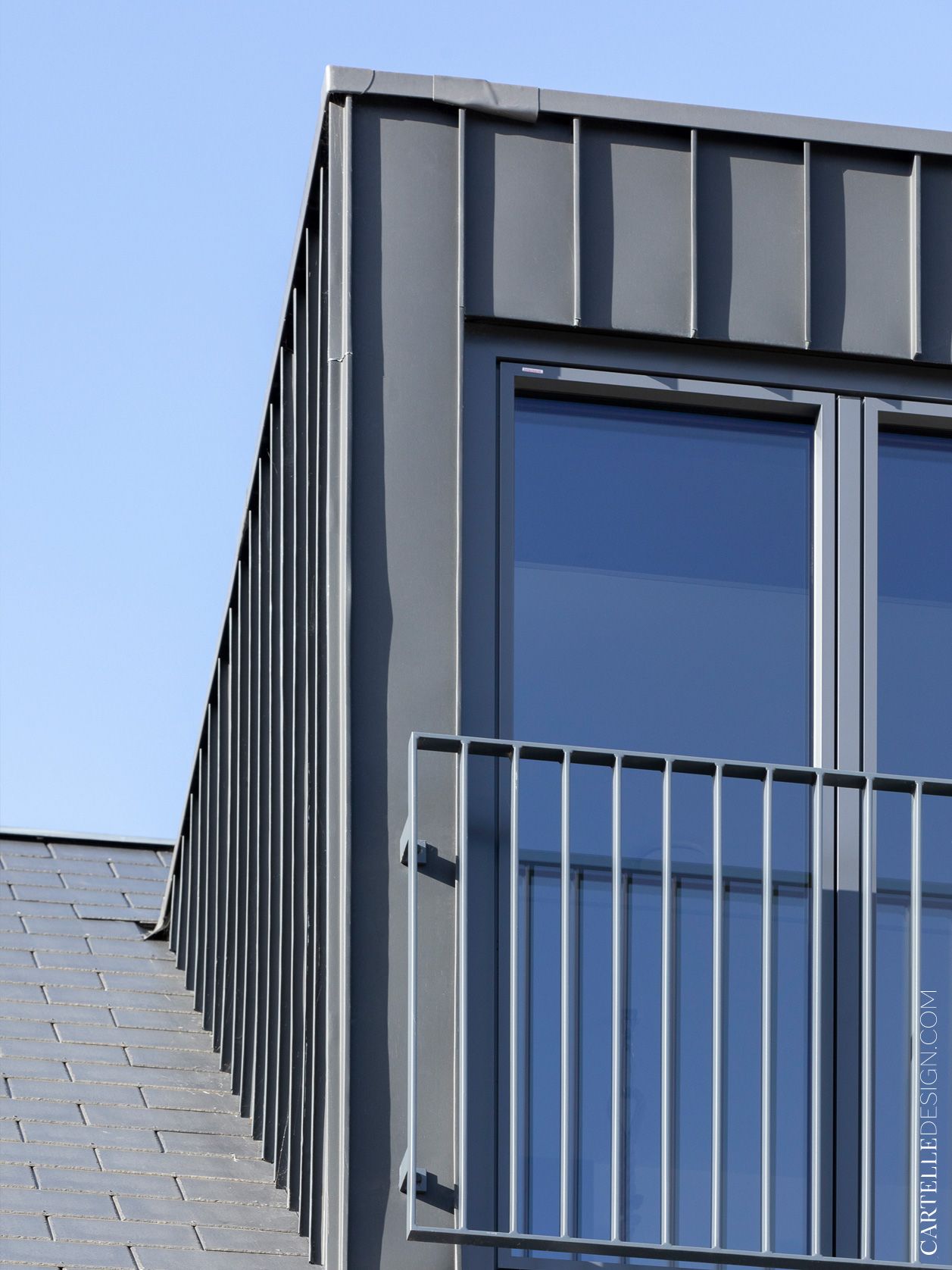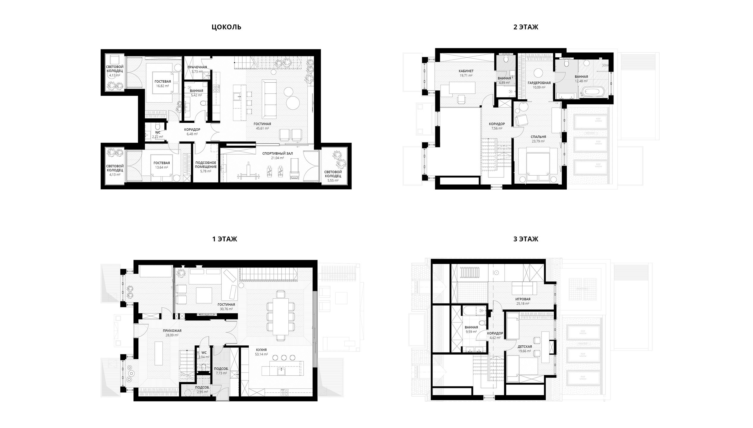 On the ground floor there is an entrance hall, a spacious living room with a kitchen and a dining room. The room turned out to be very bright thanks to panoramic windows overlooking the garden and skylights on the ceiling. On the second floor there is a private area with an office and a bedroom. The third floor is a children's area. The ground floor is the guest area. There are two guest bedrooms, a kitchen-living room and a gym.