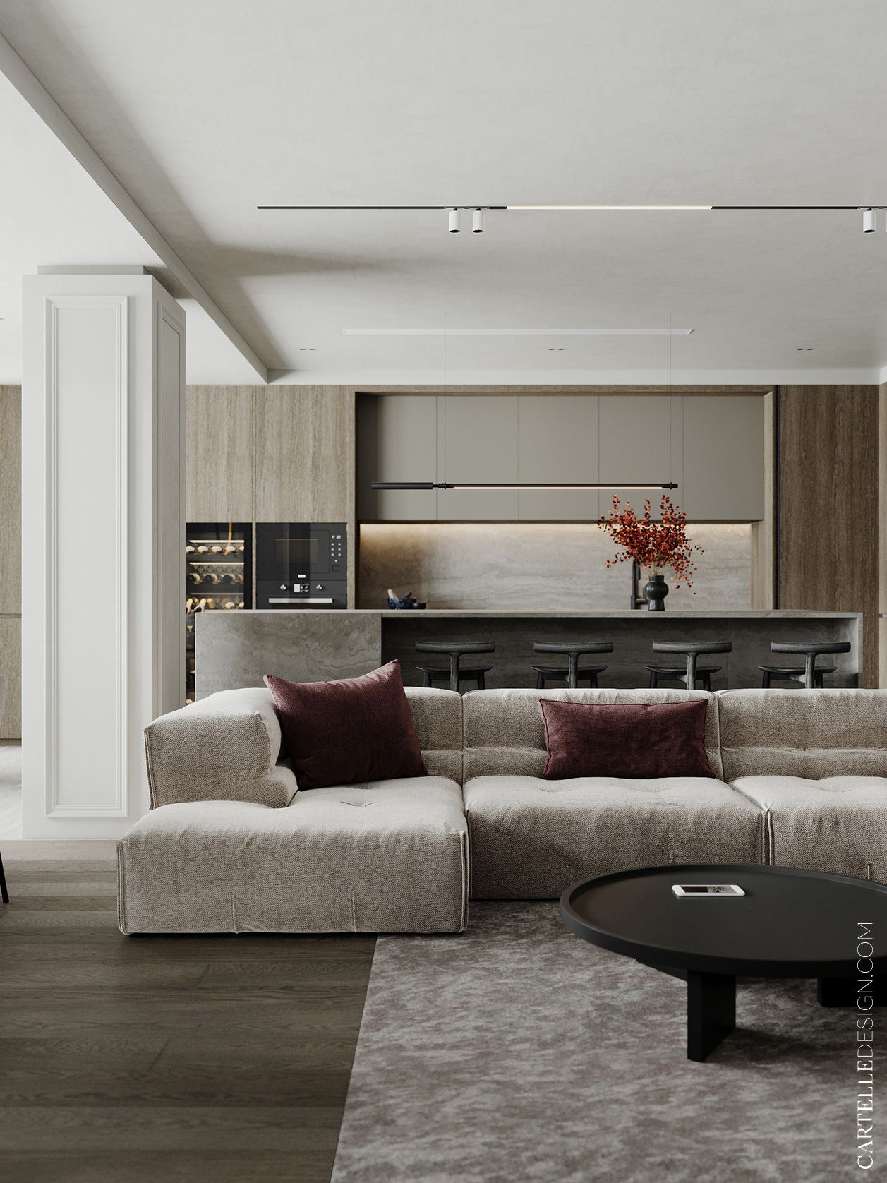 Bright spacious apartment for a large family in one of the new residential complexes in the south of Moscow. The apartment had a complex layout with load-bearing structures and a bunch of loggias with a total area of 31 m². We were faced with the task of creating a modern functional interior and rationally using the entire area of the apartment.