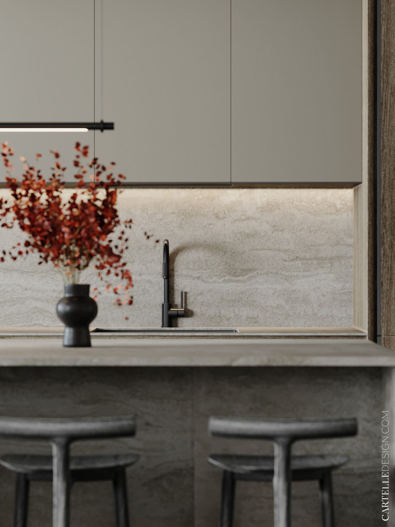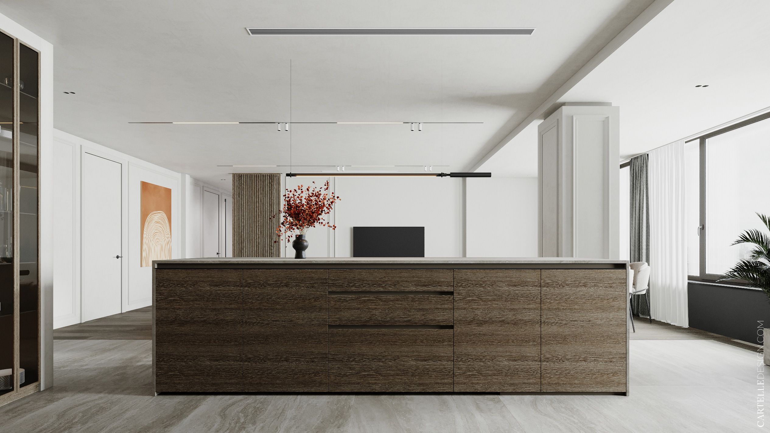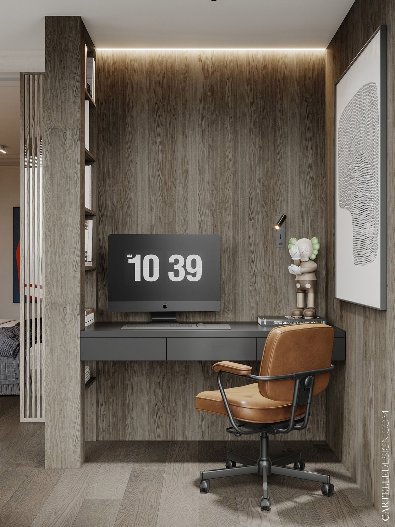 The master bedroom is at the end of the corridor. In a single private area there is a bedroom, a dressing room, a small but separate study, a bathroom and a boudoir. In the master bedroom, we used glass partitions and slatted panels - they allowed us to zone the space and make it visually larger.