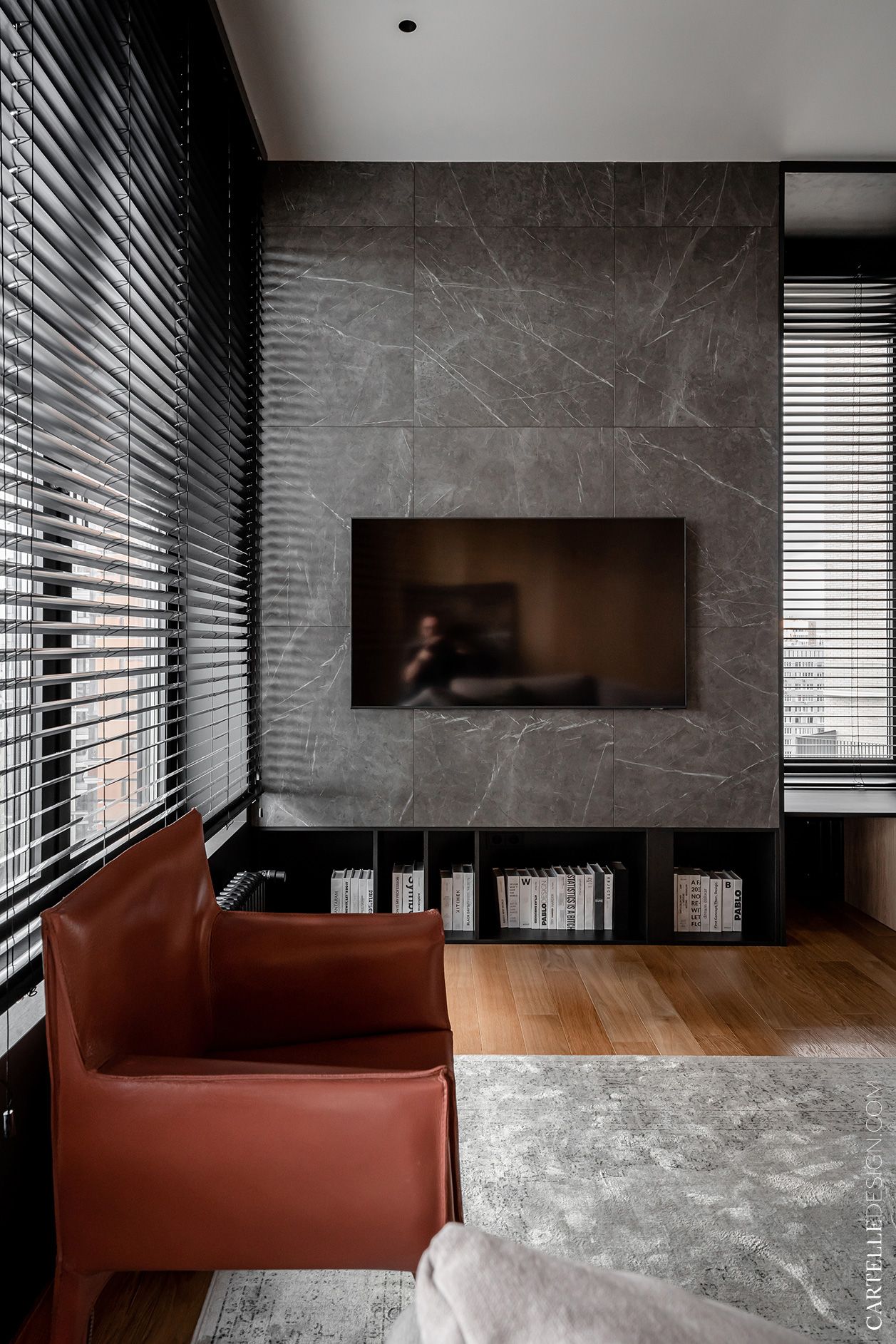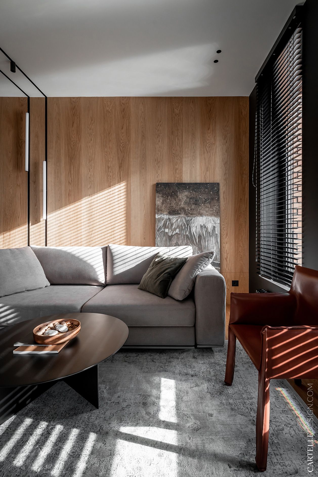 The interior turned out to be very cozy and calm due to the predominance of dark, muted tones. And a few accent pieces of furniture, for example, a red armchair or a dining table, add character and expressiveness to it.