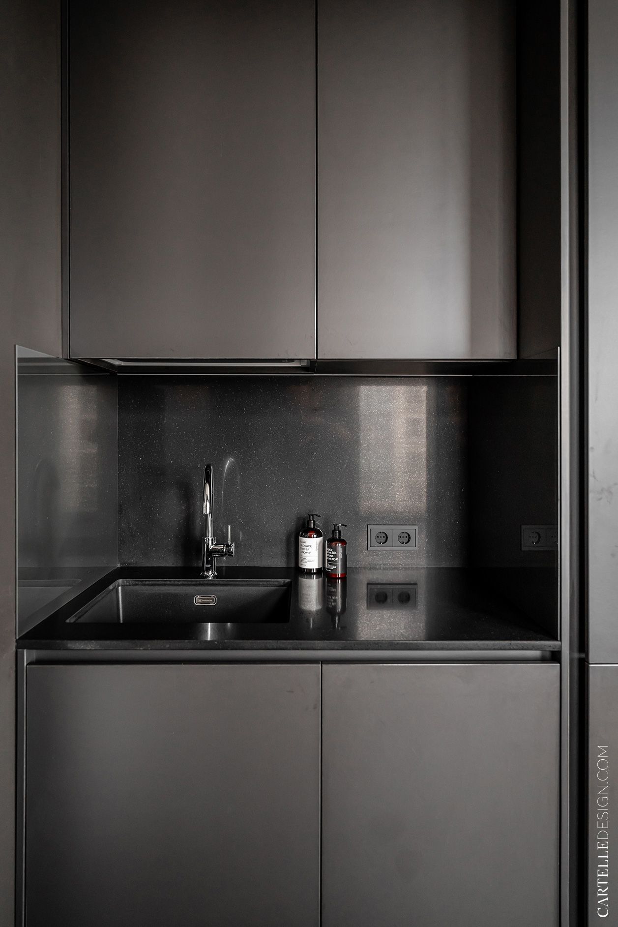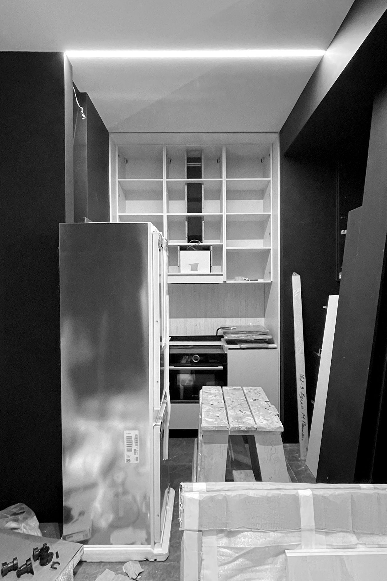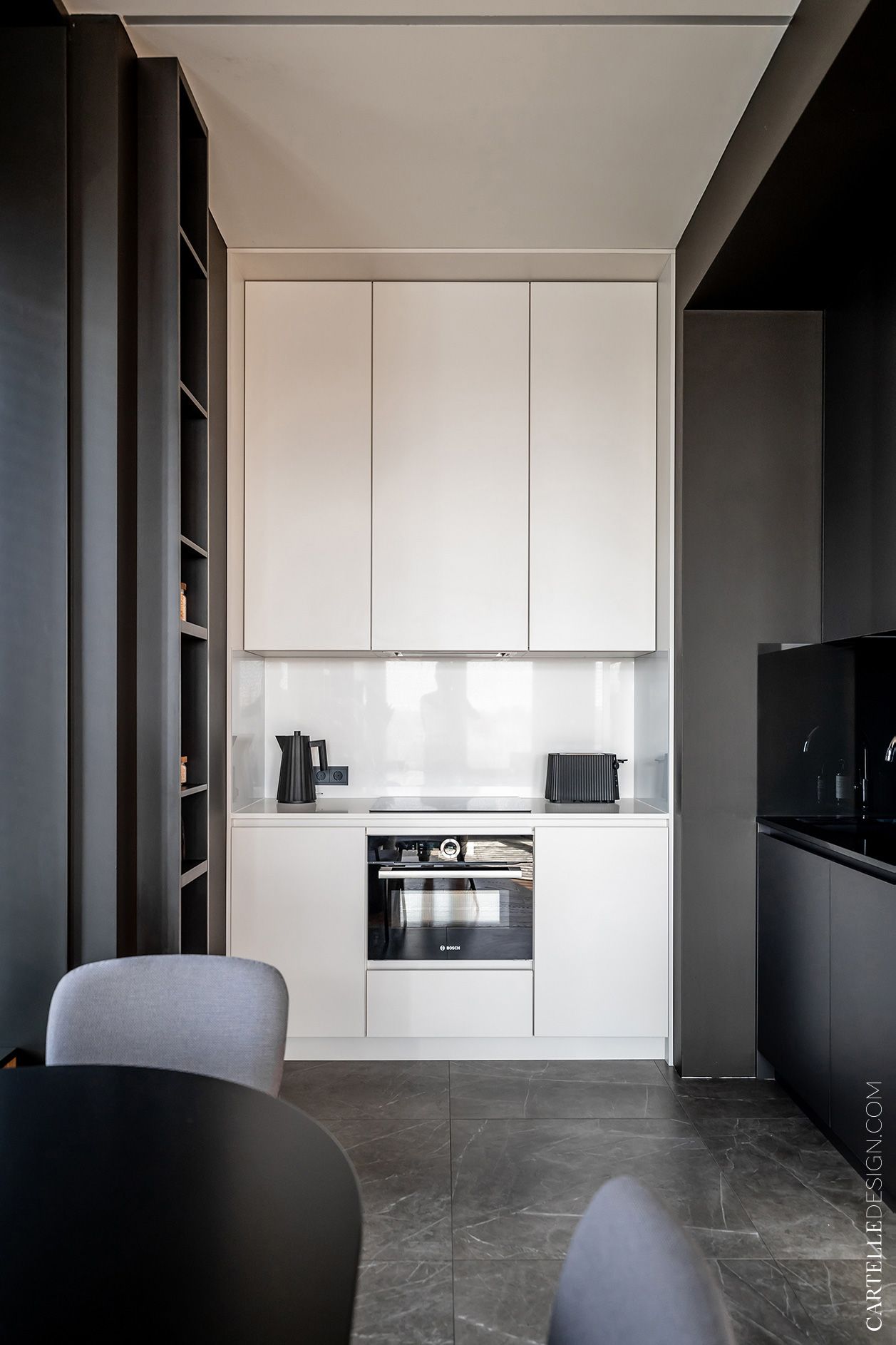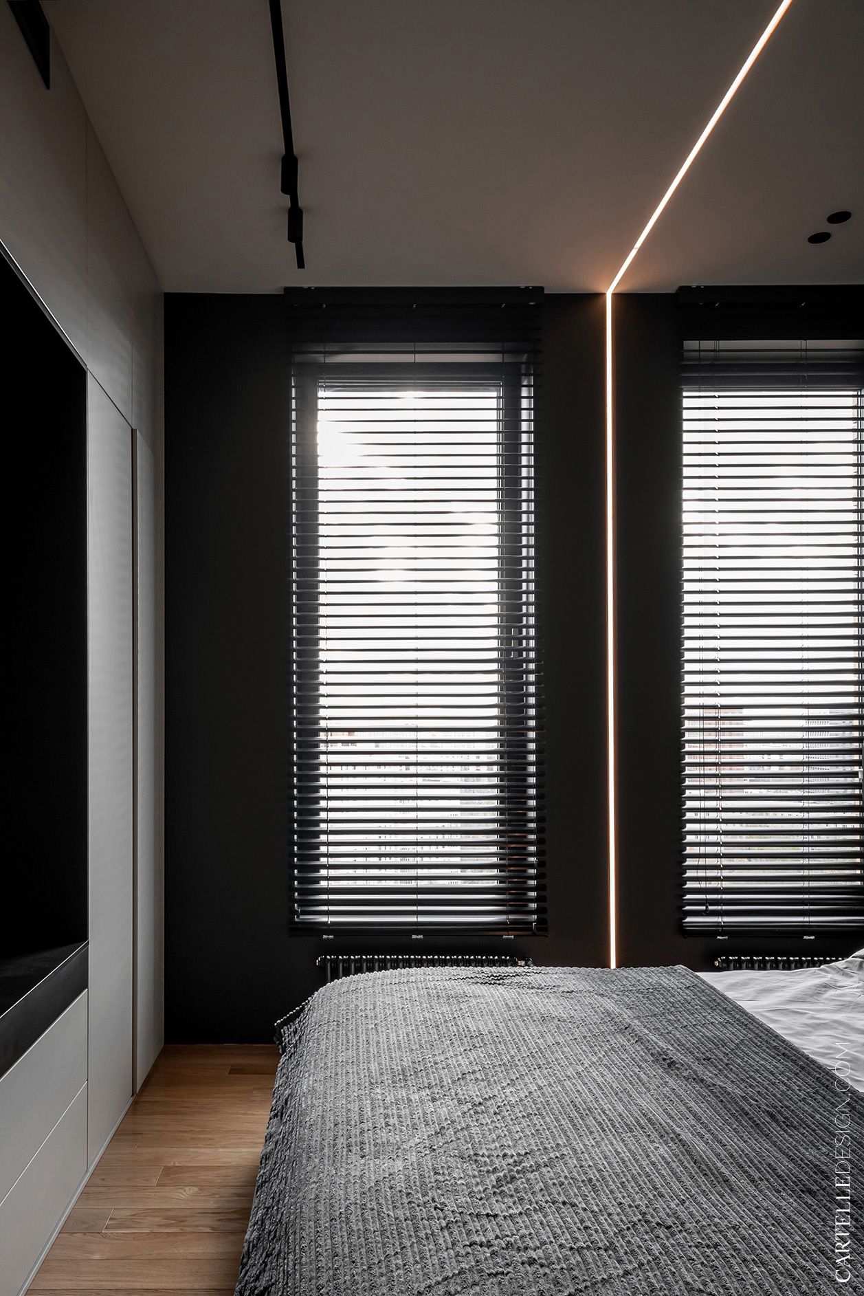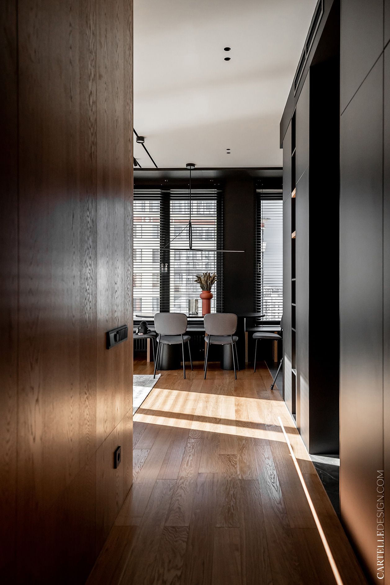 Despite the small area of the apartment, the project took more than a year to complete. During the work, there were difficulties with the construction team and the furniture supplier. The most difficult constructive moment was the joint between the kitchen and built-in wardrobes in the hallway. It was also not easy to pick up a tree. The living room has parquet on the floor, and a veneered panel with a built-in lamp on the wall. Parquet and veneer were ordered from different places, and it was necessary to accurately select the shade, pattern and texture of the wood. But despite the difficulties, the project was completely successful. And we hope that it will please its owners for a long time.