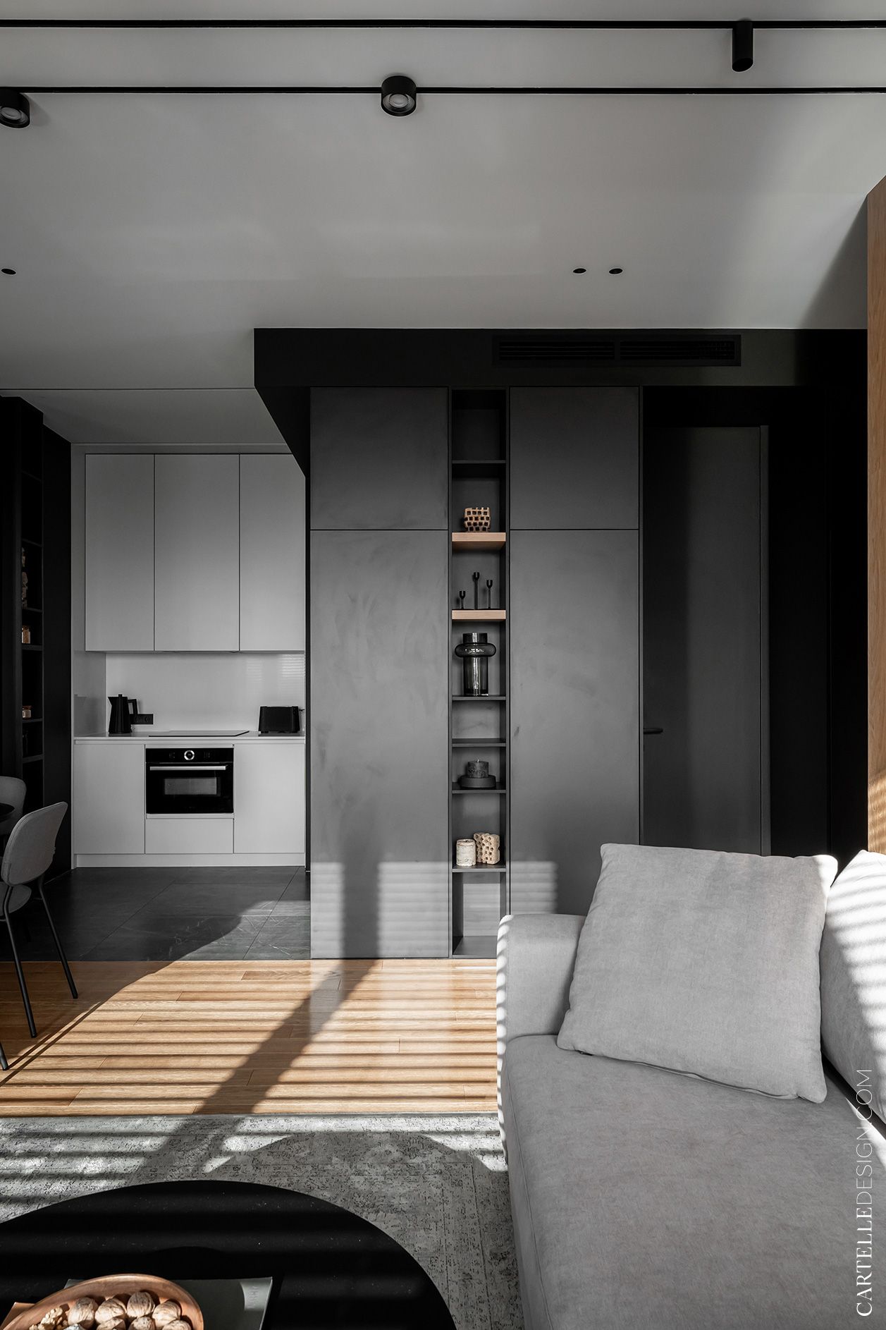 Apartment project for a couple. The task was to create the most functional and comfortable space in a small area. The main difficulty was that the area is small, but there should be many functions.