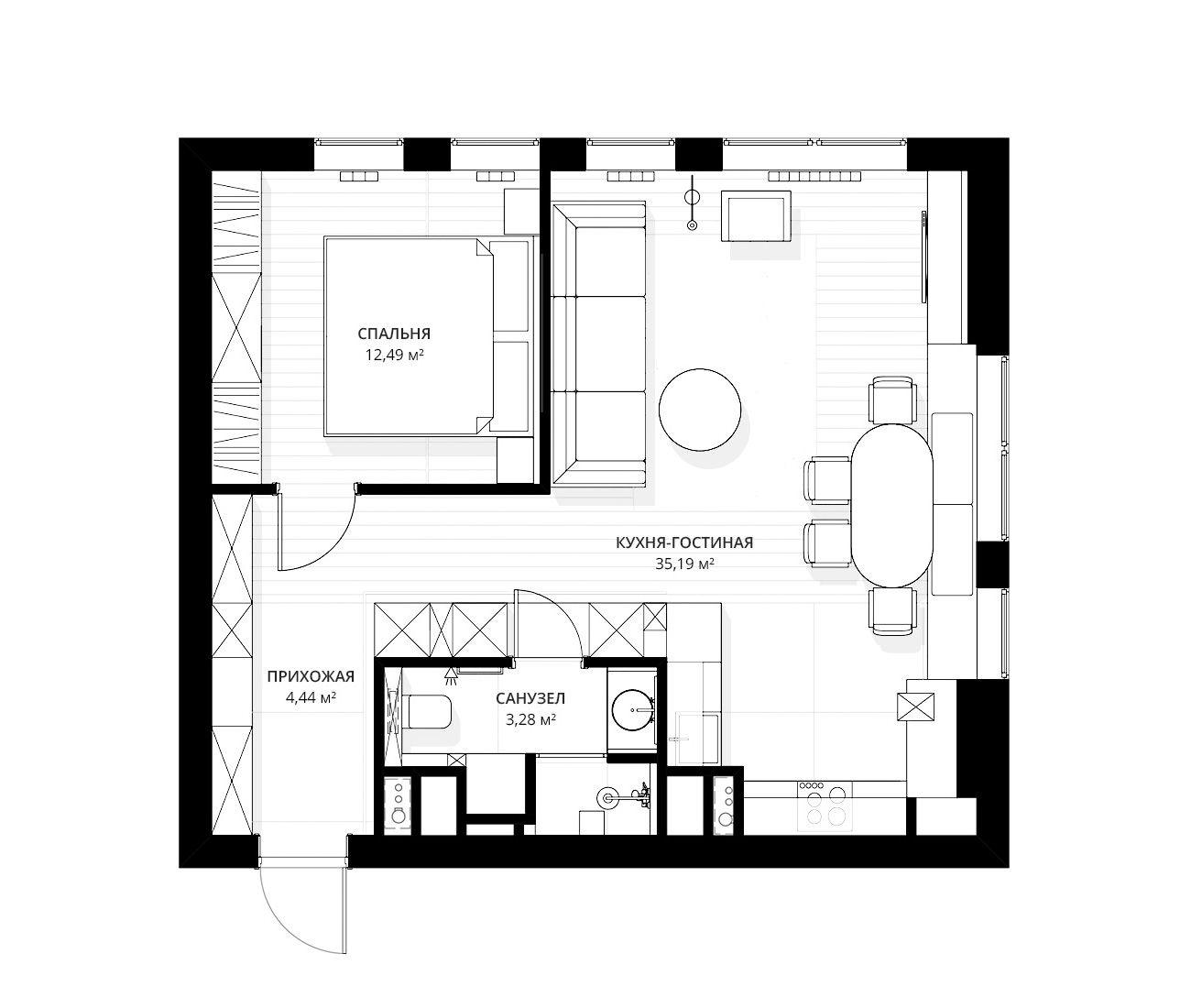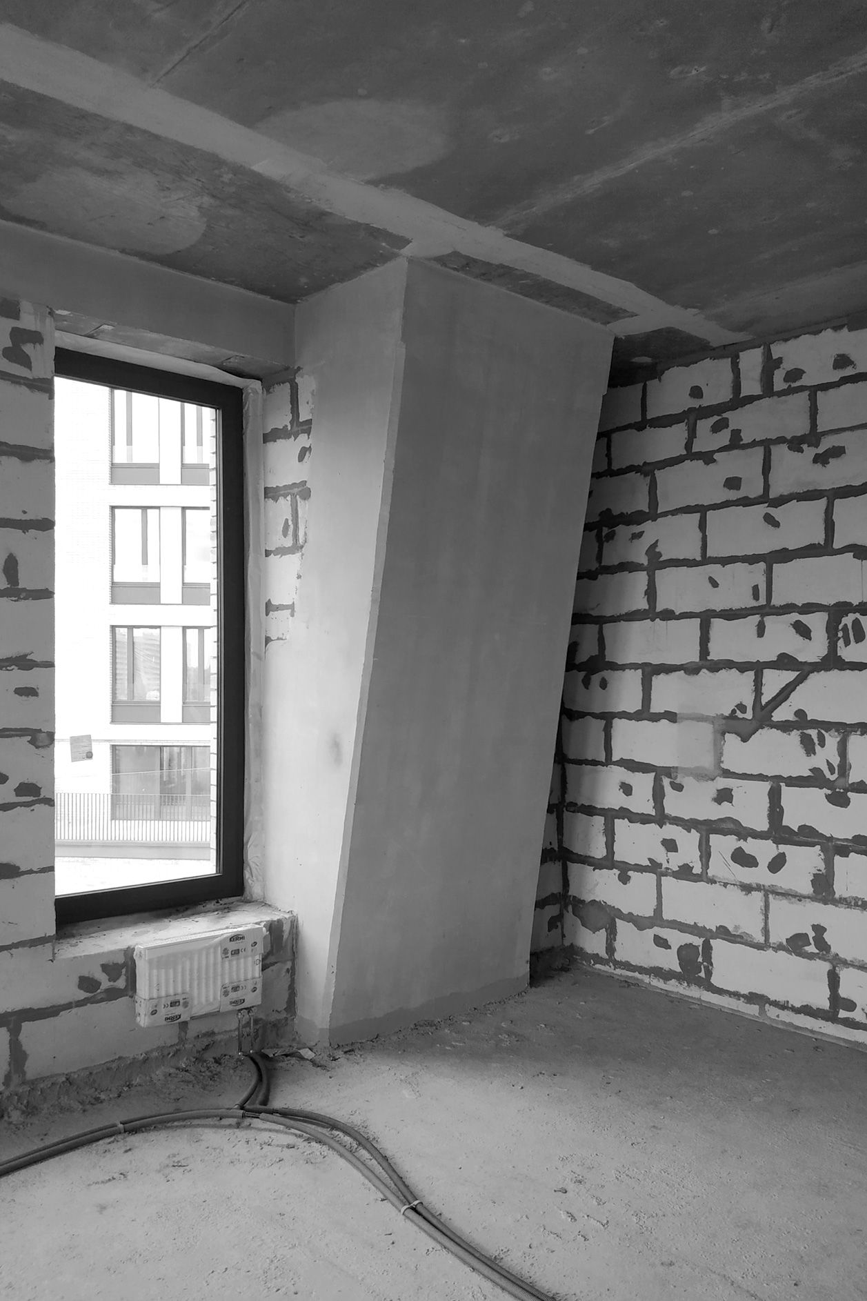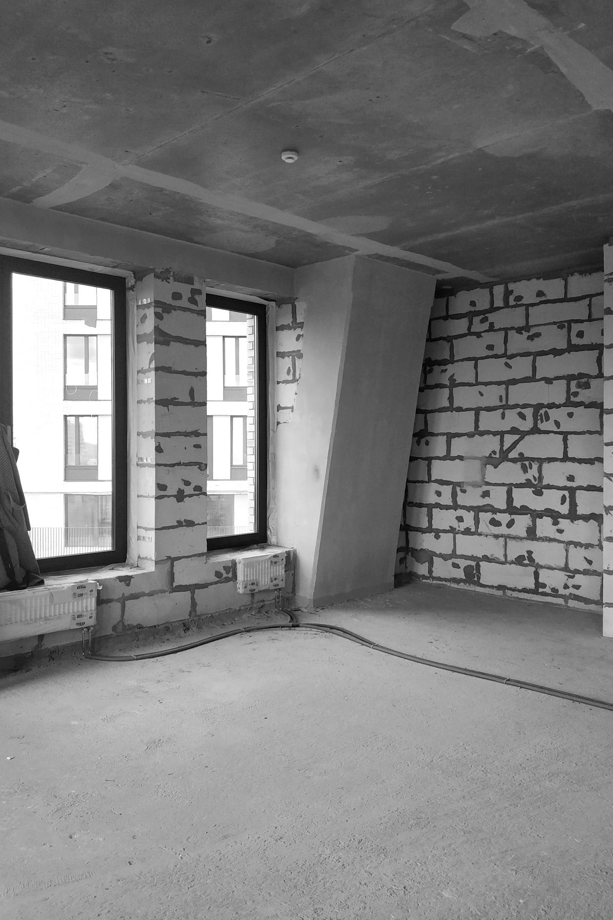 The main drawback of the room is the load-bearing columns between the windows. They were of different sizes and even at an angle. But we managed to turn the disadvantage into an interesting constructive solution. We aligned the columns and connected them with a bench that turns into a window sill. The result is a cool and atmospheric place to hang out with friends or work. Another interesting solution is inconspicuous storage spaces. We placed a group of cabinets around the bathroom, and the entrance to the bathroom was beaten with a metal portal. The cabinets look like part of the wall, there is no feeling of crowding, and there are a lot of storage spaces.