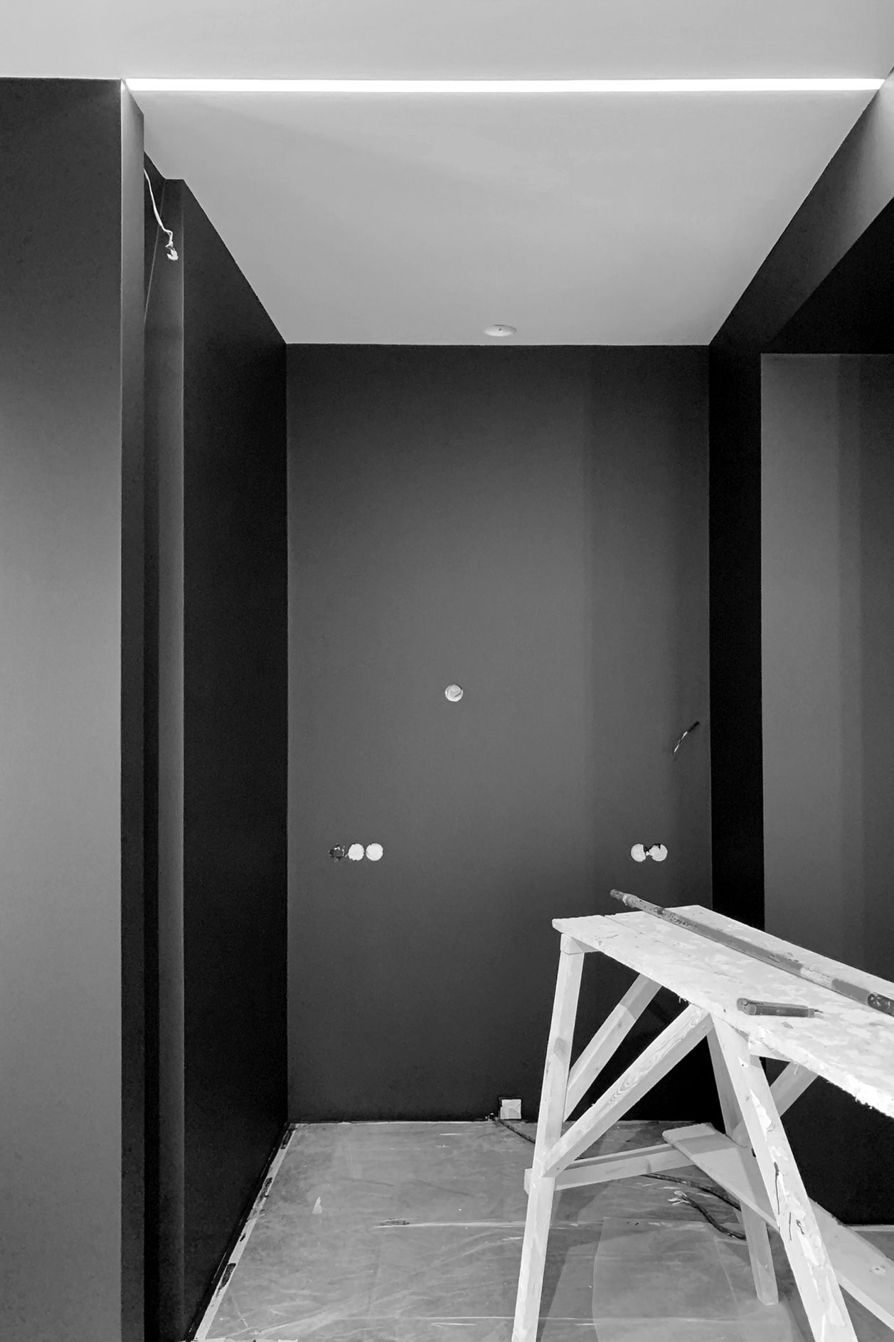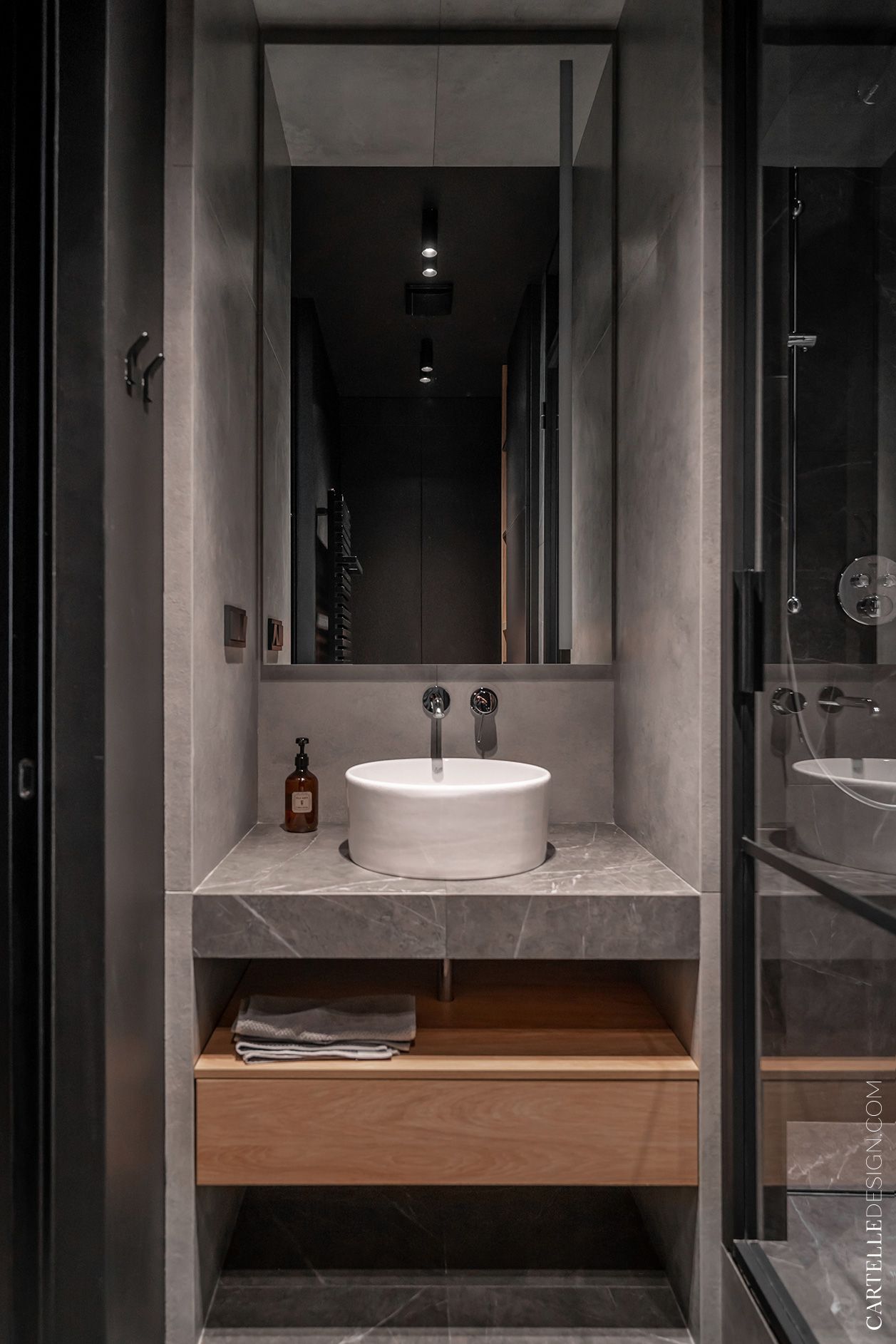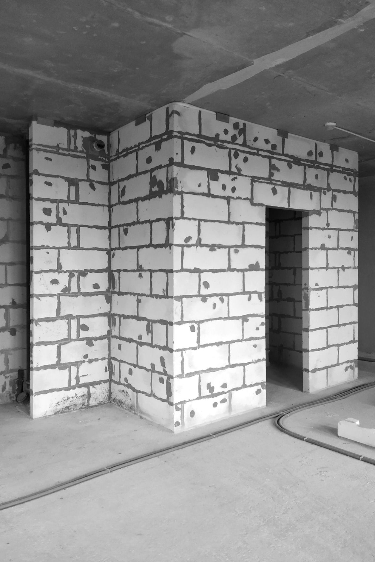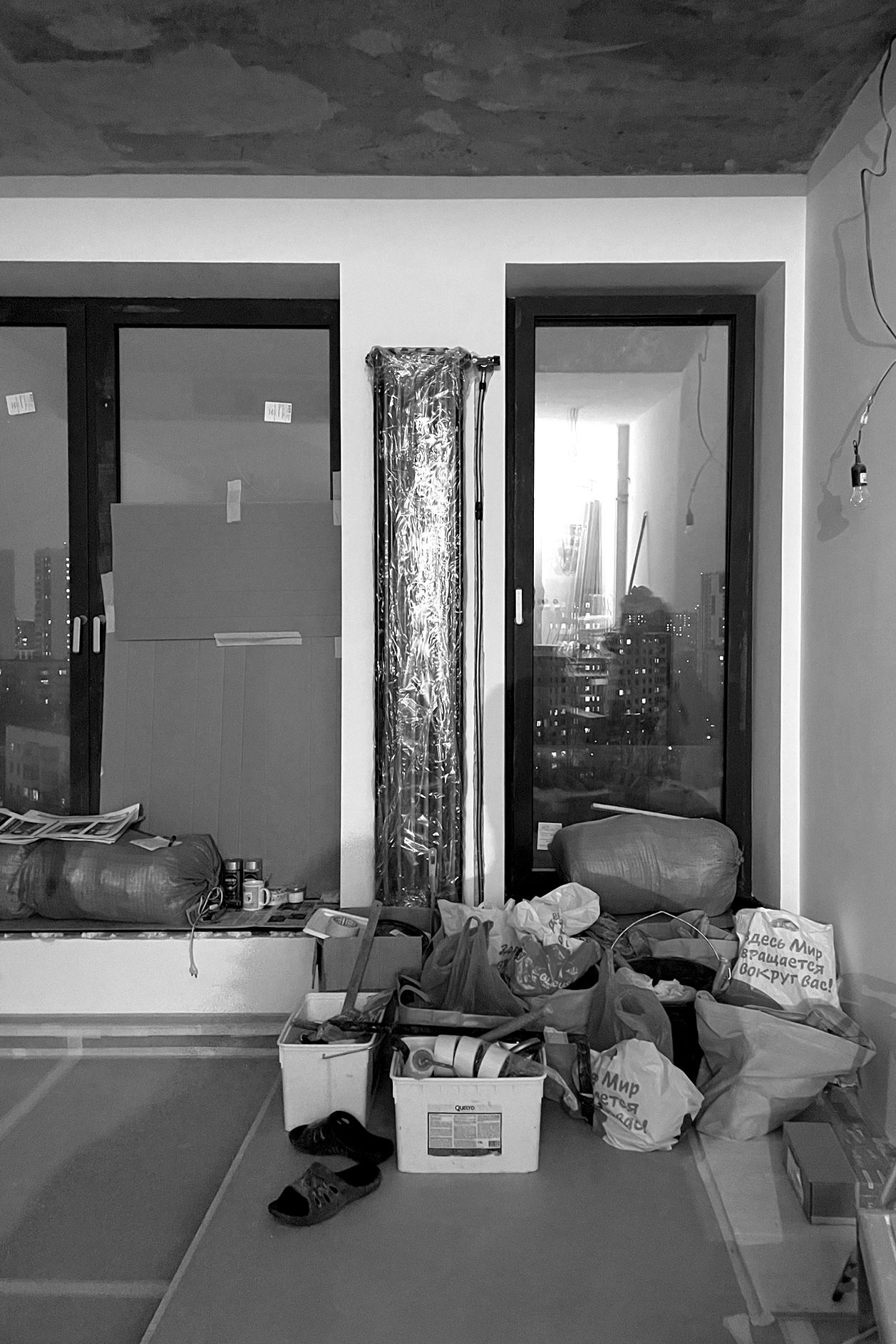 The main drawback of the room is the load-bearing columns between the windows. They were of different sizes and even at an angle. But we managed to turn the disadvantage into an interesting constructive solution. We aligned the columns and connected them with a bench that turns into a window sill. The result is a cool and atmospheric place to hang out with friends or work. Another interesting solution is inconspicuous storage spaces. We placed a group of cabinets around the bathroom, and the entrance to the bathroom was beaten with a metal portal. The cabinets look like part of the wall, there is no feeling of crowding, and there are a lot of storage spaces.