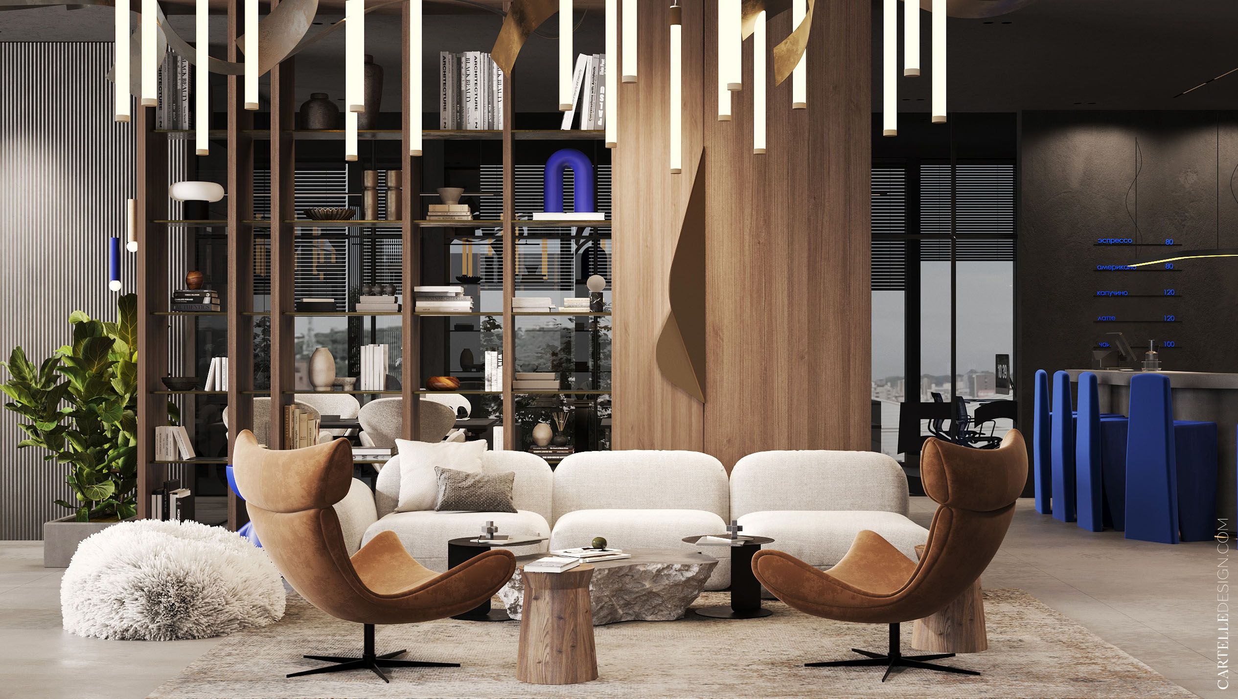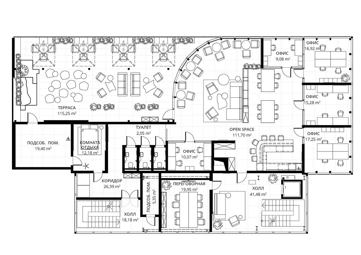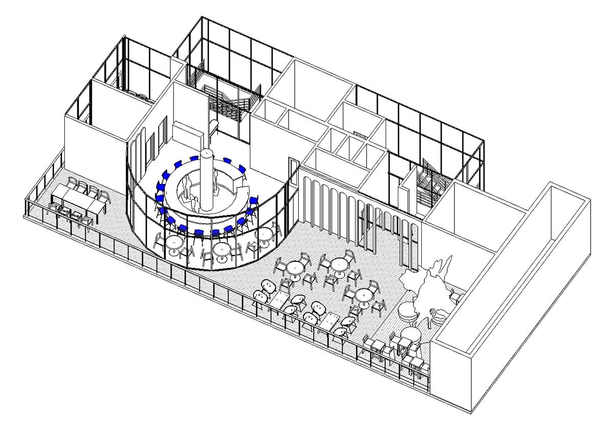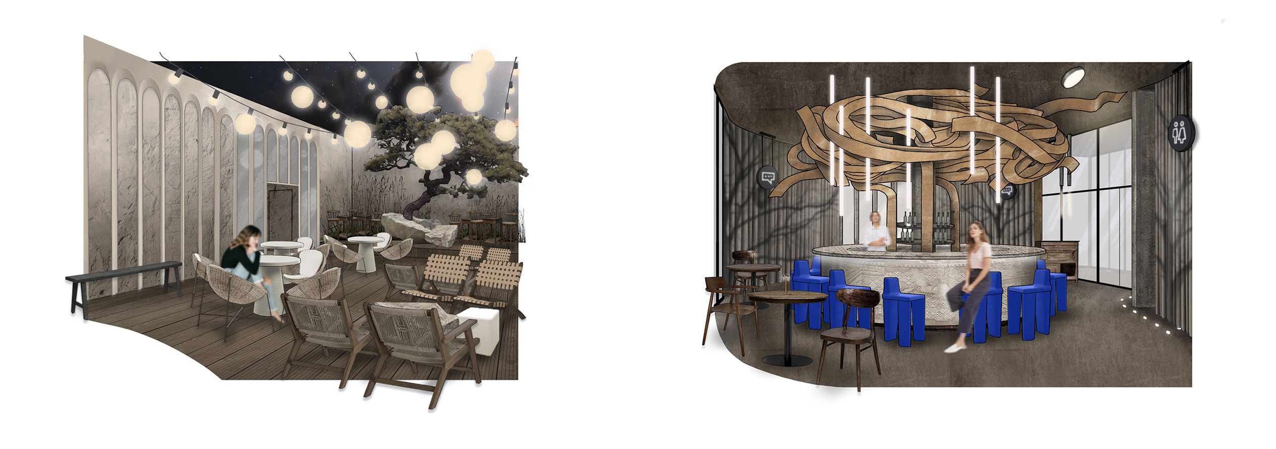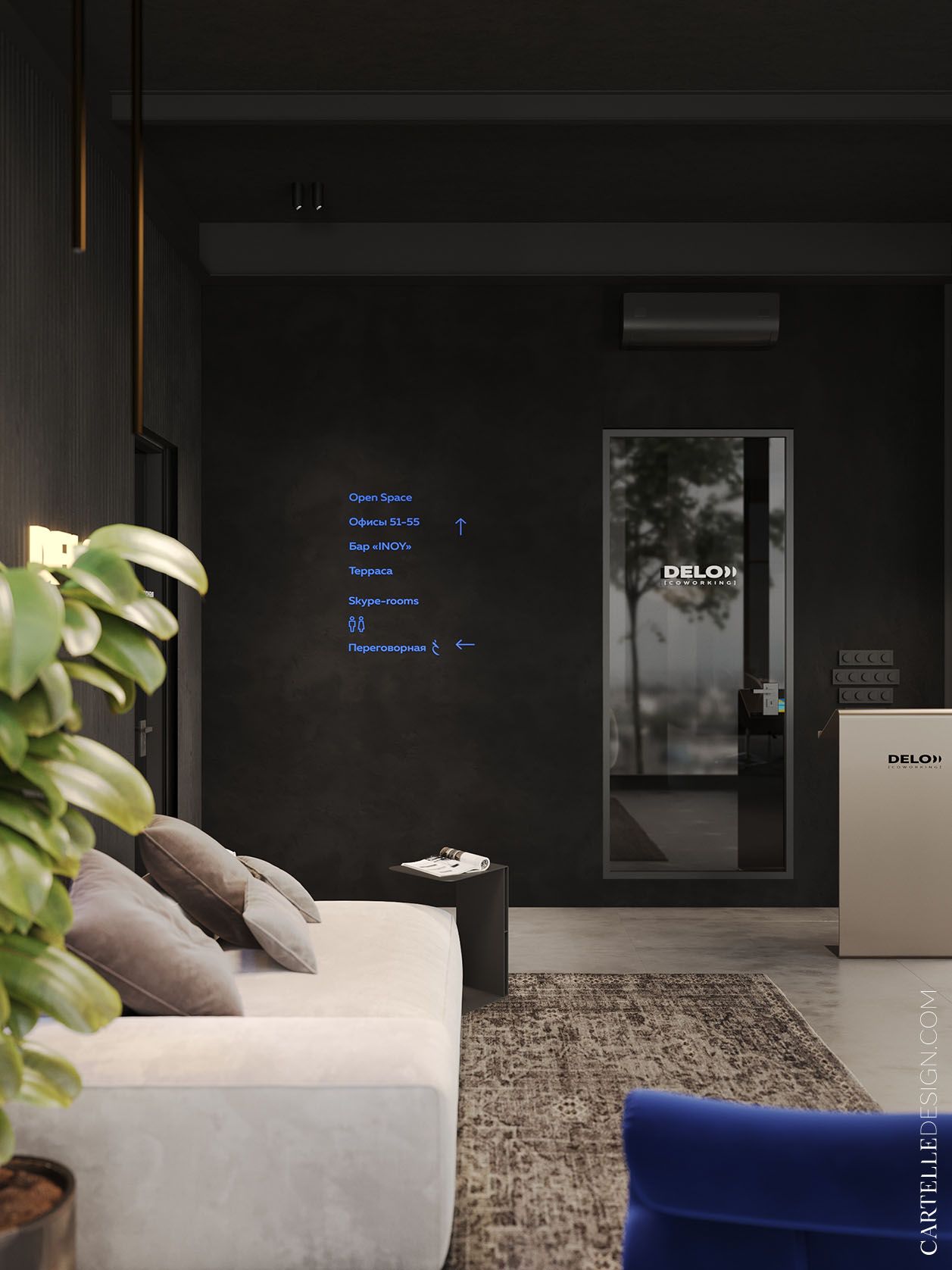 Главная сложность заключалась в том, что строительные работы уже шли полным ходом и большая часть конструкций уже была возведена. Наша задача была в том, чтобы полностью поменять назначение помещения, сведя к минимуму любые перестройки. От первой концепции осталось остекление полукругом и расположение террасы. Место барной стойки занял open space с рабочими местами, лаундж зоной и столиками кофейни. По периметру расположились несколько отдельных офисов. Площадь террасы немного сократилась. Функционально это продолжение open space, где можно поработать с ноутбуком, выпить кофе или провести деловую встречу. Также на террасе появился проектор и мягкие кресла для кино вечеров и мероприятий. Стилистически мы старались связать новый этаж с уже построенным коворкингом. А самые внимательные могут найти части светильника-гнезда в новом интерьере.
