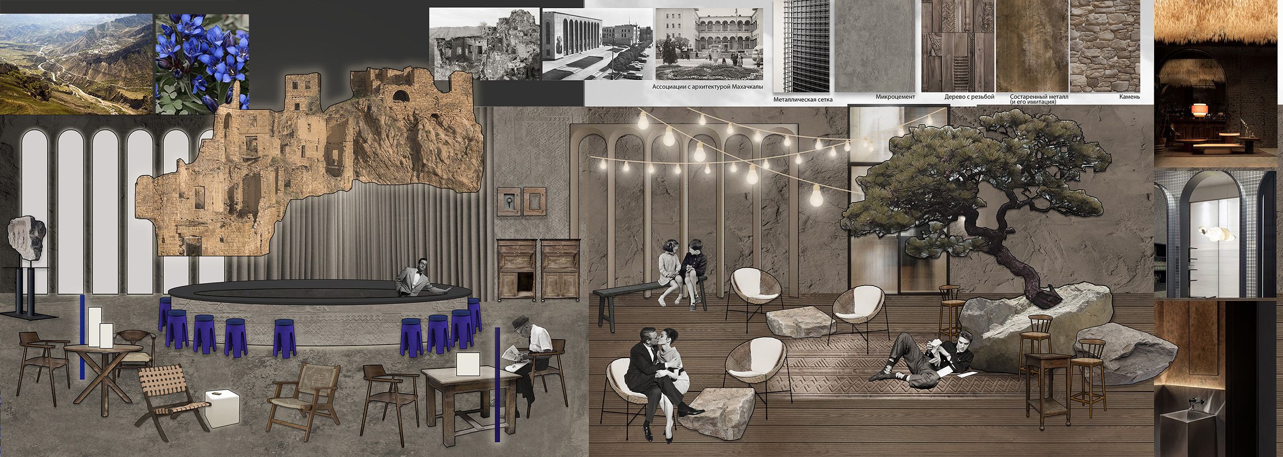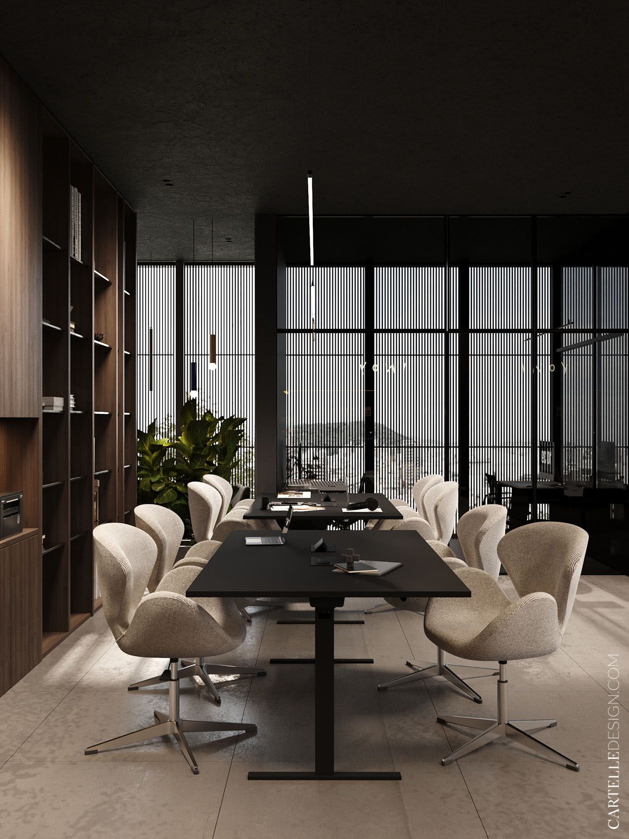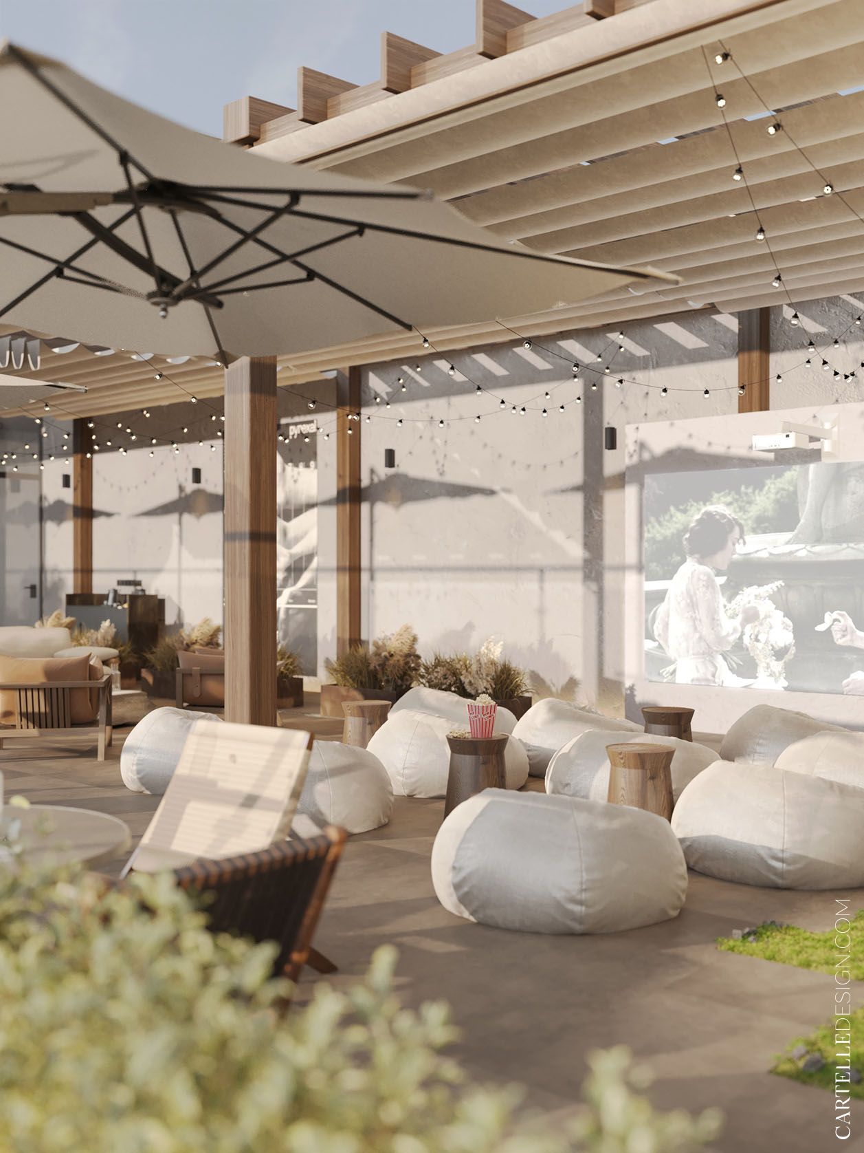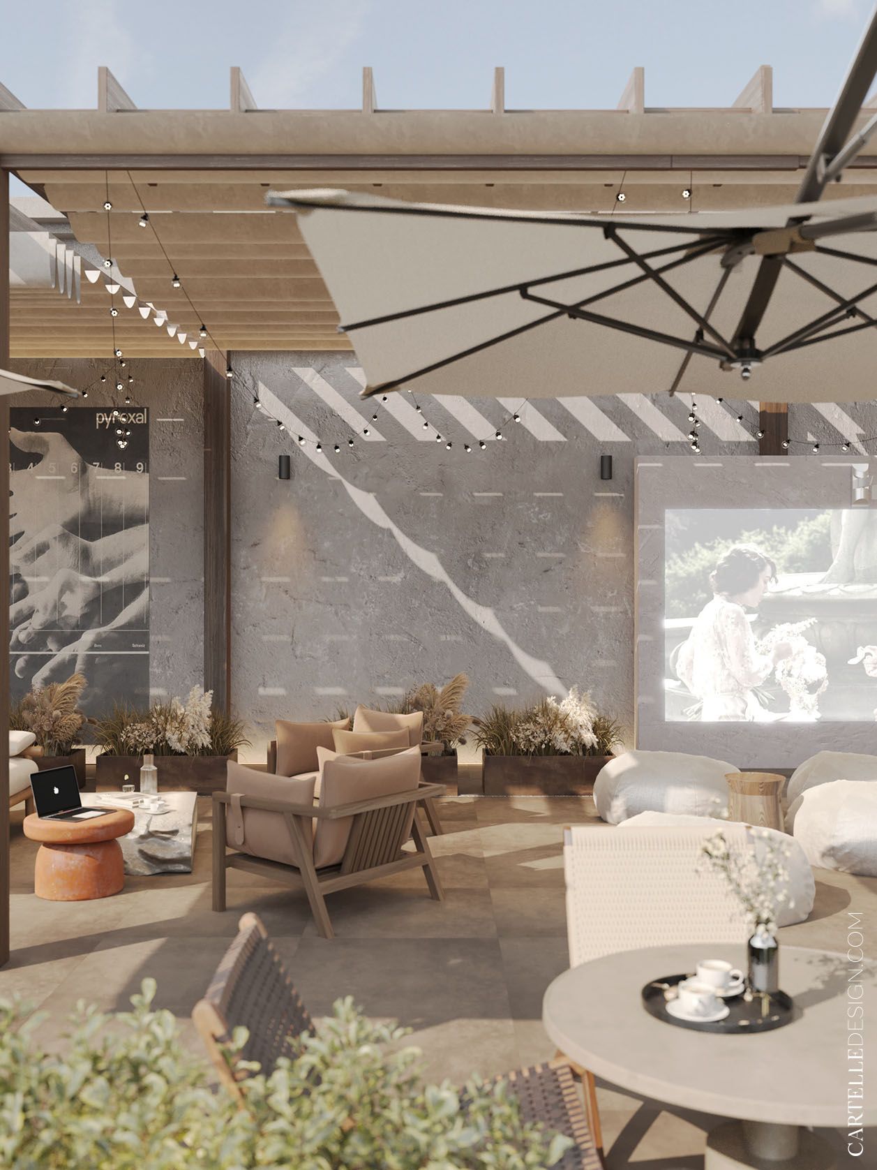 Главная сложность заключалась в том, что строительные работы уже шли полным ходом и большая часть конструкций уже была возведена. Наша задача была в том, чтобы полностью поменять назначение помещения, сведя к минимуму любые перестройки. От первой концепции осталось остекление полукругом и расположение террасы. Место барной стойки занял open space с рабочими местами, лаундж зоной и столиками кофейни. По периметру расположились несколько отдельных офисов. Площадь террасы немного сократилась. Функционально это продолжение open space, где можно поработать с ноутбуком, выпить кофе или провести деловую встречу. Также на террасе появился проектор и мягкие кресла для кино вечеров и мероприятий. Стилистически мы старались связать новый этаж с уже построенным коворкингом. А самые внимательные могут найти части светильника-гнезда в новом интерьере.