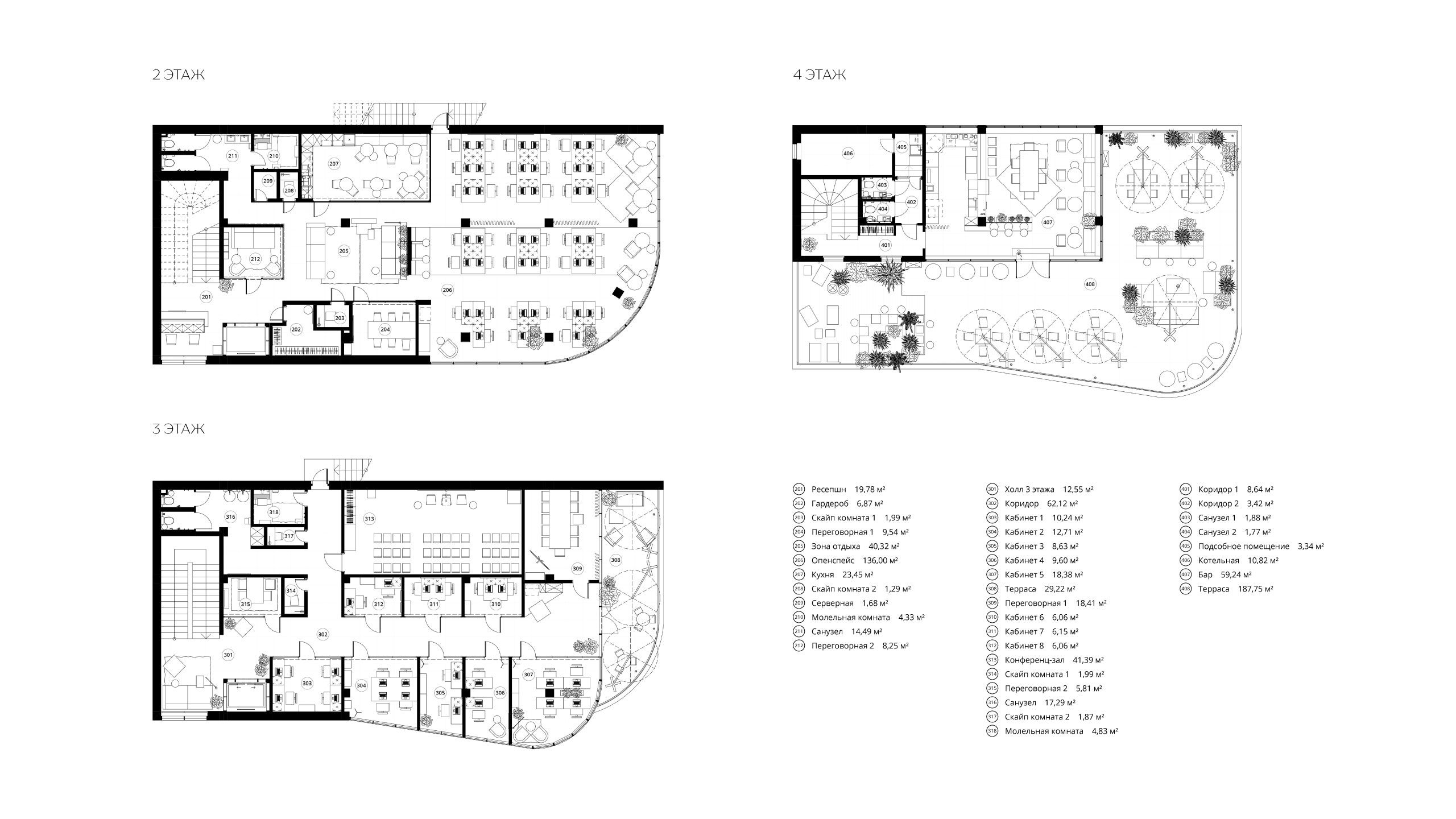 Коворкинг расположился в четырехэтажном здании и занял второй, третий и четвертый этаж. Главный плюс помещения - ленточное осекление. На втором этаже в самой светлой части помещения мы расположили просторный open space, а по периметру несколько офисов и переговорных комнат. Третий этаж занимают небольшие офисы на 2-4 человека и конференц-зал. Четвертый этаж занимает кофейня и терраса, на которой можно и отдохнуть, и поработать.