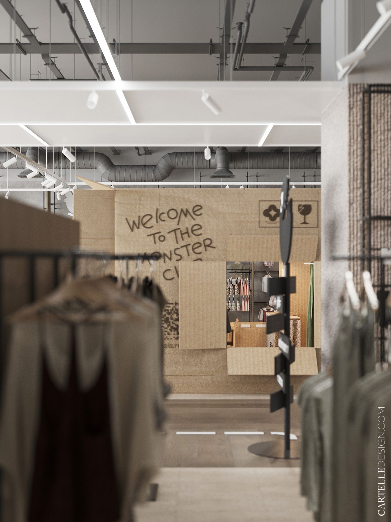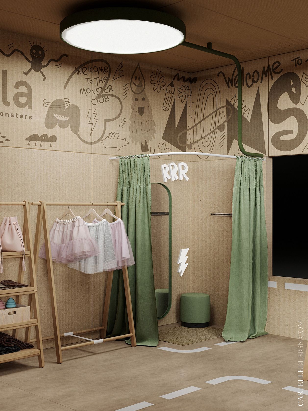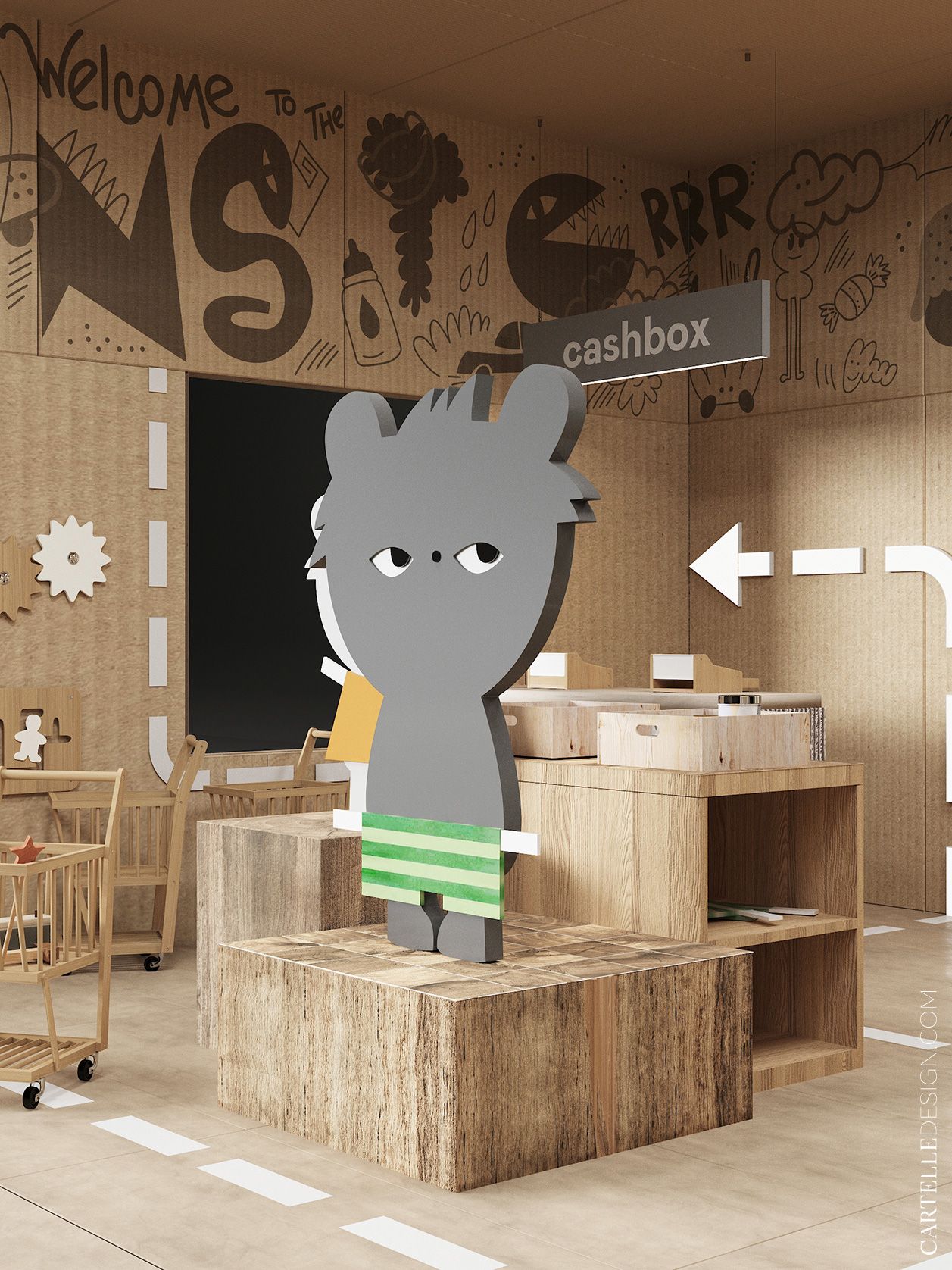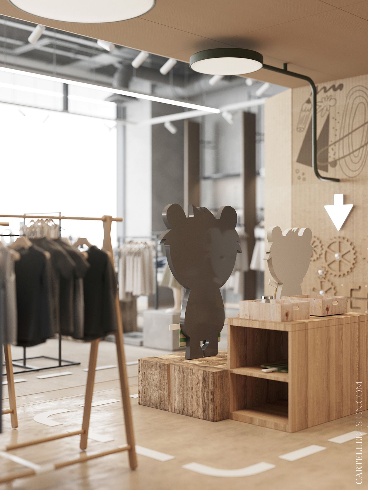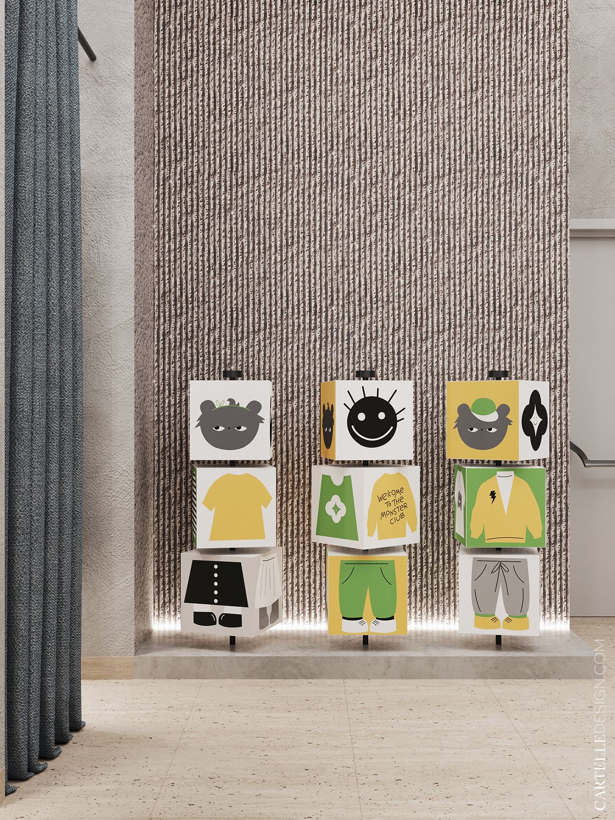 Цветовая гамма отделки - единая для всех зон. Декором служит яркая навигация размещенная на полках вдоль стен каждой зоны - медведи Вигги. А также таблички со словами и возрастом на оборудовании для одежды. Напротив входа размещаем навигационный стенд в виде монстра с указанием зонирования магазина.