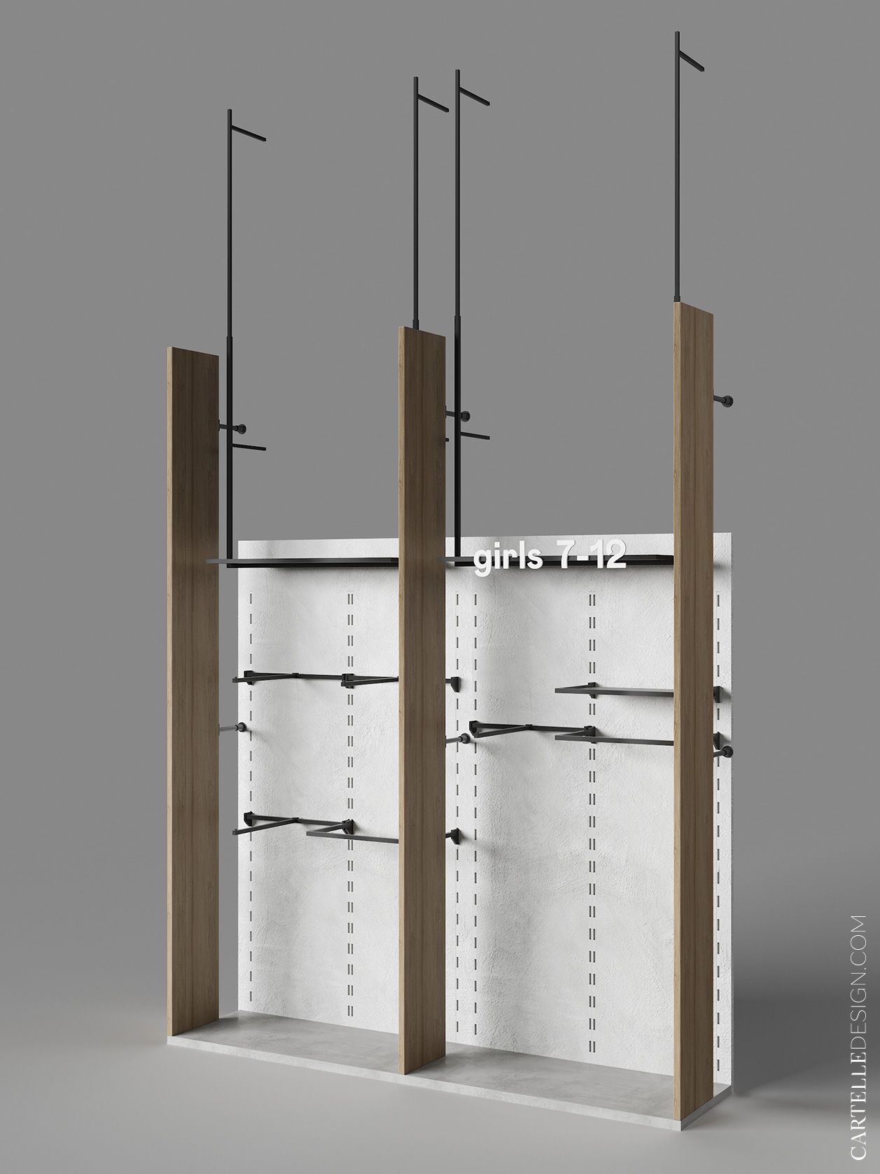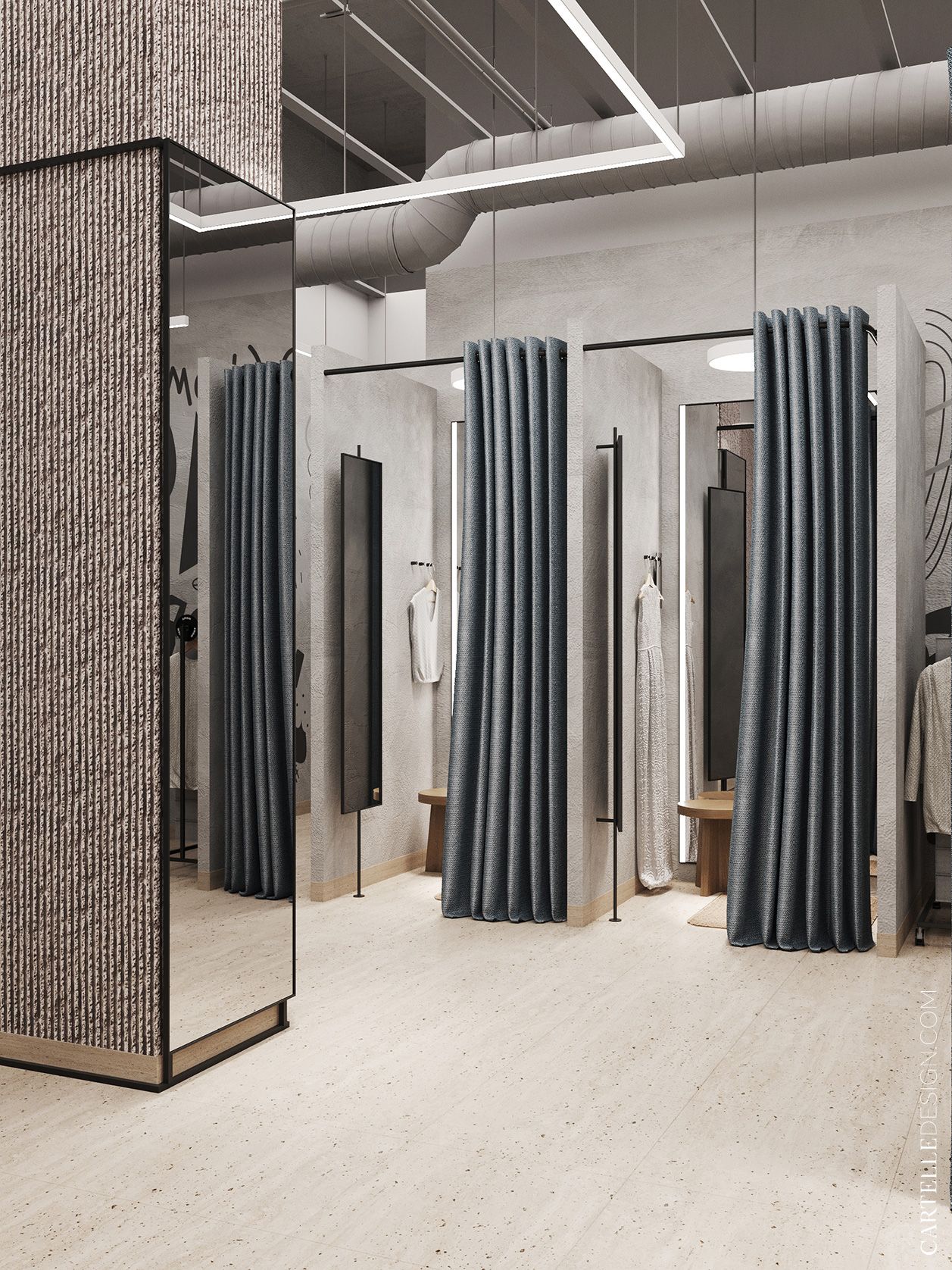 Магазин разделен на две большие зоны “одежда для мам” и “детская одежда” контрастной полосой на полу и потолке. Игровая детская коробка размещается в детской половине торгового зала. По своему наполнению зоны не отличаются ни цветом, ни оборудованием. Различия только в элементах навигации.