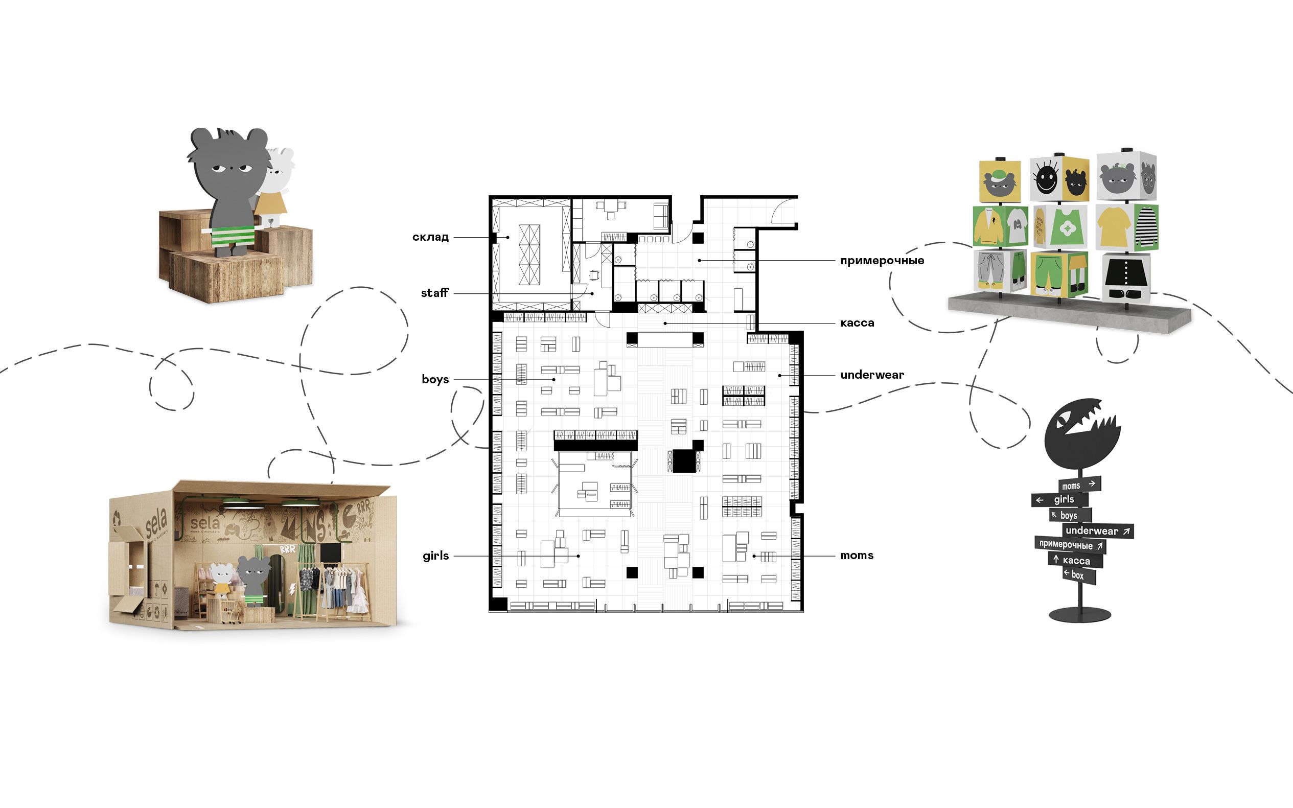 К нам обратилась компания SELA. Перед нами стояла задача разработать новую концепцию интерьеров магазинов сети. Необходимо было разработать дизайн-проект и торговое оборудование для одного магазина. А затем составить подробный гайдлайн, на основе которого команда сети сможет самостоятельно масштабировать дизайн-проект для магазинов разной площади и конфигурации.