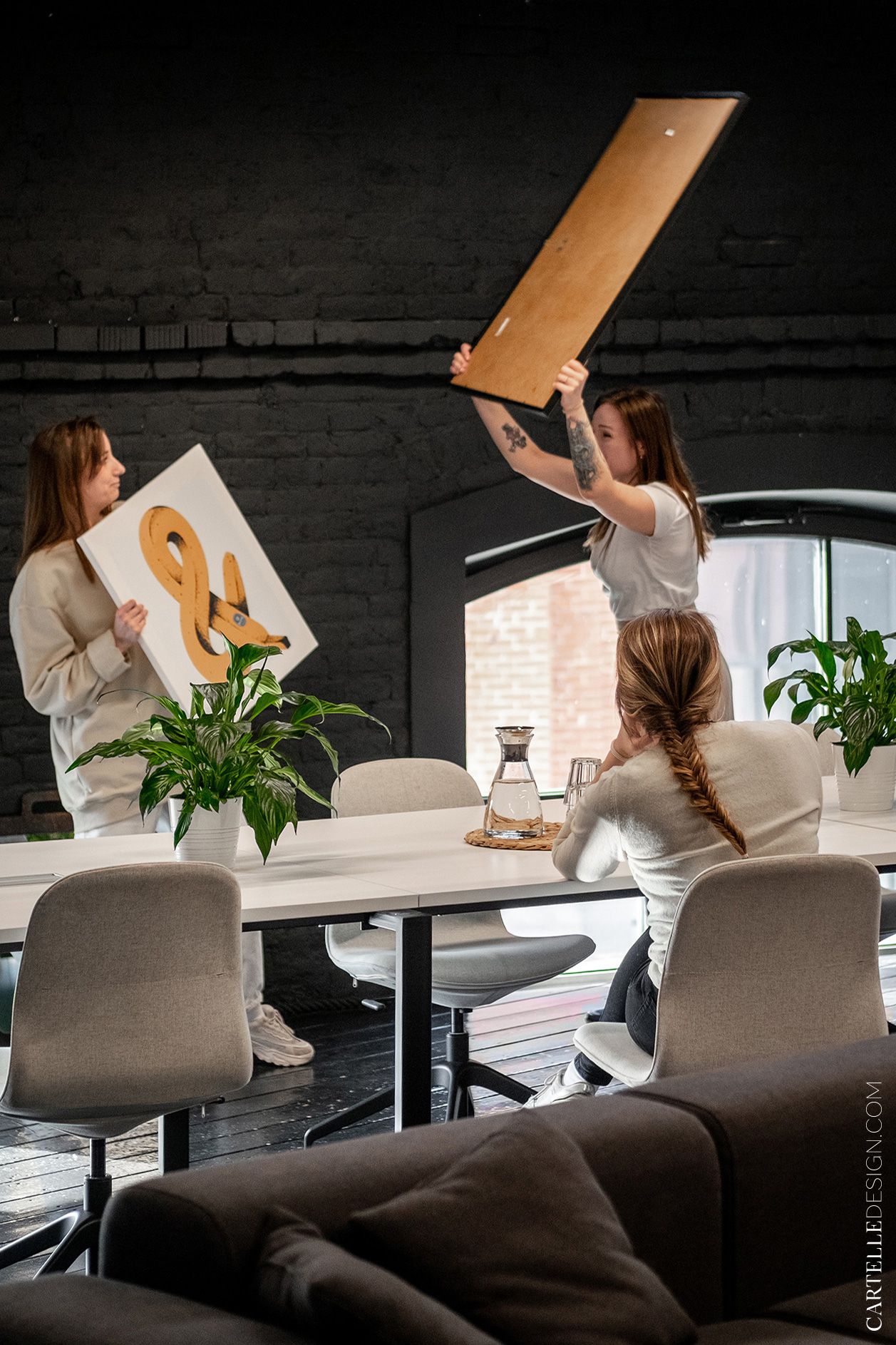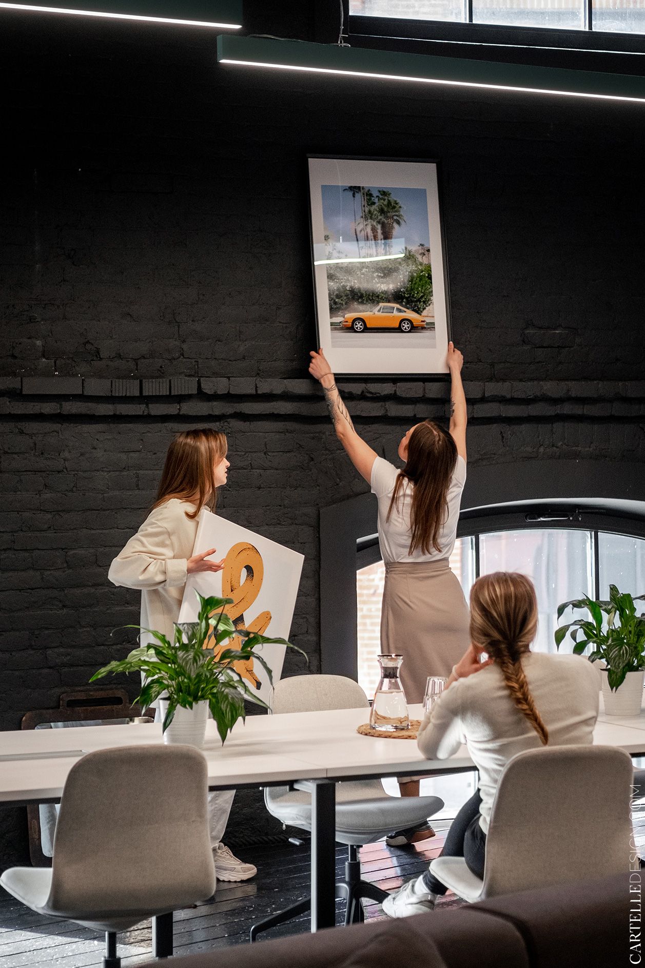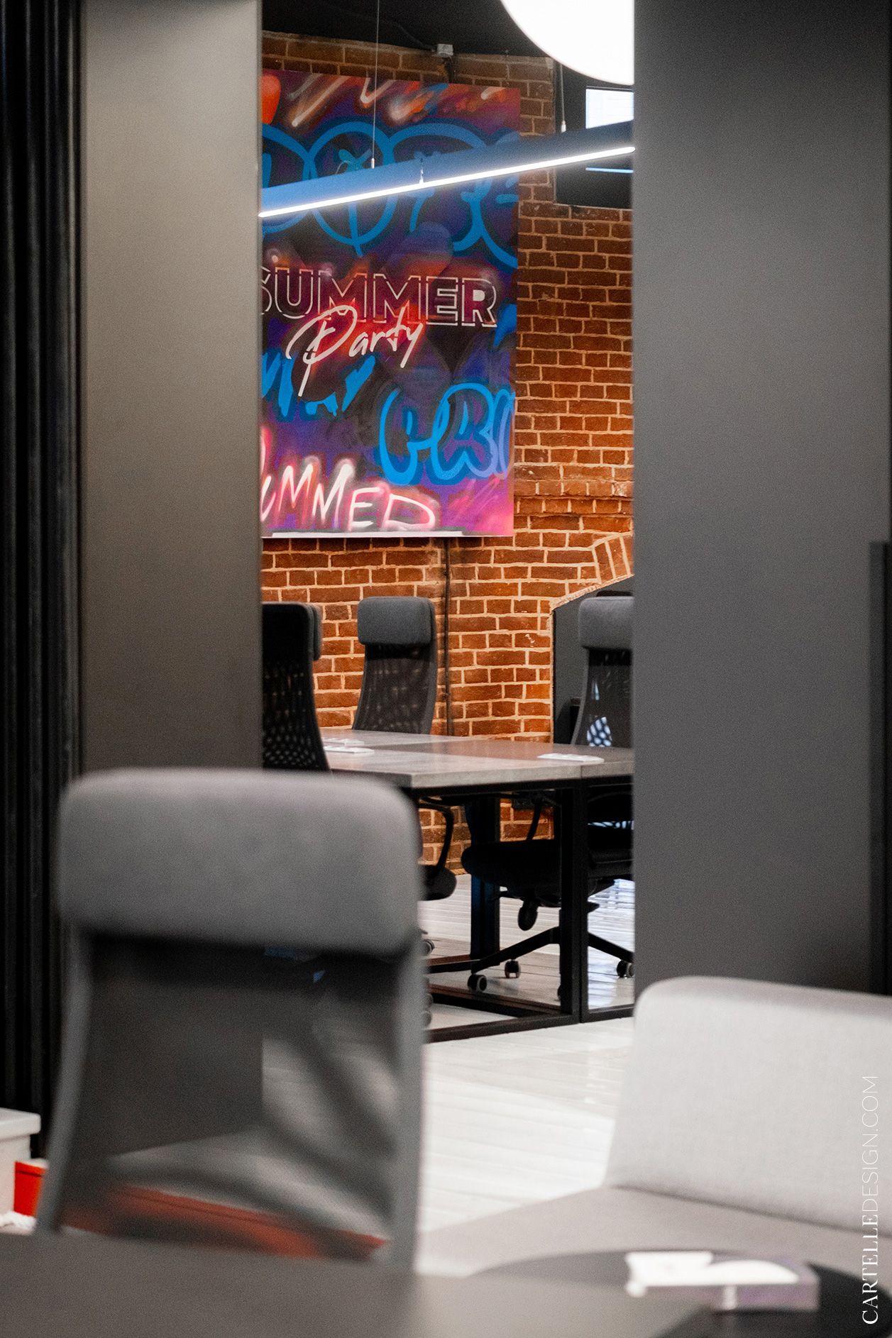 В интерьере много ярких картин, граффити, постеров и навигации. Картины и граффити заказали у художницы Анастасии Малиновской. Мы заранее обговорили тему и цвета изображений.