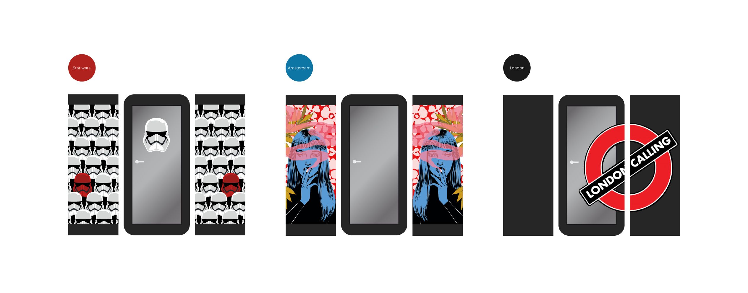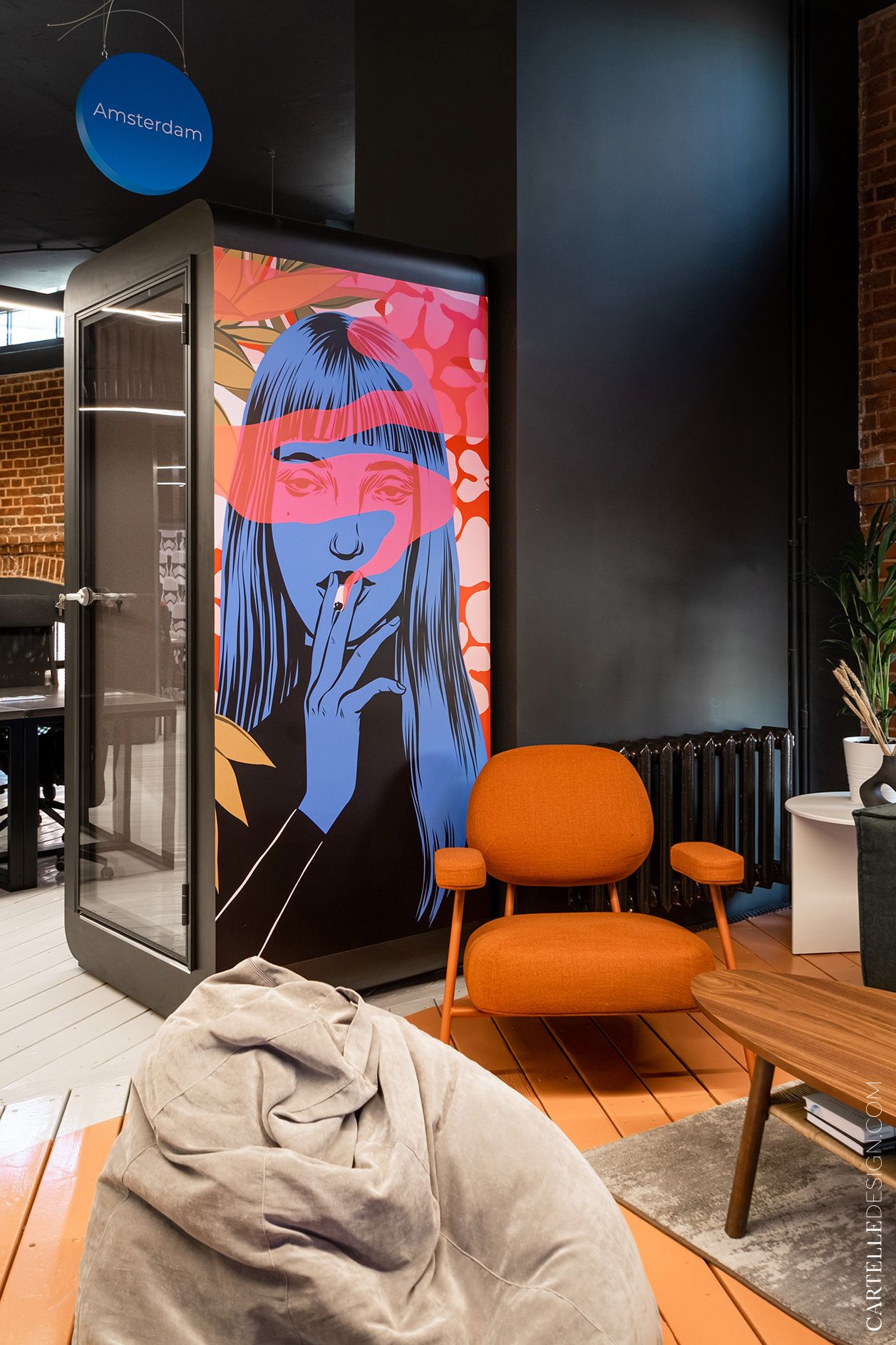 Навигацию разрабатывали сами. У каждой переговорной - свое название на круглом указателе. Для переговорных кабин разработали тематические наклейки на боковые стенки. Часть постеров выбрали мы, часть - заказчики. Общие цвета и сочетания позволили нам объединить все идеи в общий графический код.