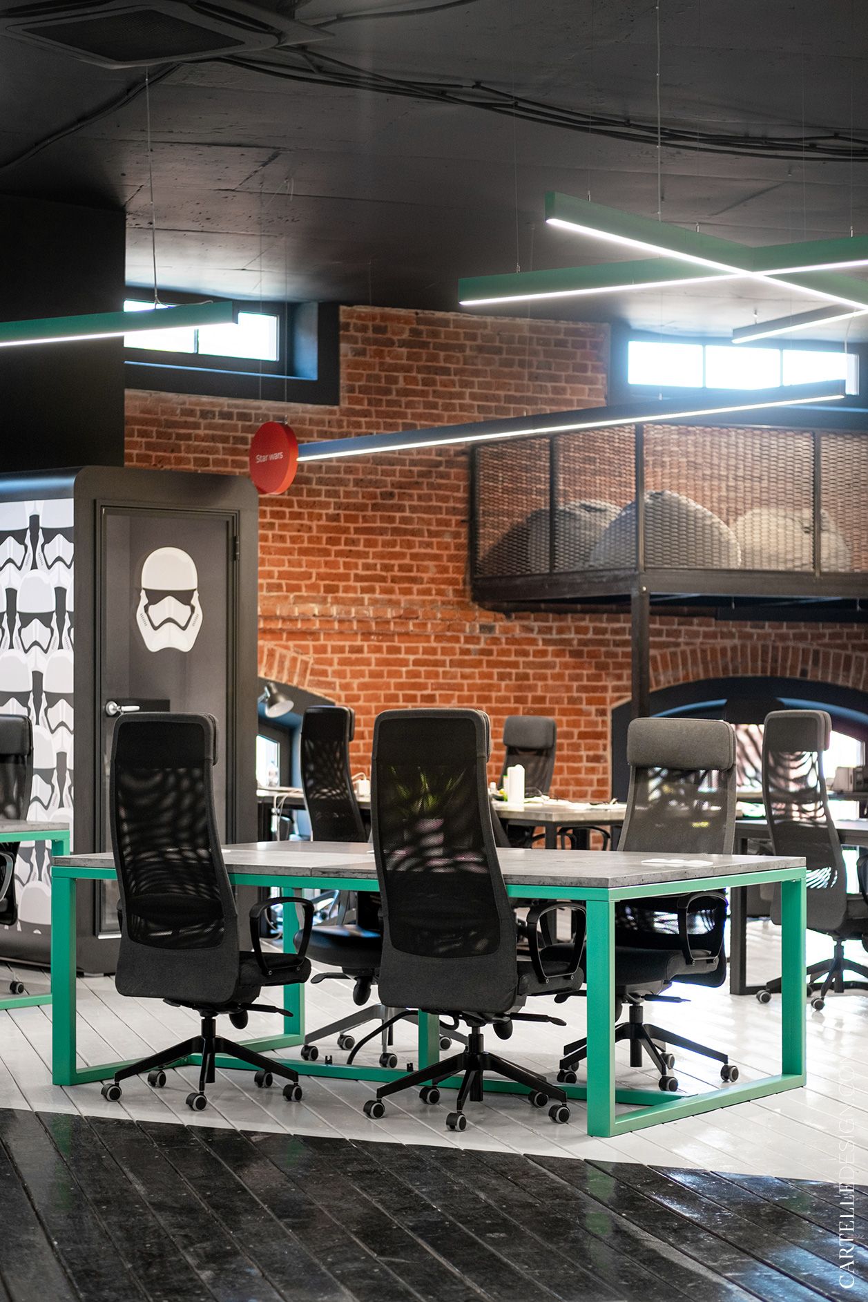 Большой open space на 66 рабочих мест разделен многофункциональной зоной meeting. В этой половине - кирпичные стены, светлый пол и зеленые акцентные столы. Столы по нашим эскизам изготовила компания Hardkea. В столы встроены розетки, они подключены через кабель канал в полу. Рабочие кресла купили в IKEA.