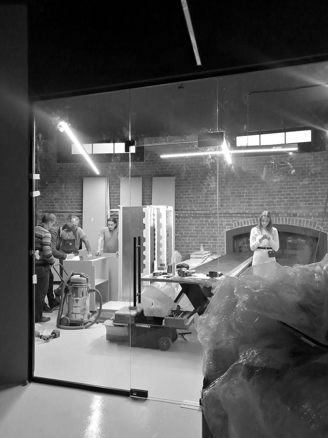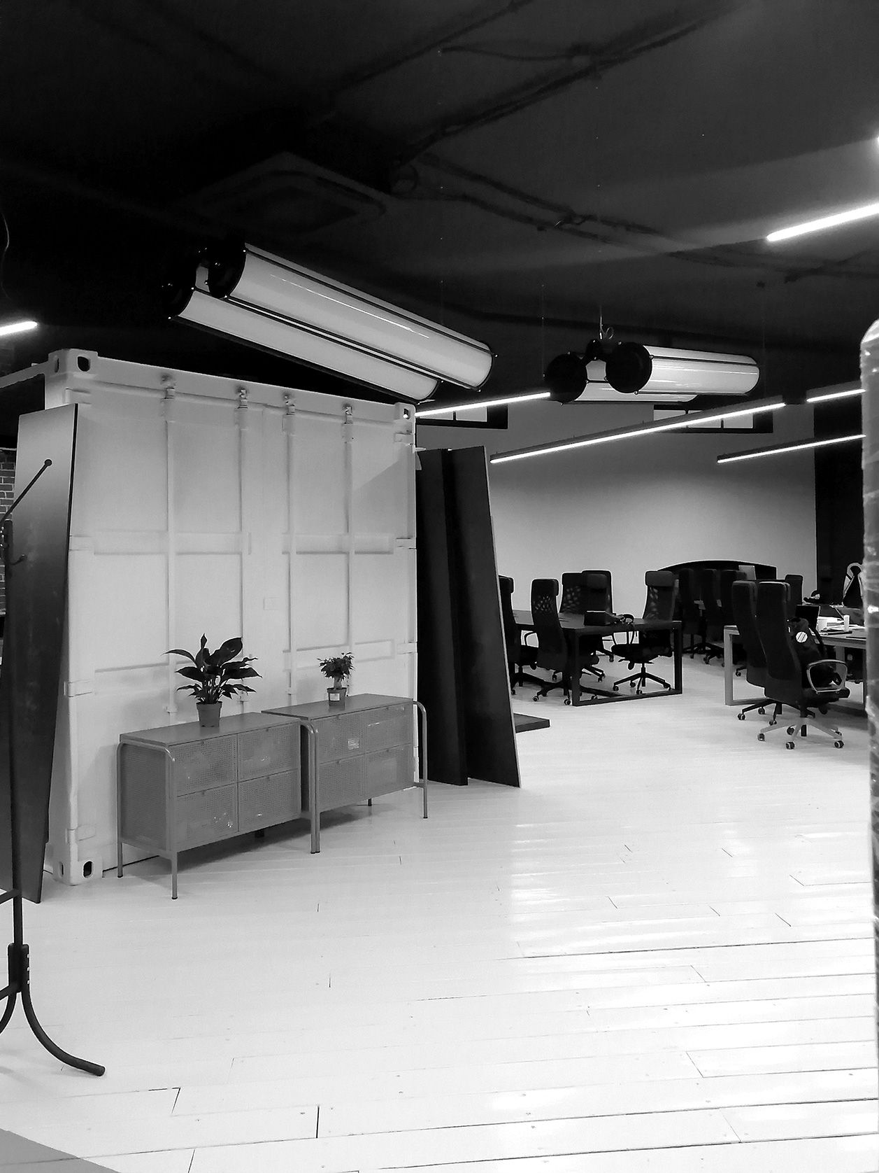 Мы разместили там мягкую группу и сделали складную звукоизоляционную перегородку с дверью. Стол в переговорной тоже складной. При необходимости, его можно собрать и организовать большое общее пространство перед экраном.