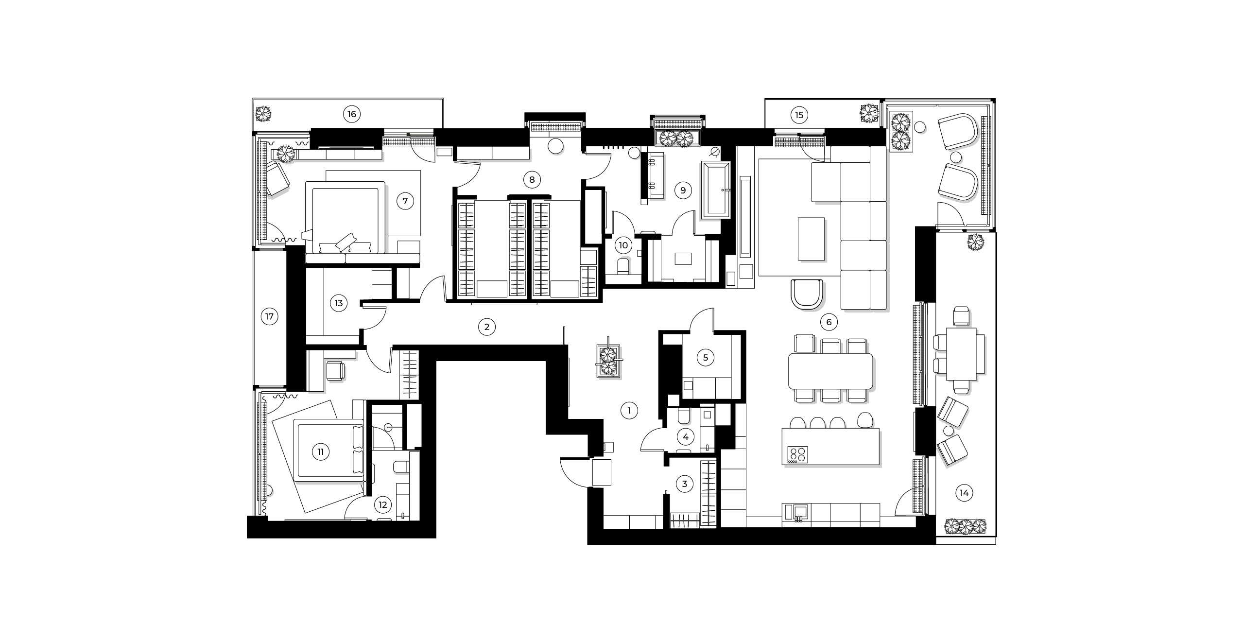 Разрабатывая планировку, мы поделили квартиру на две большие зоны. Справа от холла расположилась кухня-гостиная с эркером и террасой. В гостиной много мест, где можно провести время с друзьями - мягкая зона, зона столовой и кухня с большим островом. Также в этой части квартиры расположен гардеробная у входа, гостевой санузел и хозяйственный блок. В левой части квартиры - единая пространство мастер-спальни, гардеробной и ванной комнаты; спальня для гостей со своей ванной комнатой и кладовка.