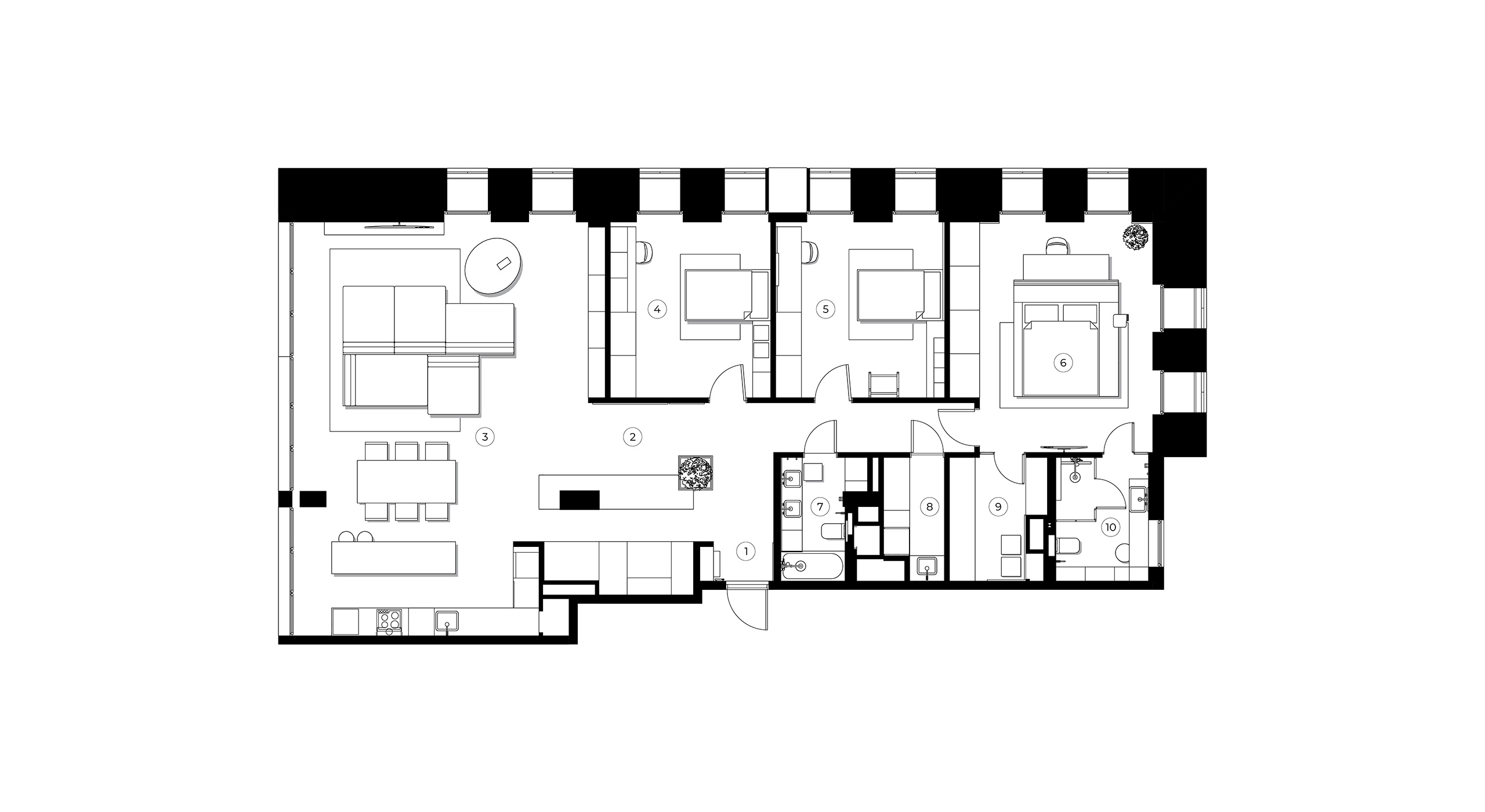 Планировка поделила квартиру на две зоны. Общее пространство прихожей, кухни и гостиной - самое удачное решение этого проекта. Наиболее выигрышно оно смотрится благодаря ленточному остеклению и высоким потолкам. Центр этой зоны - дерево рядом со скамьей, символизирующее семью. В приватной части квартиры расположилась единая зона мастер-спальни, гардеробной и душевой, две детские комнаты, ванная и прачечная.