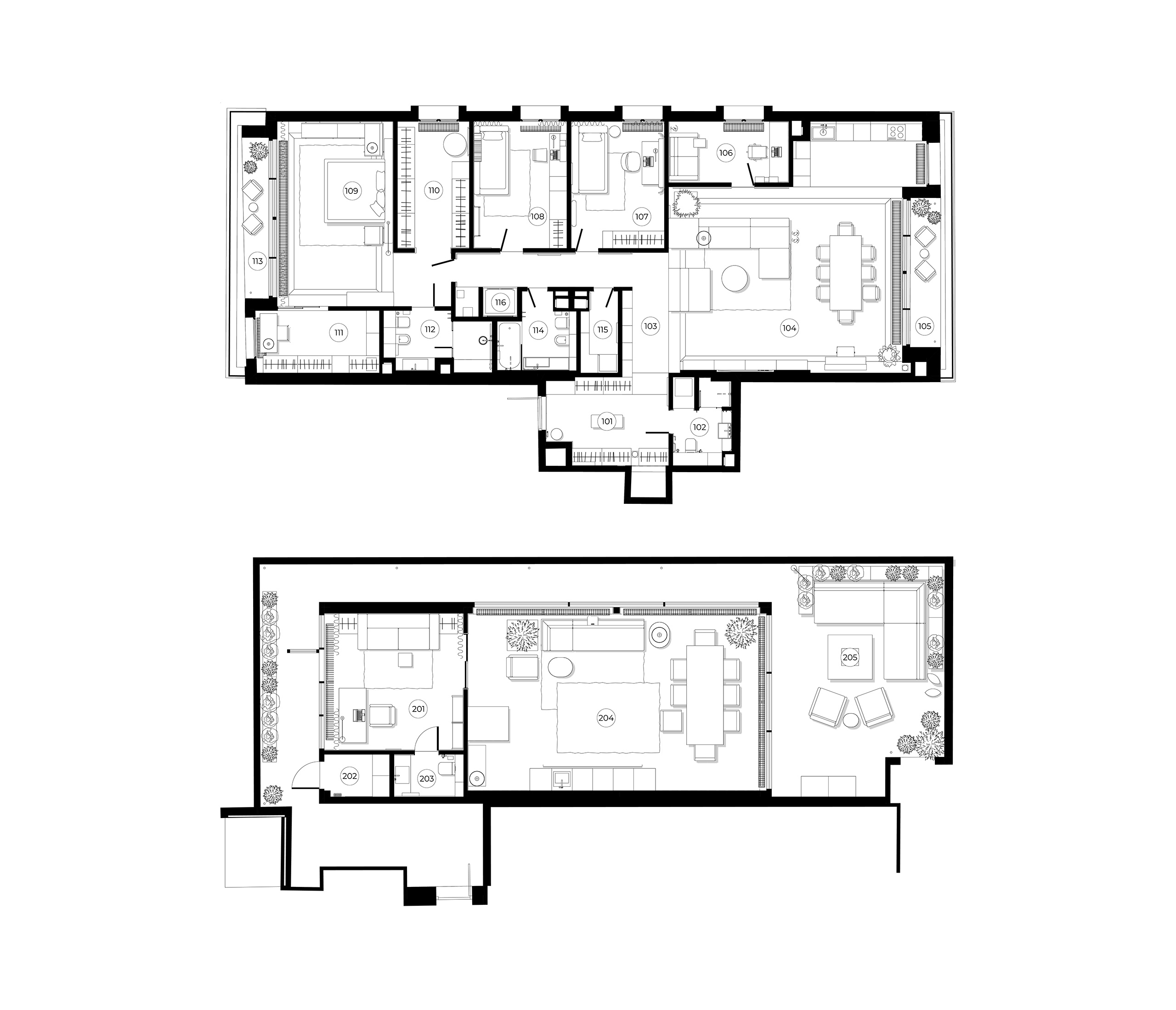 План прост и логичен: жизнь кипит на первом этаже, где разместилась с кухня-гостиная и приватная зона со спальнями; второй почти целиком отдан под террасы - и остекленную, и открытую.