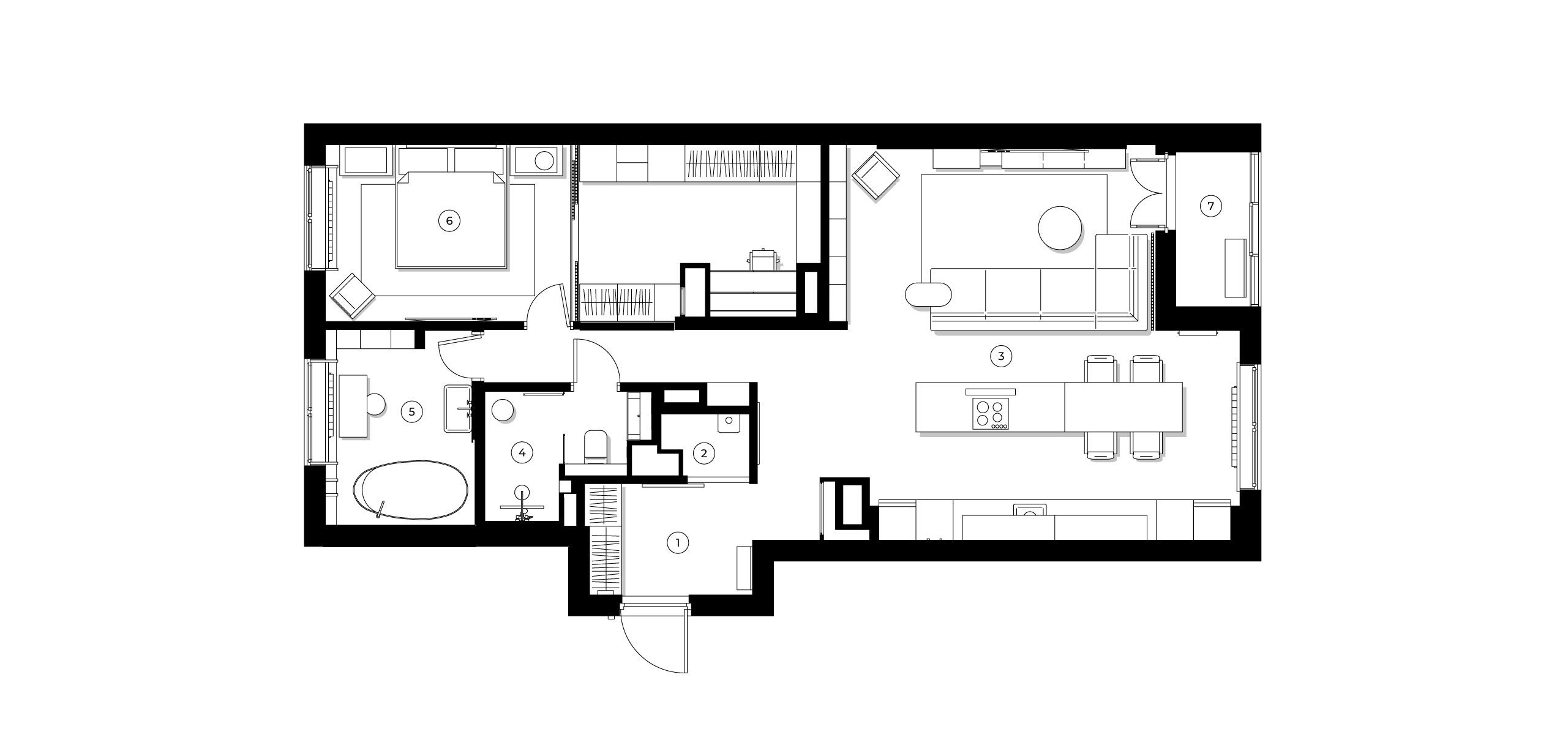 Хозяйка квартиры любит готовить, и попросила спроектировать кухню так, чтобы во время приготовления еды можно было смотреть телевизор. Мы постарались создать удобный и вместительный кухонных гарнитур, дополнив его большим островом с варочной поверхностью и встроенной вытяжкой. Остров переходит в обеденный стол на 4 человека. Напротив кухни - зона гостиной с большим модульным диваном и TV.