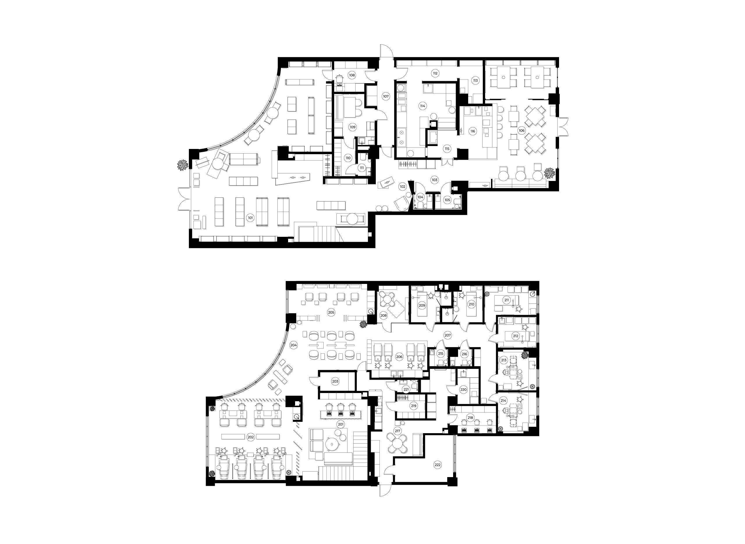 Второй этаж занимает салон красоты, косметологические кабинеты спа. Там повторяется контраст темного и светлого, грубого и идеального. Переосмысление природных форм и традиционных мотивов Грузии в использование очень нестандартной мебели и предметов. Использование локальных отделочных материалов и обращение к местным ремесленным мастерским.