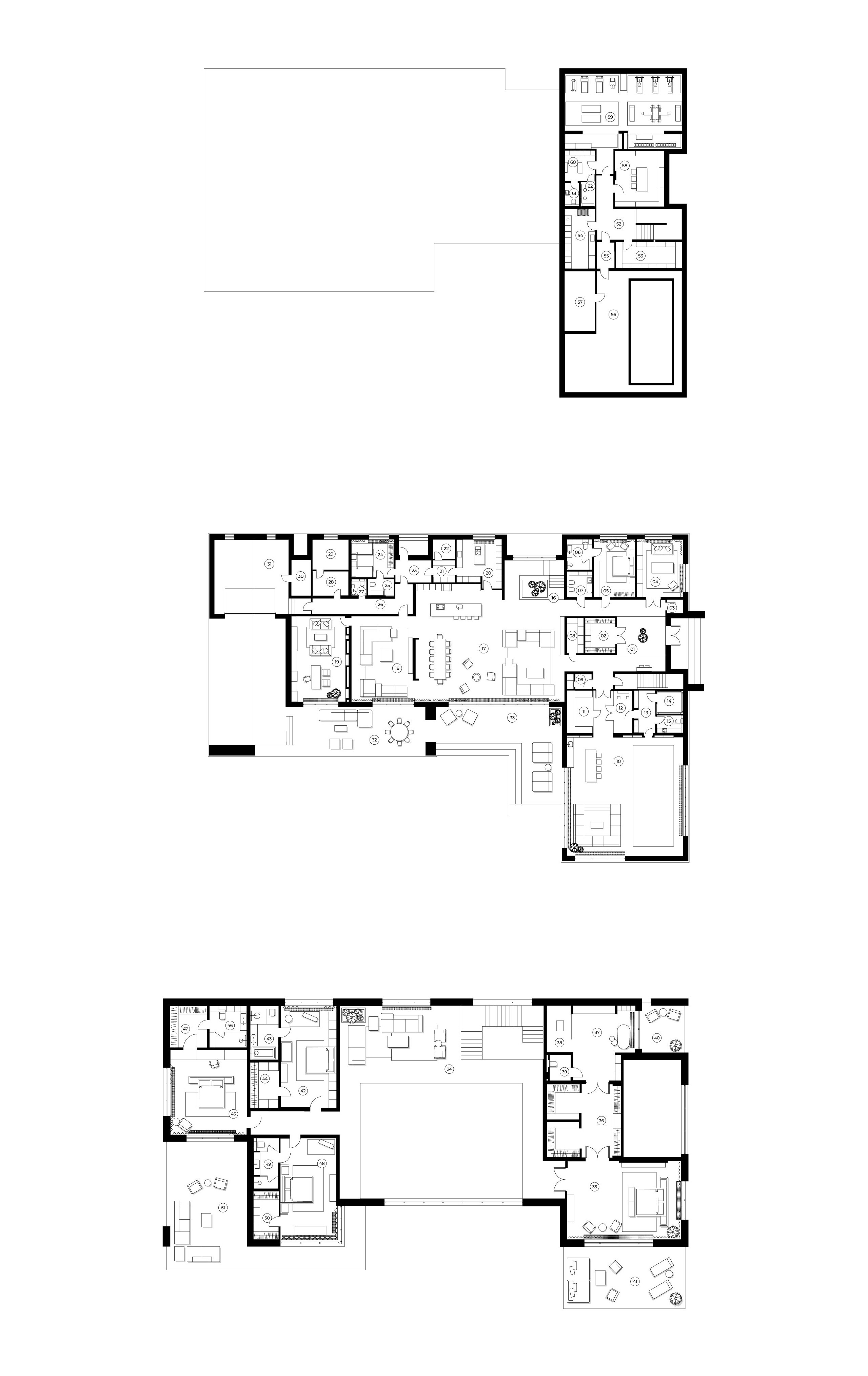 Семья часто принимает гостей, и нам необходимо было сделать много комфортных мягких зон. Главное помещение в доме - это просторная кухня-гостиная со вторых светом. В помещение большое панорамное окно, которое делает экстерьер частью гостиной. Мы использовали отделку, которая поддерживает внешнюю часть дома и окружение: деревянные панели, грубый камень, много растений. В гостиной две большие мягкие зоны, стол на 10 персон и кухня с мраморным островом. Мастер-спальня занимает все правое крыло дома. В едином приватном пространстве расположена спальня, двойная гардеробная, ванная комната и терраса. В интерьере спальни повторяются те же мотивы - глубокие цвета, дерево и растения. Во втором крыле дома - три детских комнаты, каждая со своей гардеробной и ванной комнатой. Еще одна гостевая спальня расположена на первом этаже.