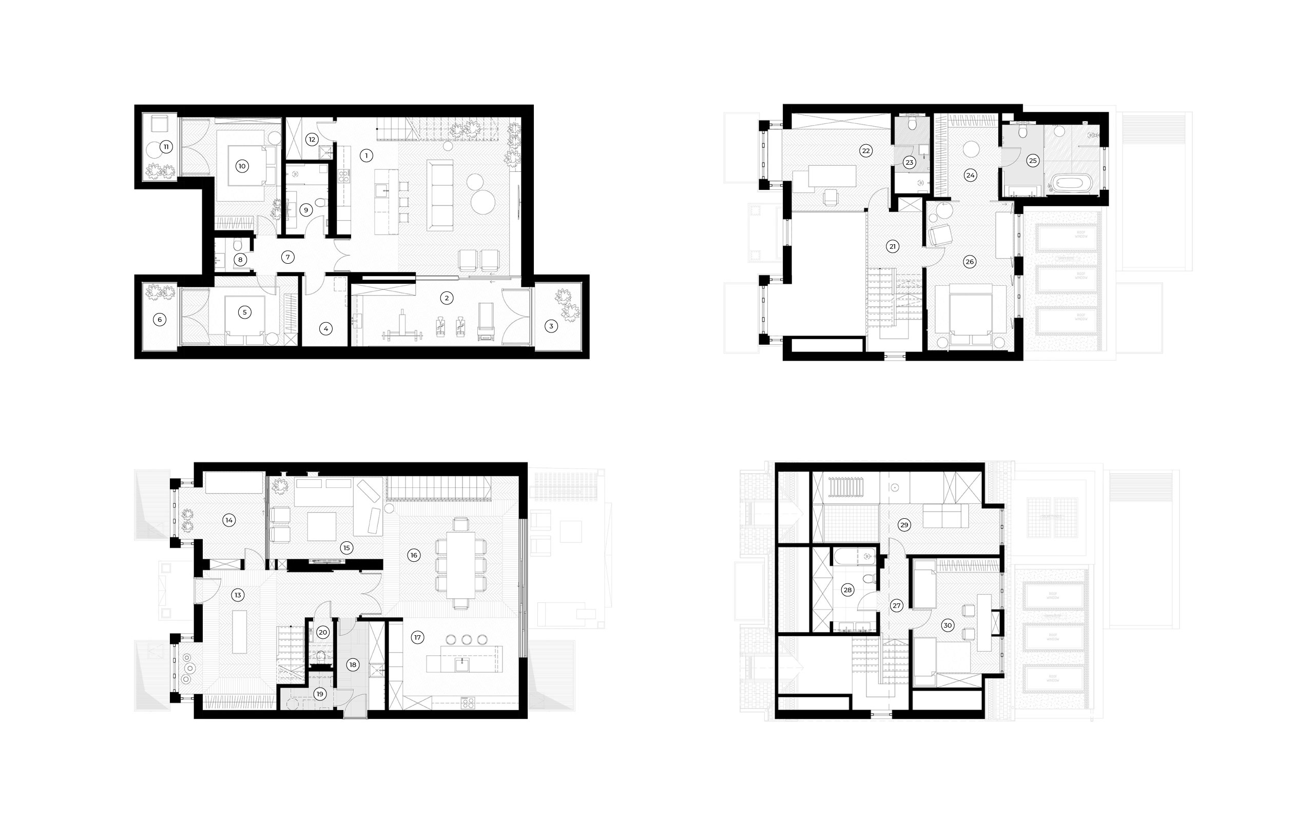 На первом этаже разместили прихожую, просторную гостиную с кухней и столовой. Помещение получилось очень светлым благодаря панорамным окнам, выходящим в сад и световым люкам на потолке. На втором этаже - приватная зона с кабинетом и спальней. Третий этаж - детская зона. Цокольный этаж - гостевая зона. Там разместилось две гостевых спальни, кухня-гостиная и тренажерный зал.