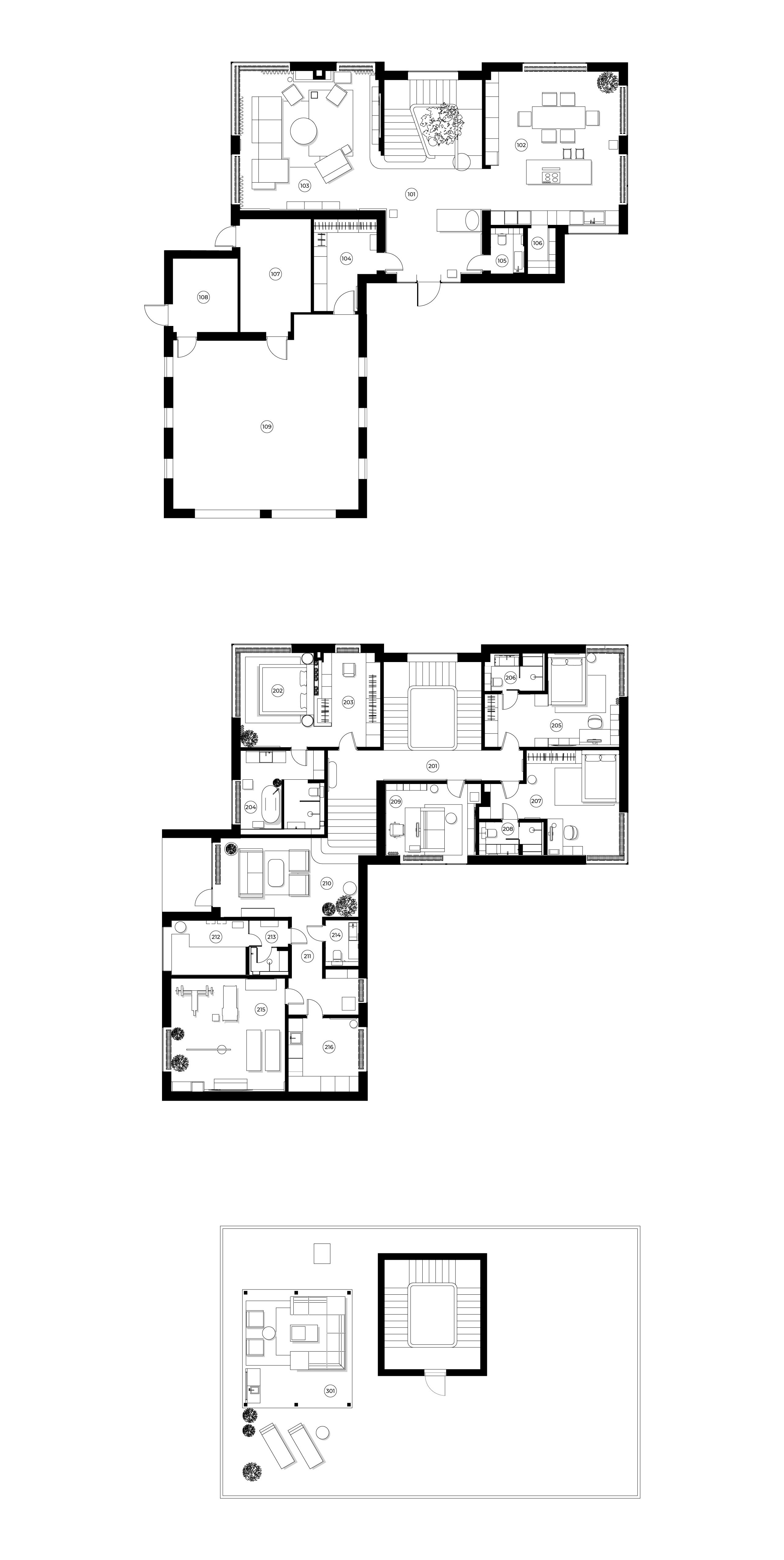Восхождение по лестнице завершается стеклянным кубом на крыше дома, откуда можно выйти на открытую террасу с захватывающим видом на окружающий лес. Это ключевая обзорная точка - вершина башни. Дом сформировался как живой организм, меняясь вместе с интерьером: где-то мы корректировали конструкцию, где-то - конструкция диктовала нам решения. В результате этого взаимного влияния создался проект, который, надеемся, станет прекрасным пространством для вдохновенной и созидательной жизни.