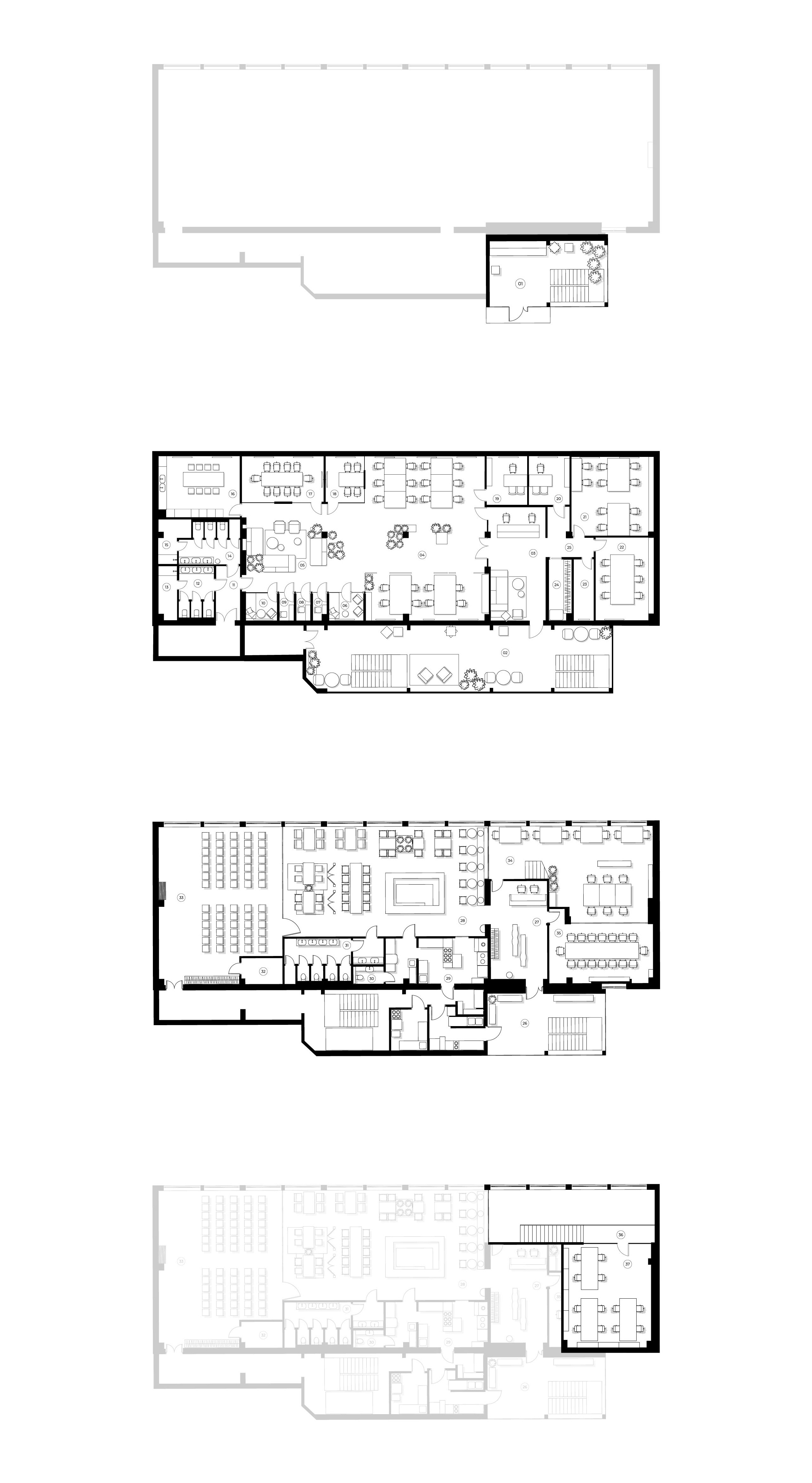 Обещанная интересная история про пристройку. Мы уже закончили проект и приступили к реализации, когда нам позвонил Шамиль (менеджер проекта) и сказал, что заказчик хочет сделать со стороны двора четырехэтажную пристройку. Как нам рассказал позже Шамиль, пристройки это главная национальная архитектурная особенность региона. Местные жители пристраивают себе целые новые комнаты к квартирам в панельных домах. Пришлось спешно вносить изменения в проект. Но наша пристройка решила несколько проблем: красивая входная группа в коворкинг, дополнительная площадь за счет переноса туда лестницы, дополнительная площадь для служебных помещений гастробара (кухни, склада). На момент фотосъемки не все помещения пристройки были доделаны, общую задумку можно оценить по коллажам.